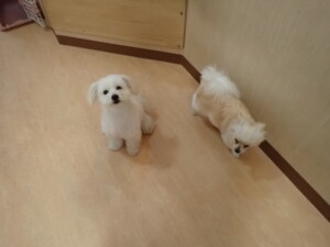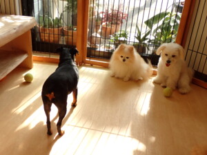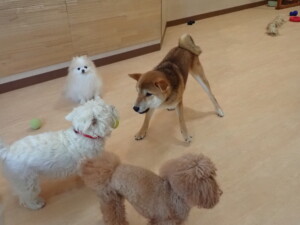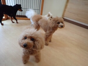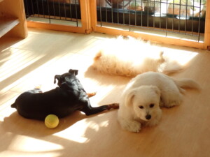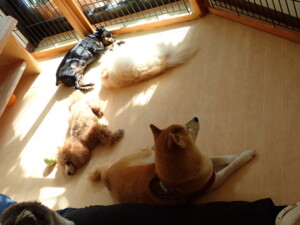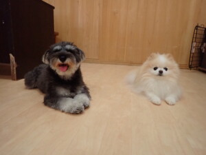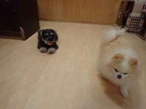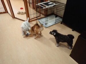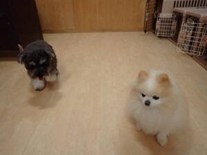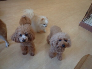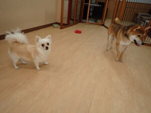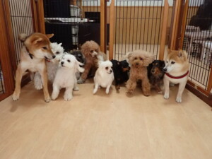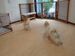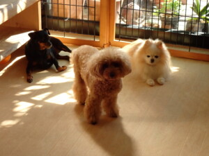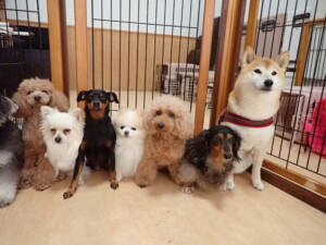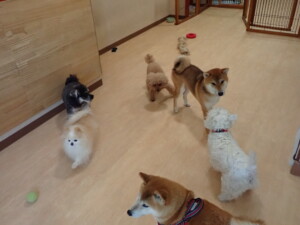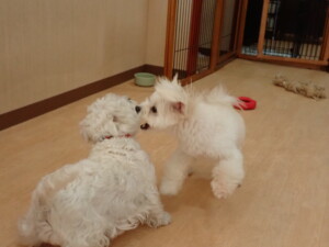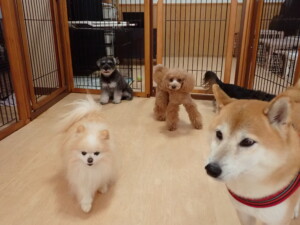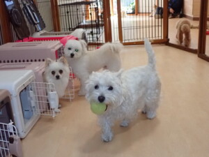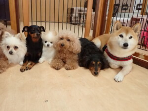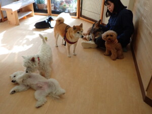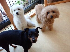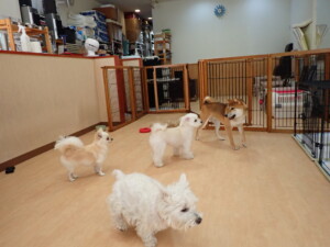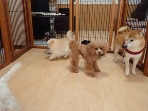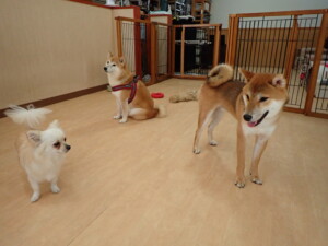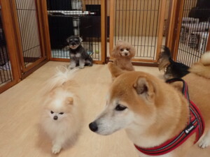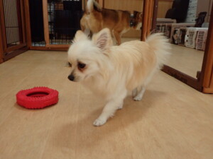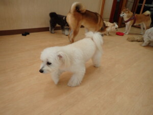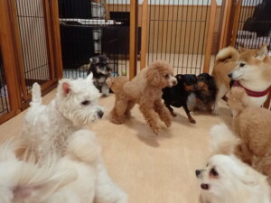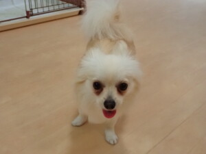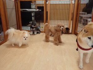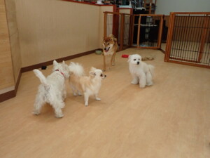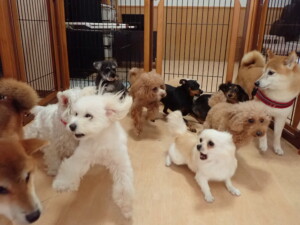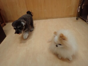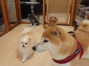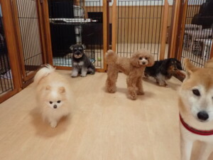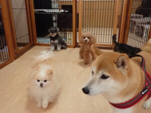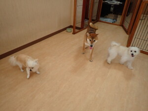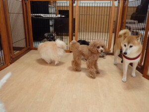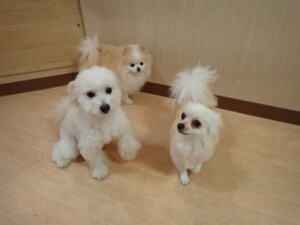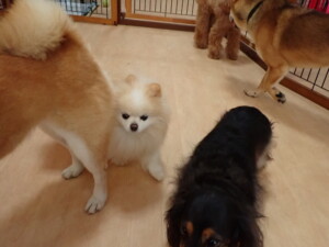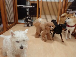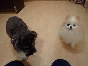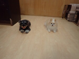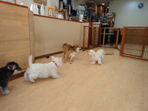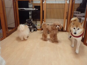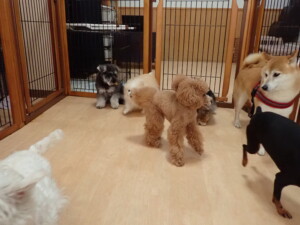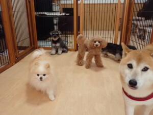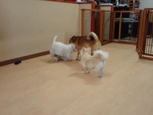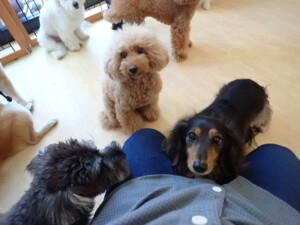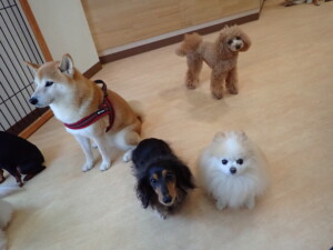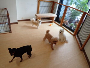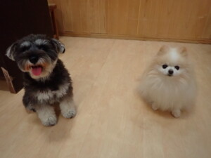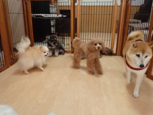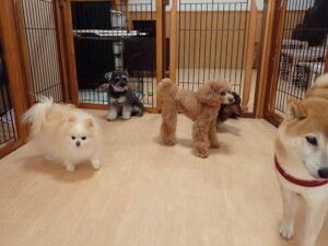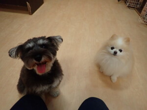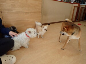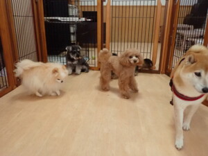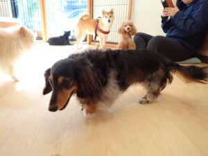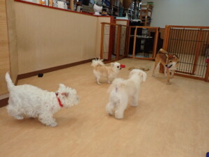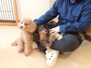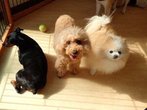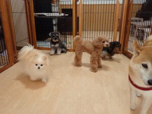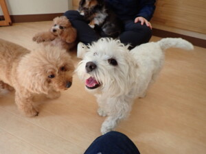 ミルちゃん、モコ君、ソナちゃん、むぎ君、元気に遊んでいました。まりもちゃん、ピピリーニちゃん、ダックスフントのモモちゃん、ミニチュアシュナウザーのももちゃん、こころちゃん、落ち着いて過ごしていました。ミニチュアシュナウザーのももちゃん、「お座り」・「フセ」・「マテ」・「オイデ」の練習をしました。