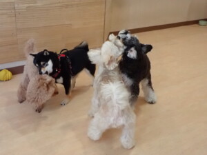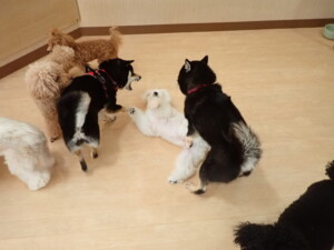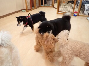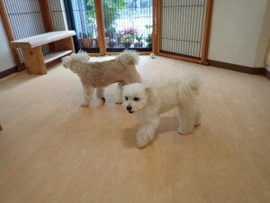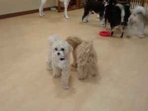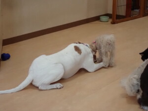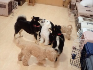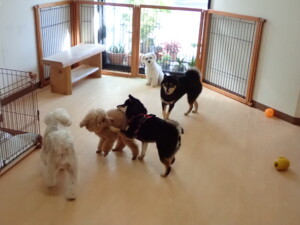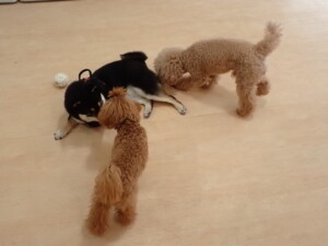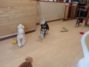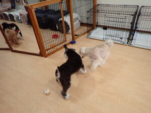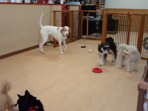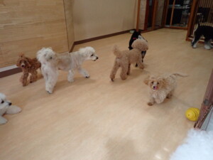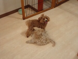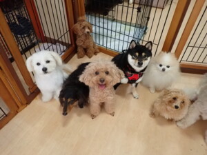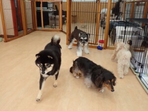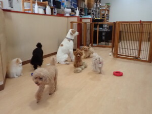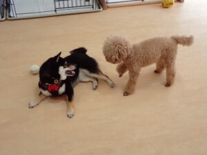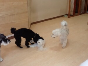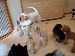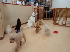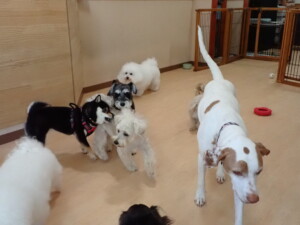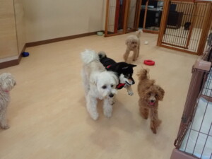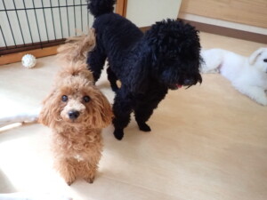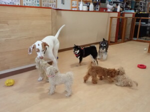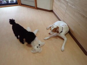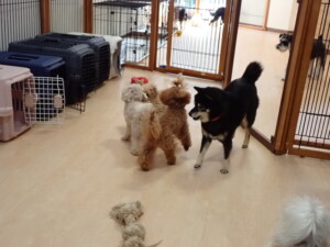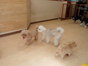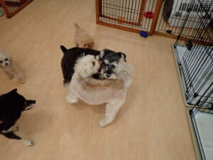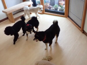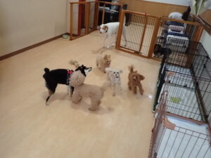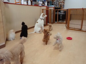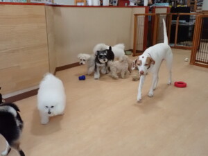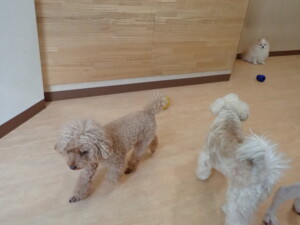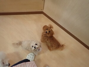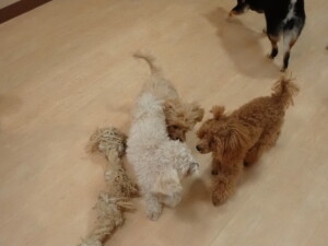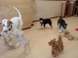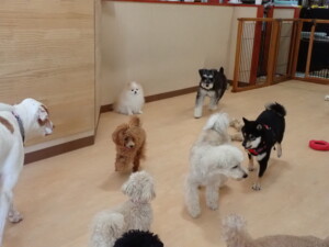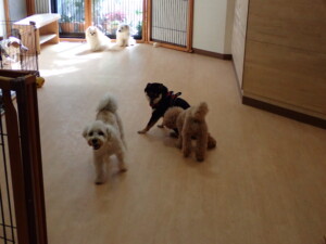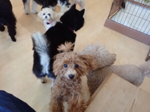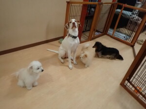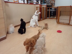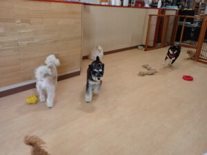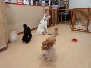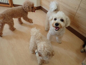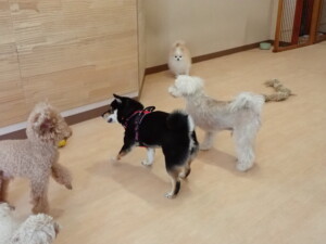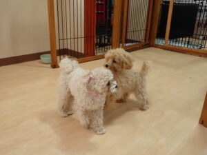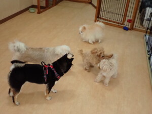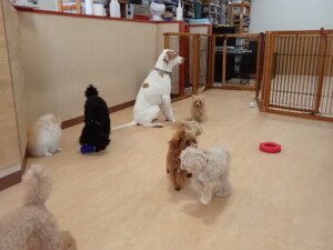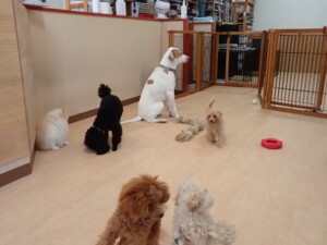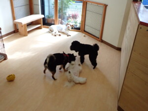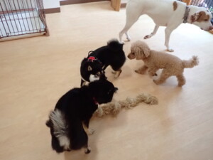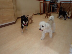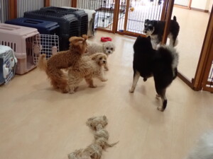 モモちゃんとポーちゃん、落ち着いて過ごしていました。アビーちゃん、モコ君、アメリちゃん、ブブ君、こげ茶君、スズちゃん、アレックス君、ジャズ君、ちいこちゃん、こまちゃんポコ君、ルイ君、元気に遊んでいました。ポコ君とルイ君、「お座り」・「フセ」・「マテ」の練習をしました。