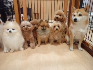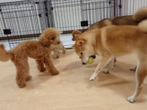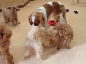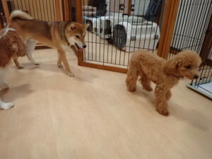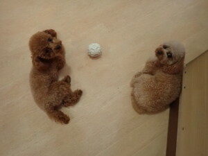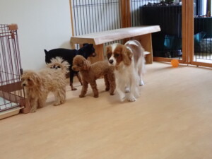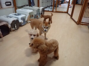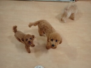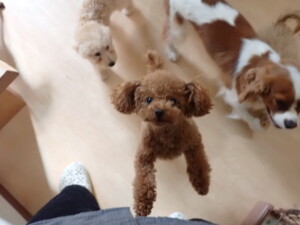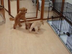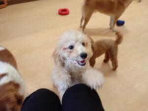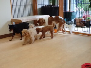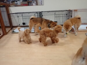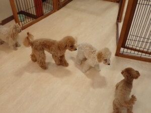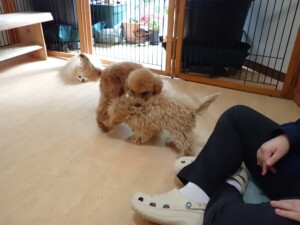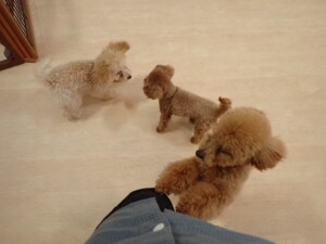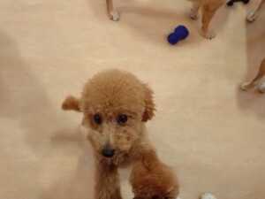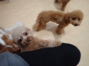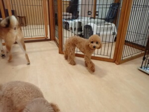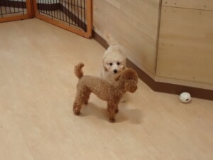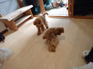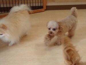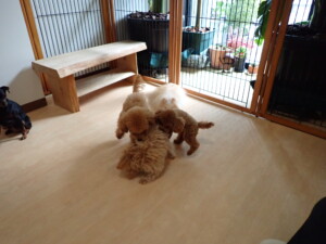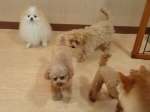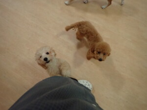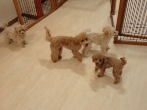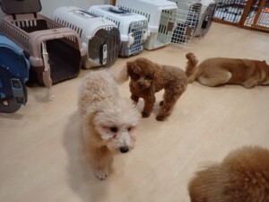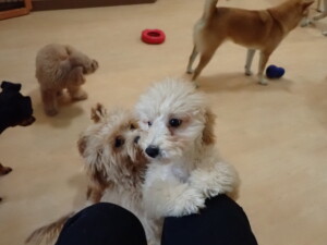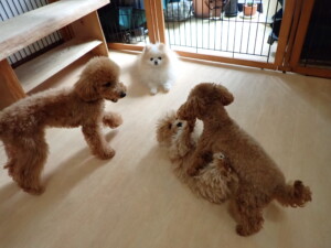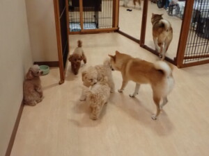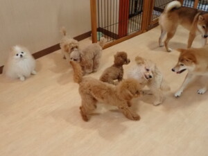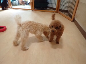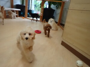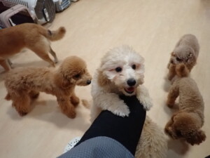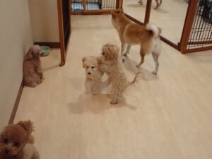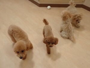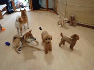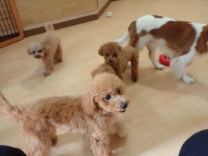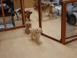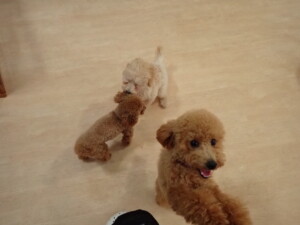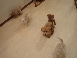 今日はチャロちゃん、ジュン君、あずきちゃん、だんご君、ピピリーニちゃん、むぎ君、たっくす君、が遊びに来てくれました。そして、ポコ君とメリイちゃんがトレーニングに来てくれました。今日からトレーニングを始めるひまわり君も来てくれました。もうすぐ4ヶ月になるトイプードルの男の子です。