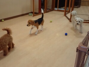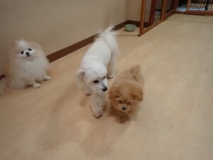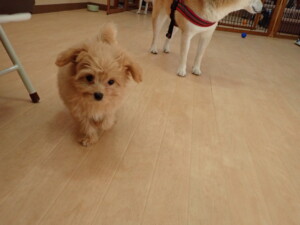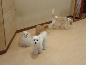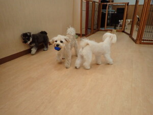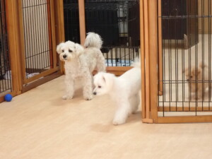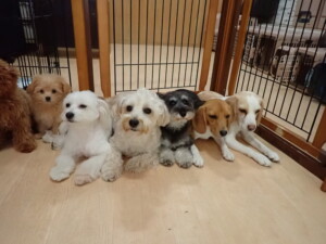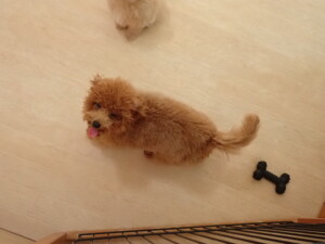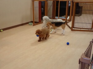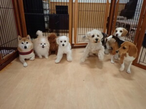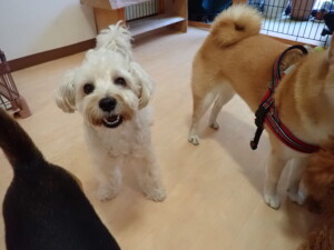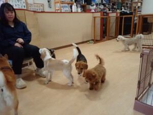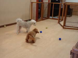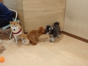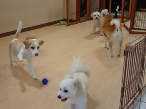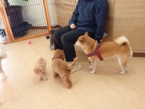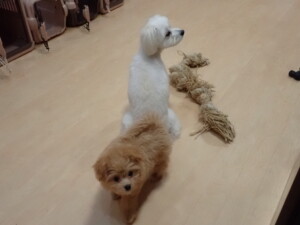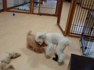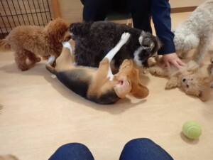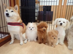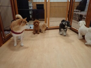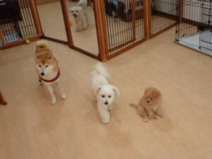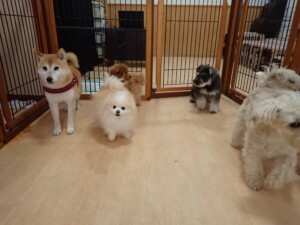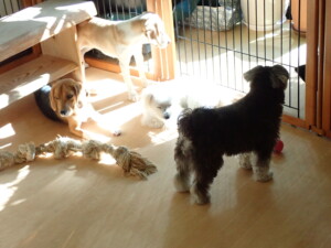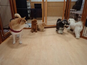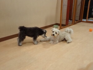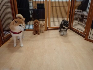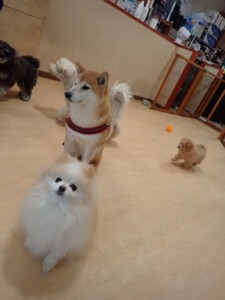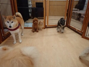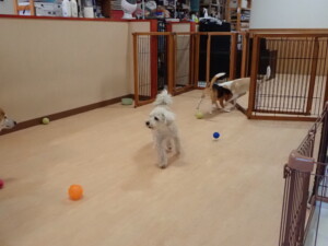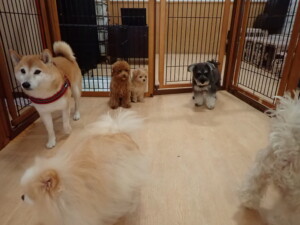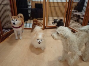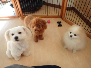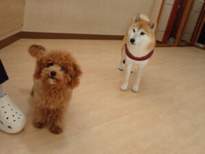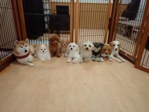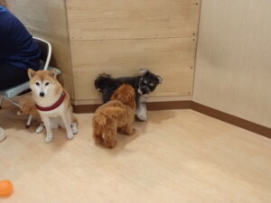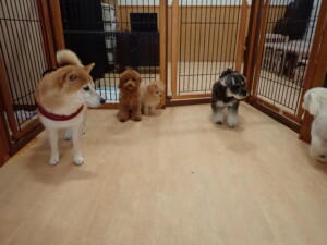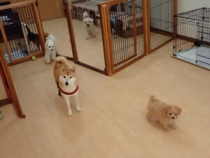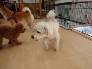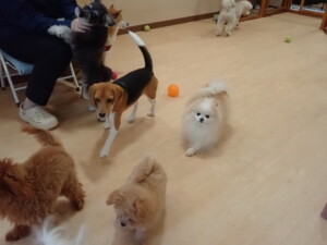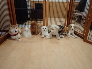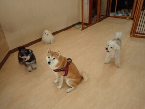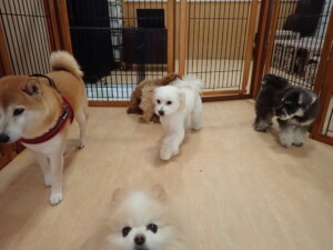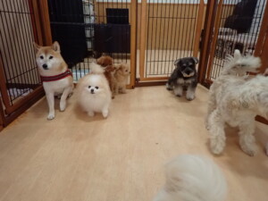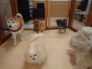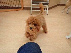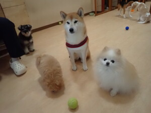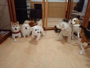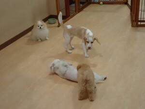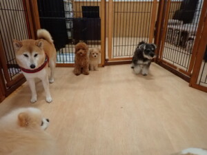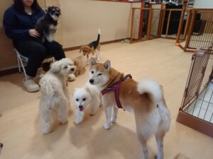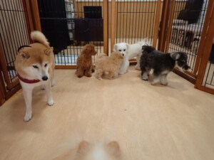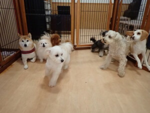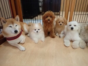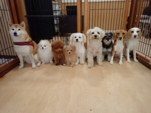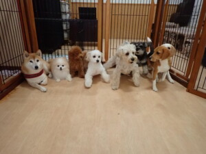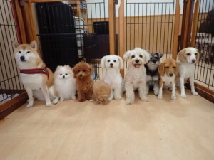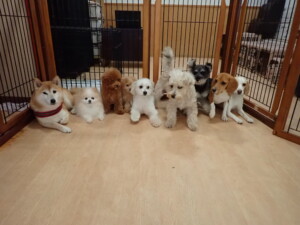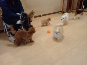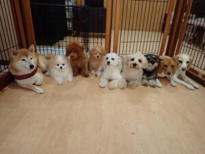MIX犬のモコ君、グーちゃん、はな子ちゃん、こげ茶君、ぴのちゃん、こげ茶君、トイプードルのモコ君、モモちゃん、元気に遊んでいました。こころちゃん、落ち着いて過ごしていました。ぴのちゃんとトイプードルのモコ君、「お座り」・「マテ」の練習をしました。モモちゃん、「お座り」・「フセ」・「マテ」・「オイデ」の練習をしました。