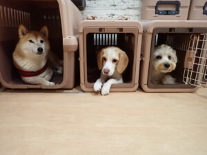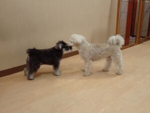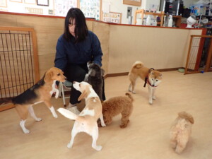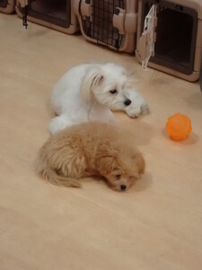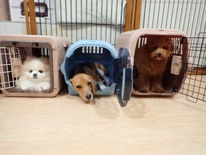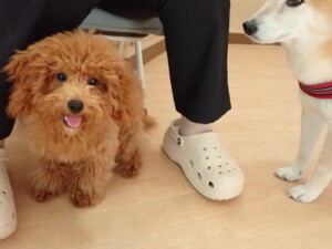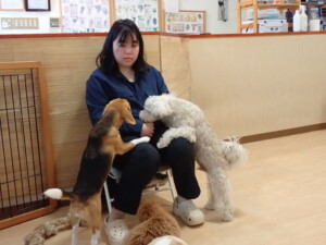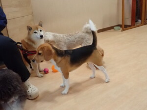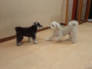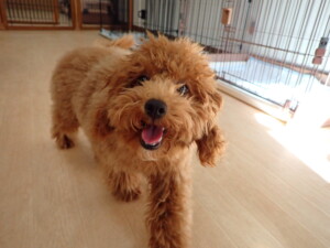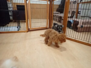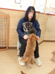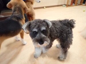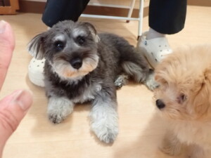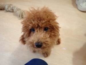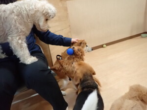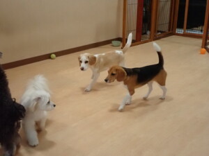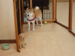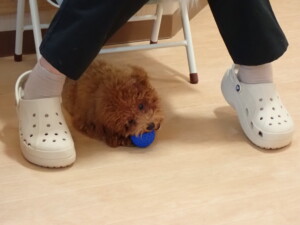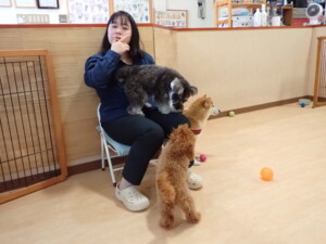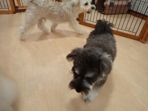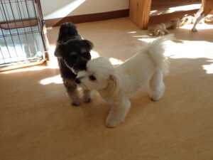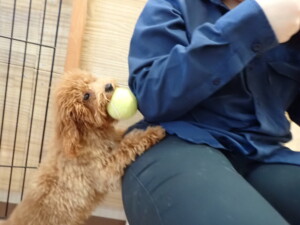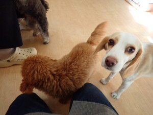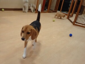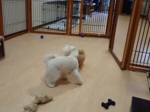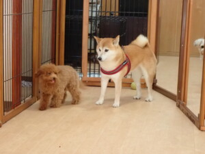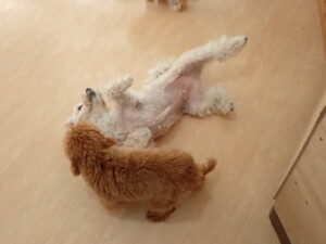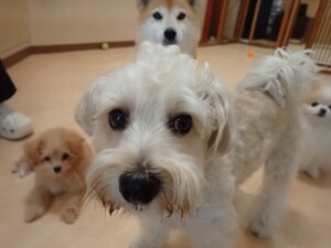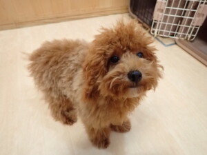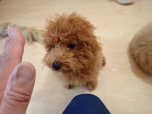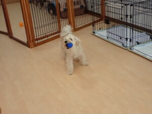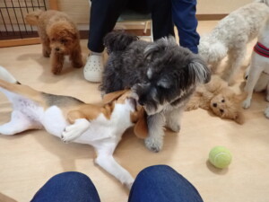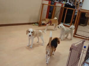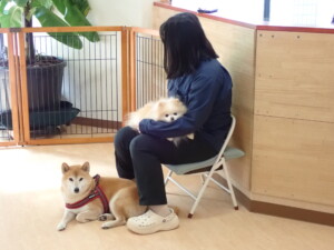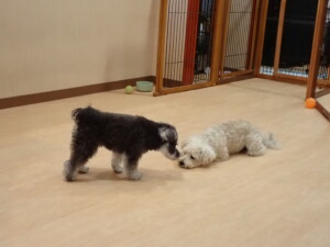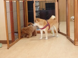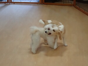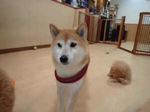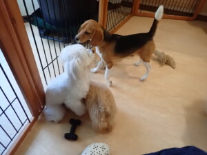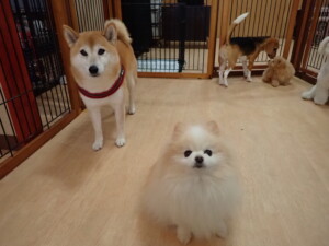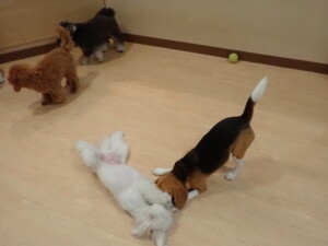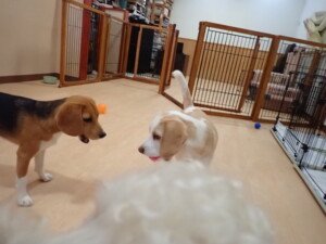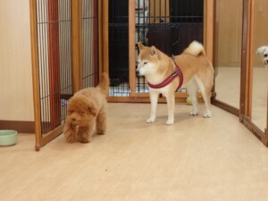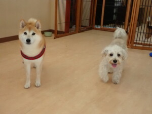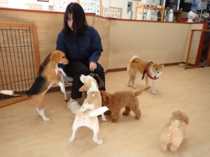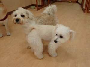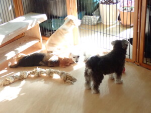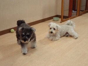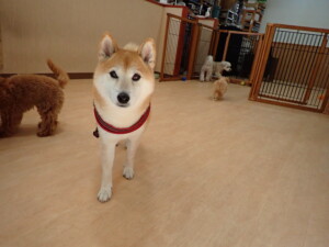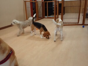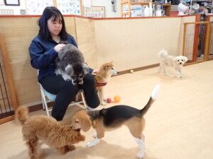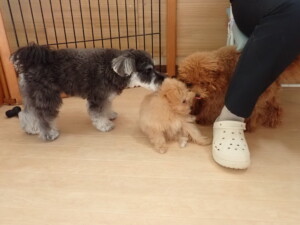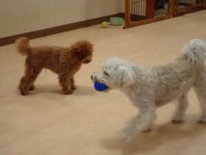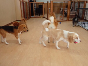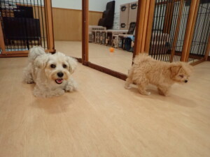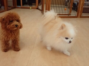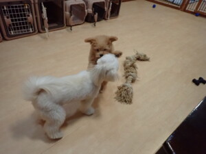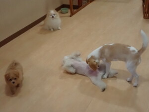 MIX犬のモコ君、グーちゃん、はな子ちゃん、こげ茶君、ぴのちゃん、こげ茶君、トイプードルのモコ君、モモちゃん、元気に遊んでいました。こころちゃん、落ち着いて過ごしていました。ぴのちゃんとトイプードルのモコ君、「お座り」・「マテ」の練習をしました。モモちゃん、「お座り」・「フセ」・「マテ」・「オイデ」の練習をしました。