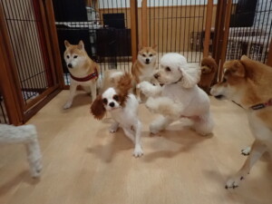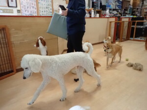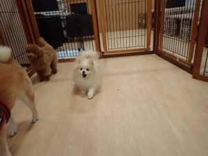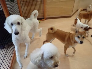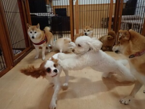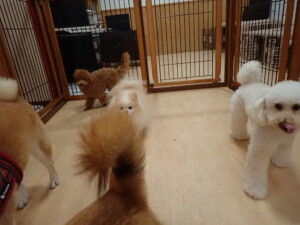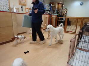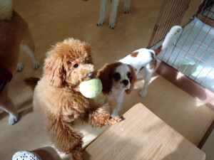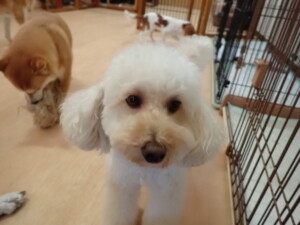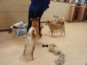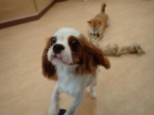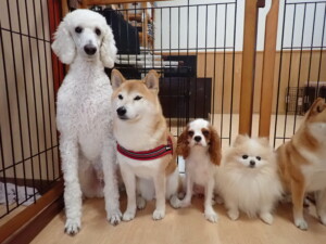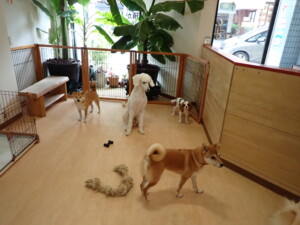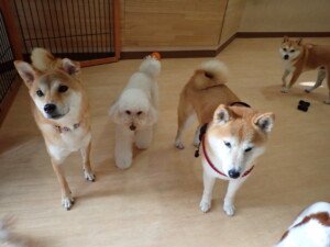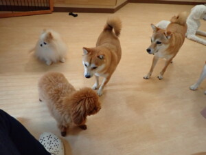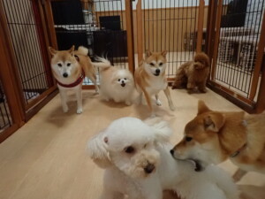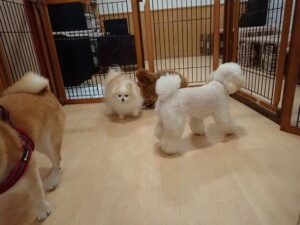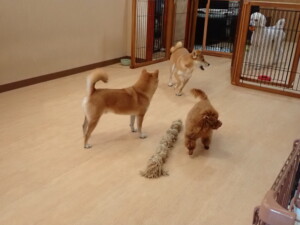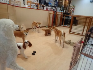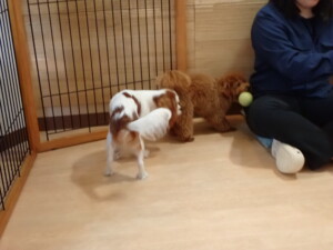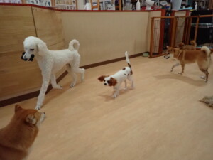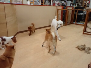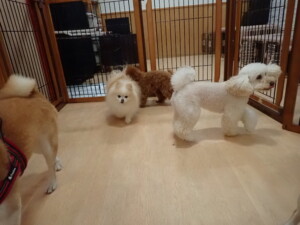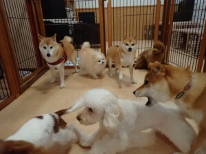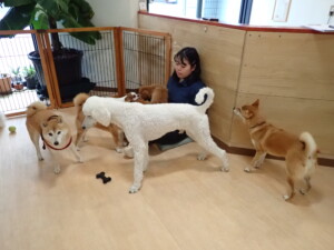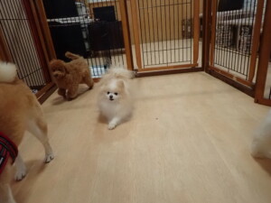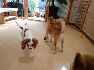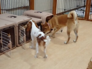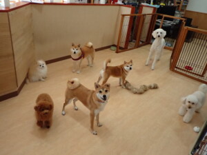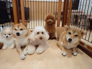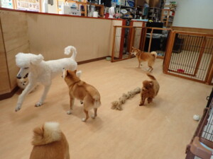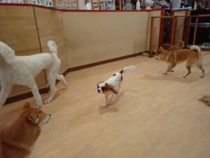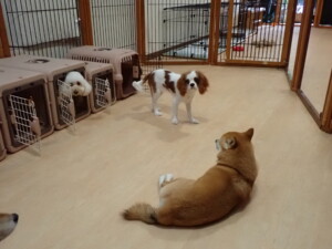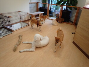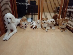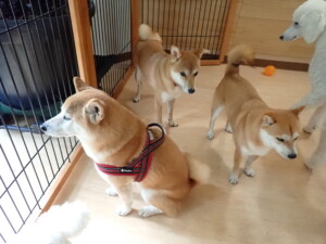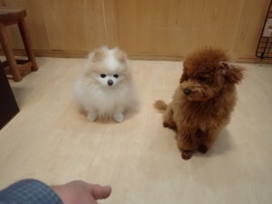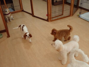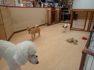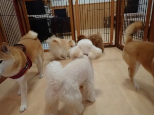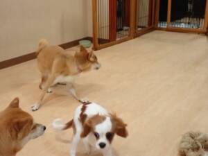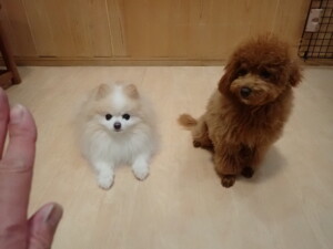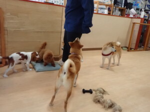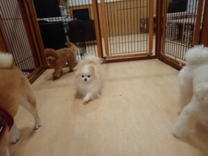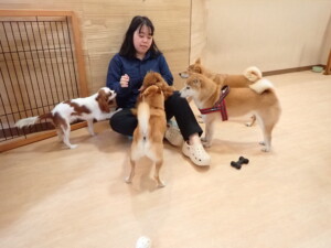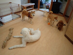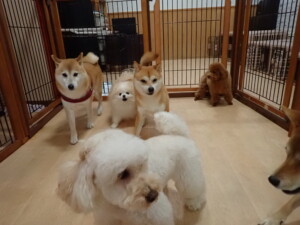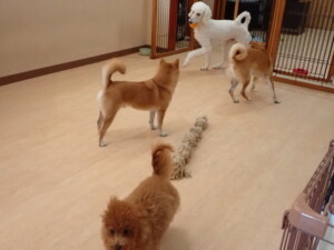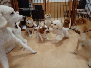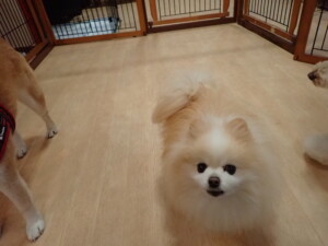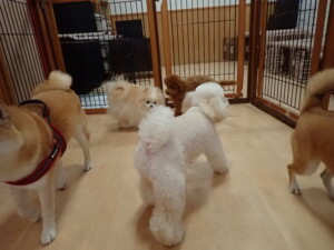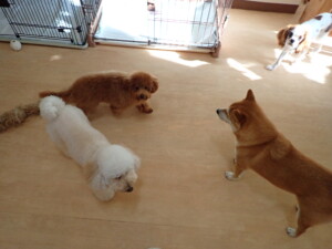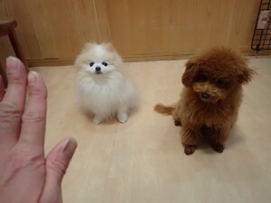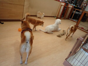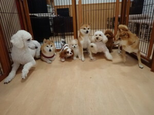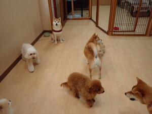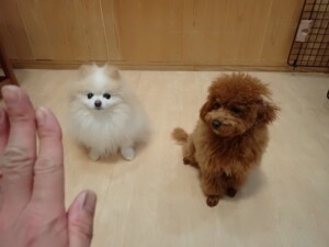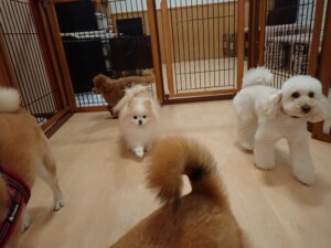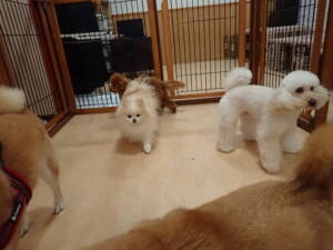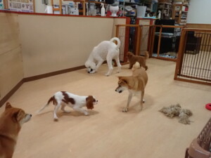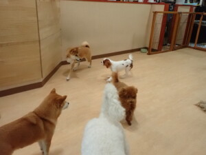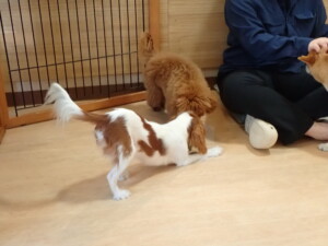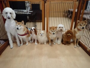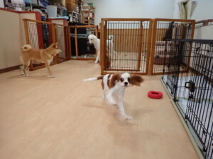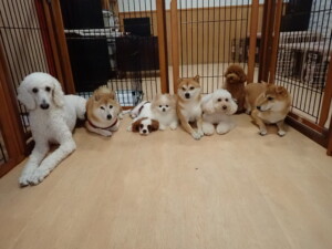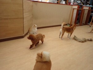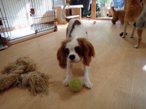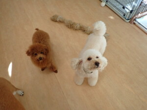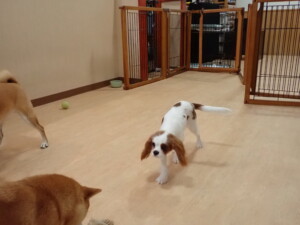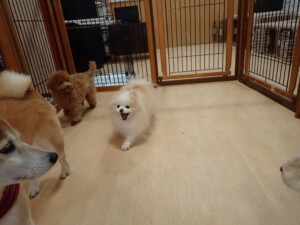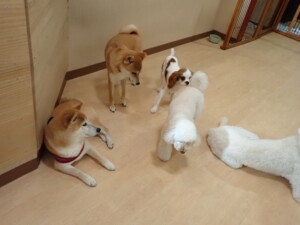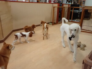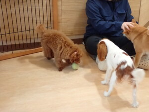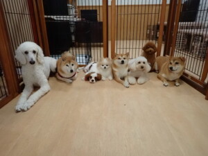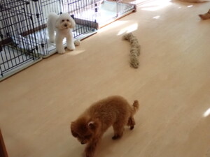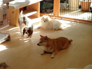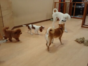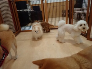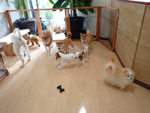 モモちゃんとこころちゃん、落ち着いて過ごしていました。ふじまる君、だんご君、ハルちゃん、モコ君、ミアちゃん、元気に遊んでいました。モコ君、「お座り」・「マテ」の練習をしました。ミアちゃん、「お座り・「フセ」・「マテ」・「オイデ」・「ハウス」の練習をしました。