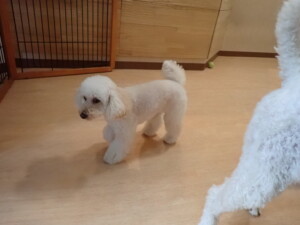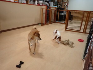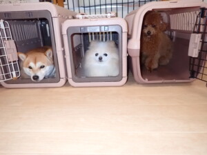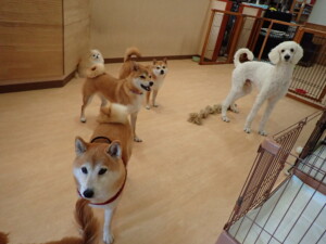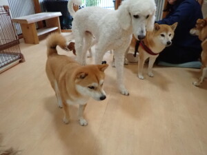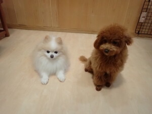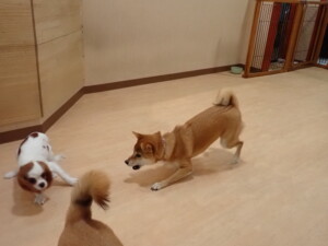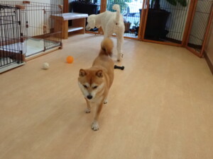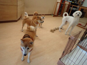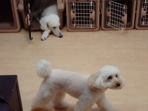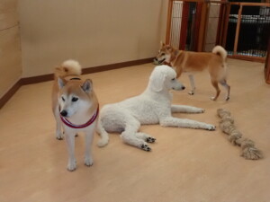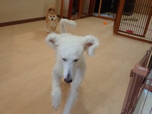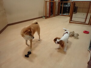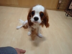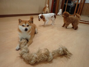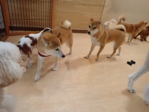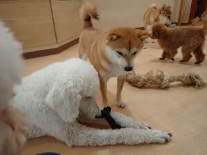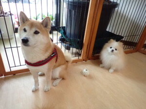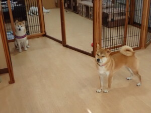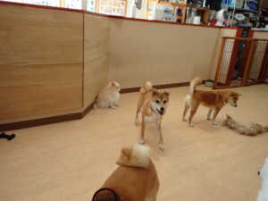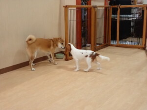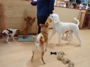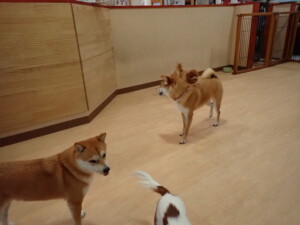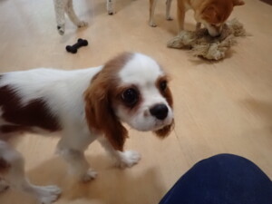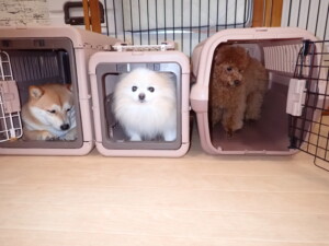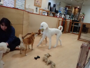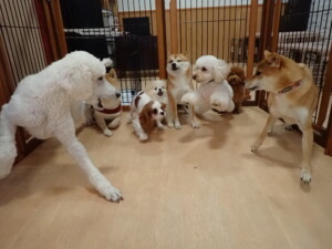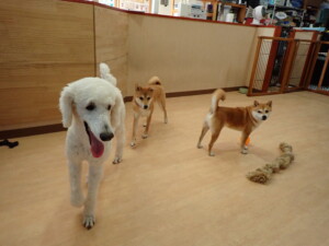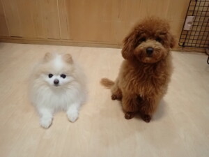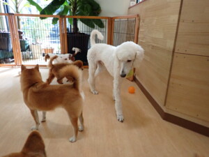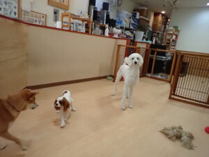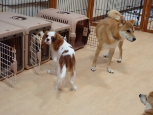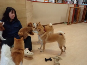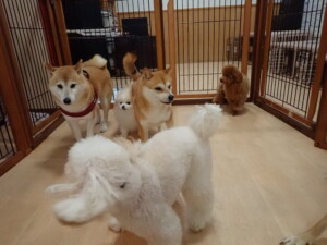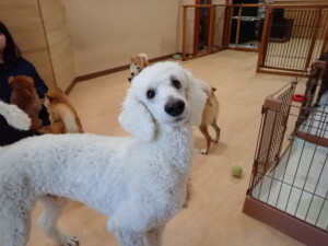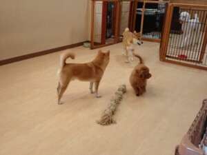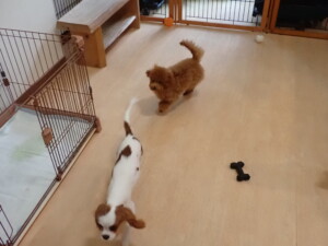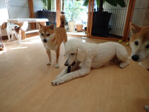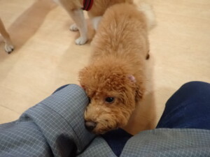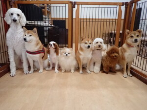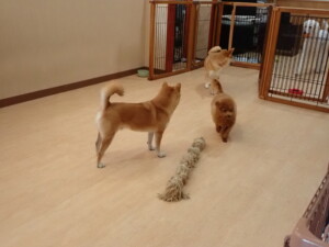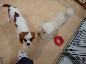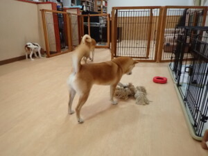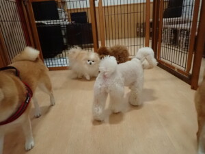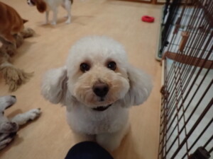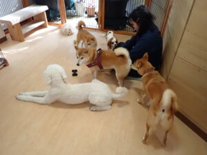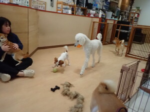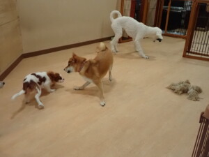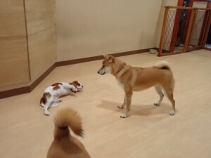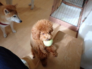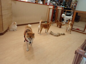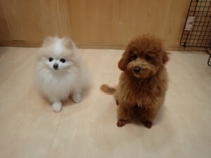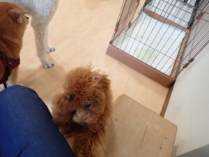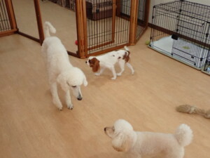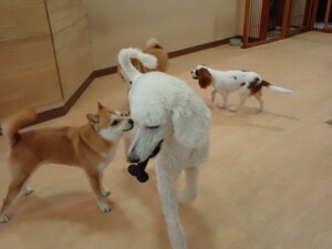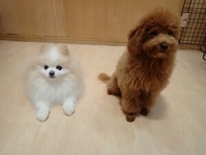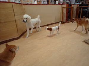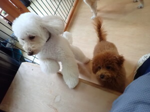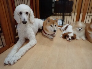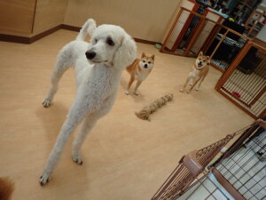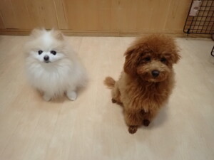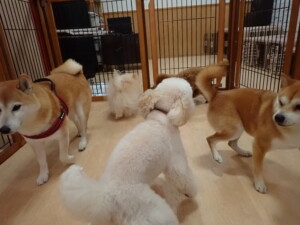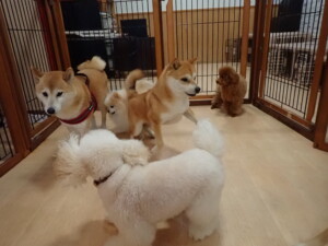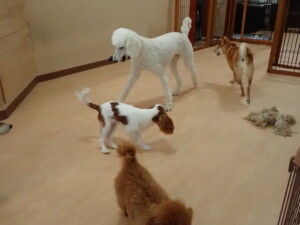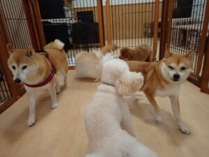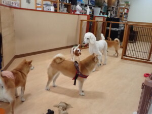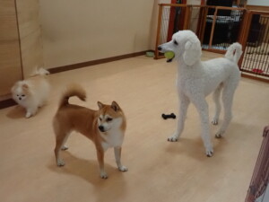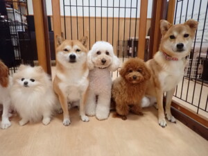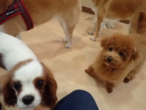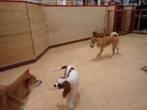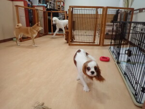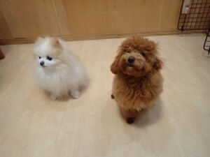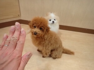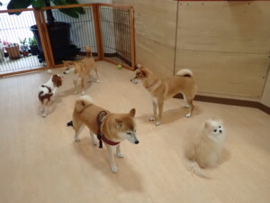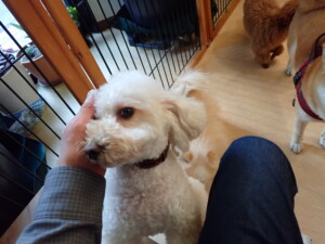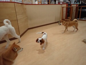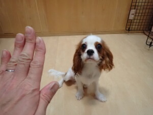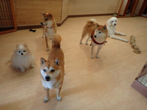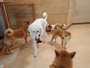 モモちゃんとこころちゃん、落ち着いて過ごしていました。ふじまる君、だんご君、ハルちゃん、モコ君、ミアちゃん、元気に遊んでいました。モコ君、「お座り」・「マテ」の練習をしました。ミアちゃん、「お座り・「フセ」・「マテ」・「オイデ」・「ハウス」の練習をしました。