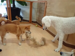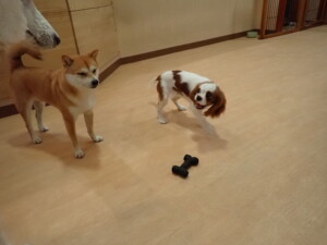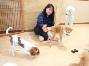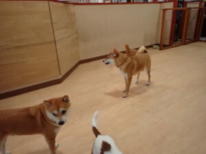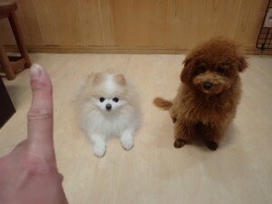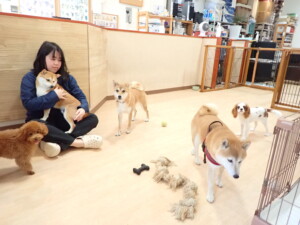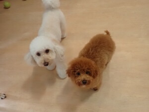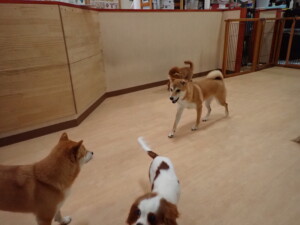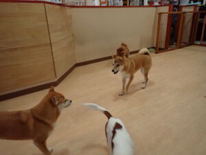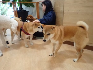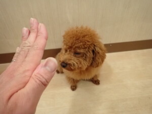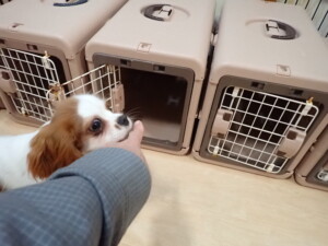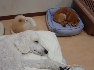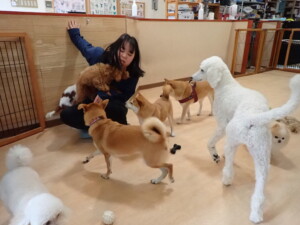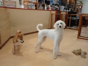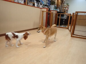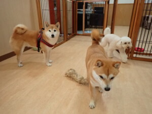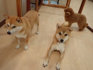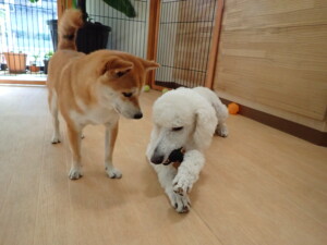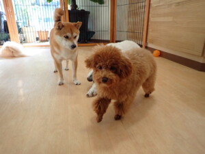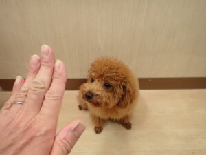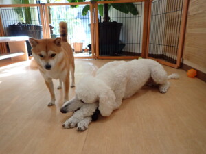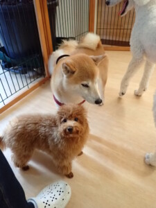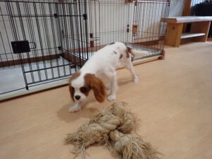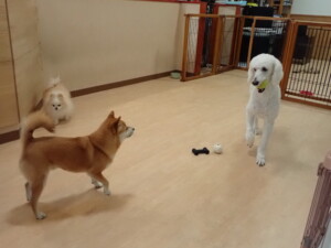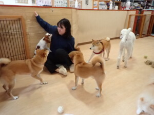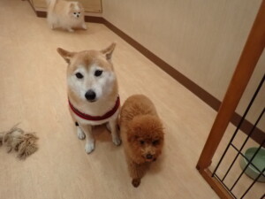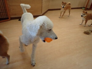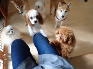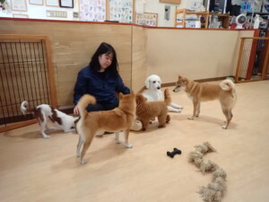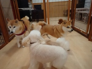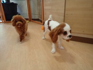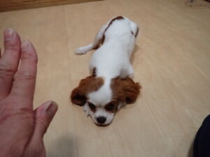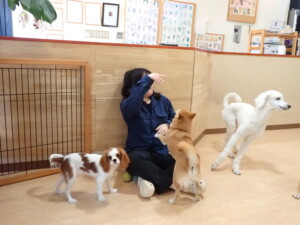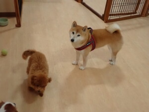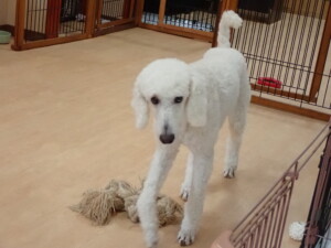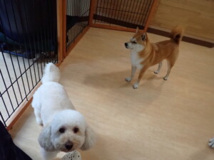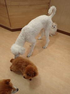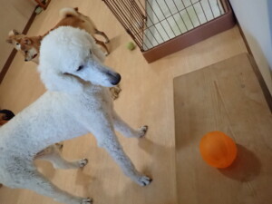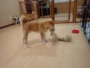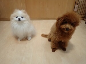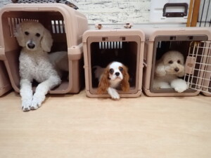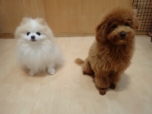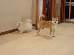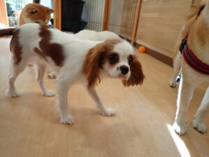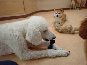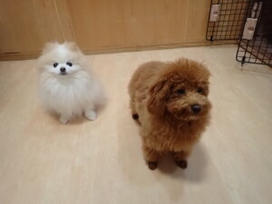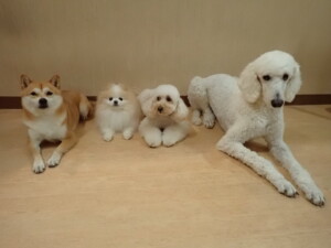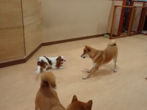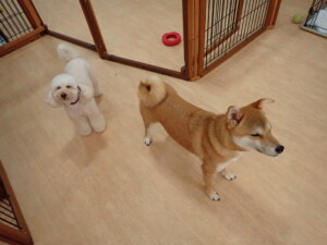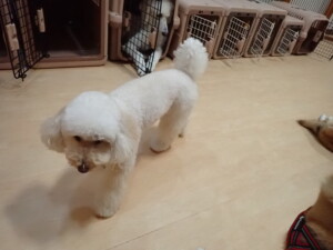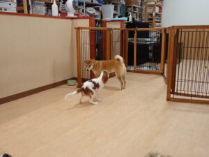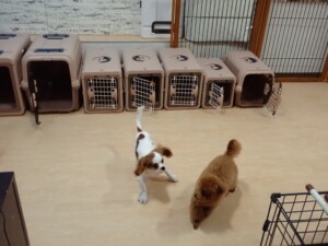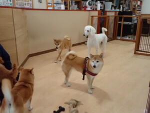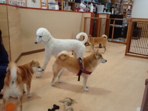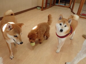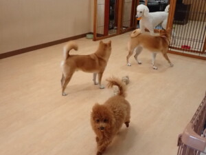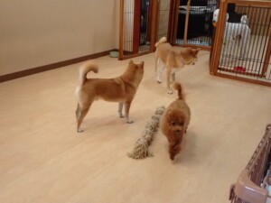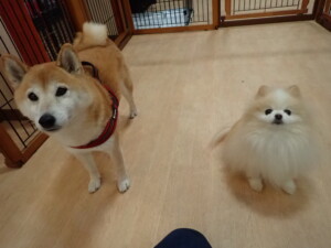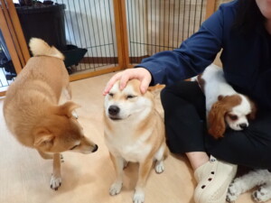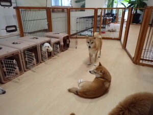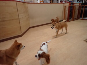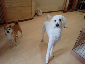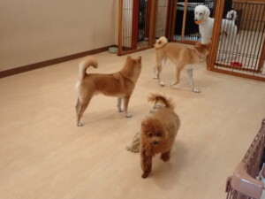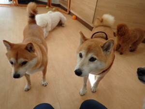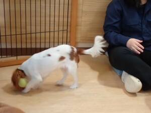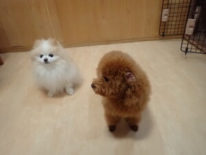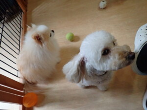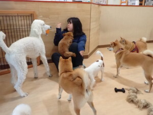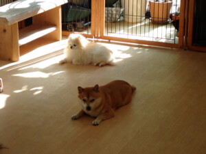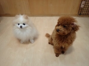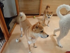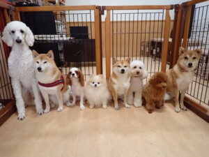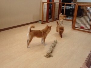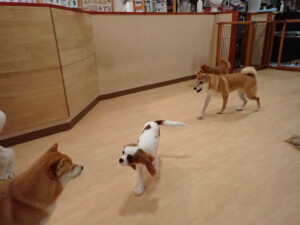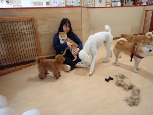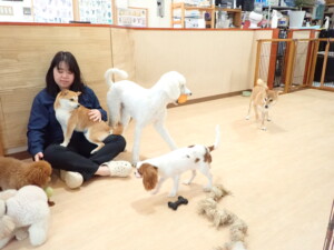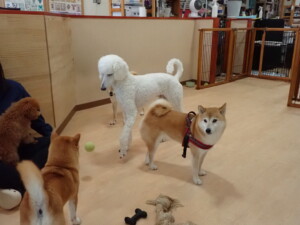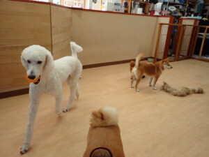 モモちゃんとこころちゃん、落ち着いて過ごしていました。ふじまる君、だんご君、ハルちゃん、モコ君、ミアちゃん、元気に遊んでいました。モコ君、「お座り」・「マテ」の練習をしました。ミアちゃん、「お座り・「フセ」・「マテ」・「オイデ」・「ハウス」の練習をしました。