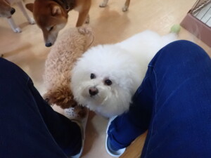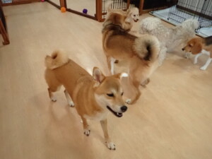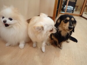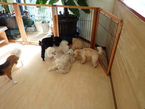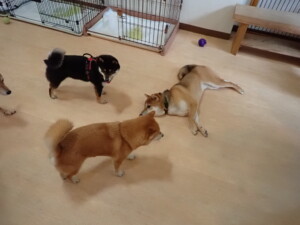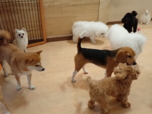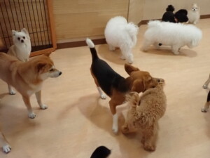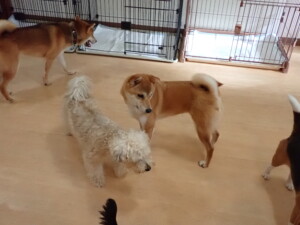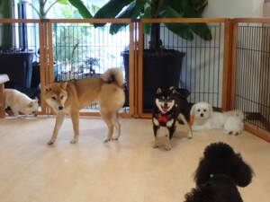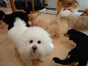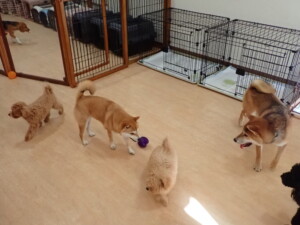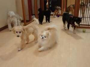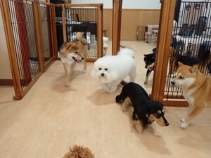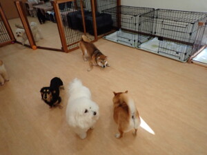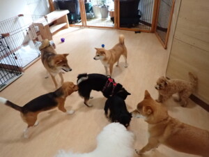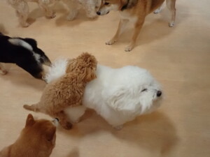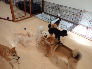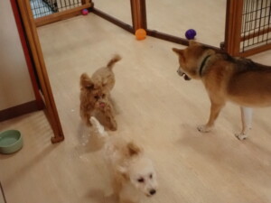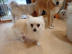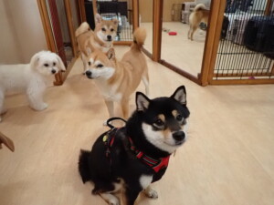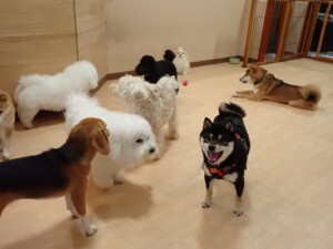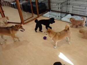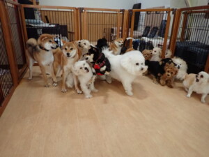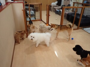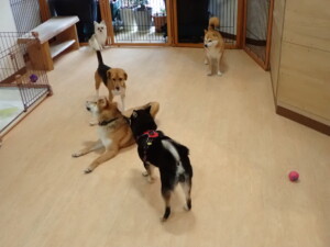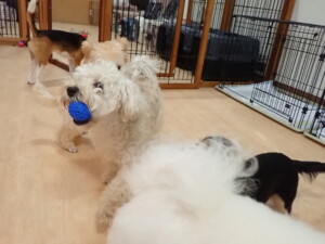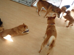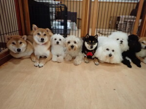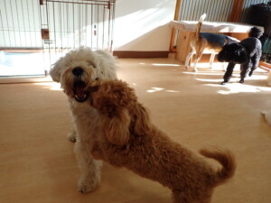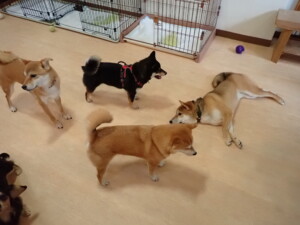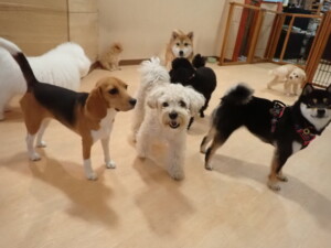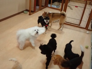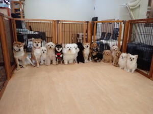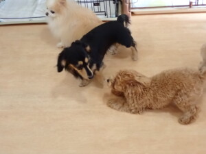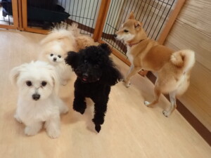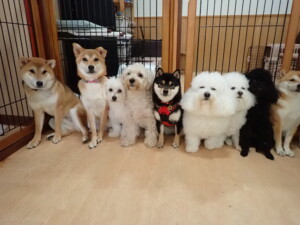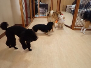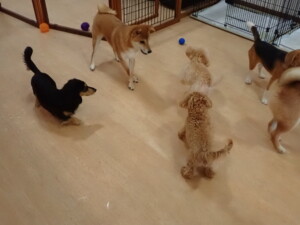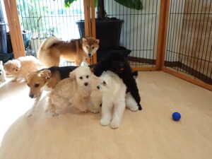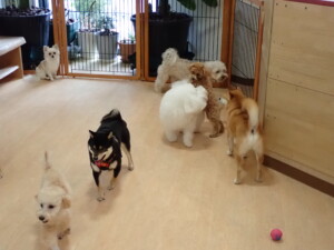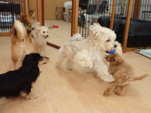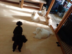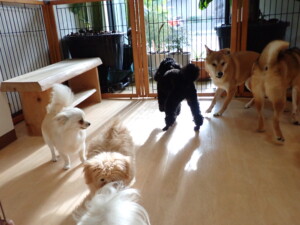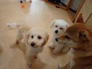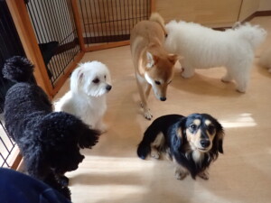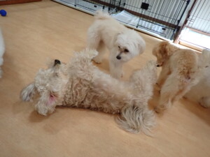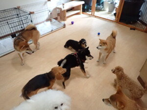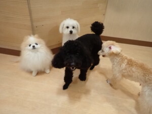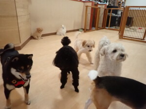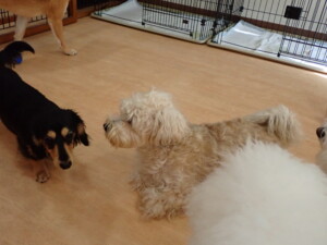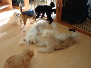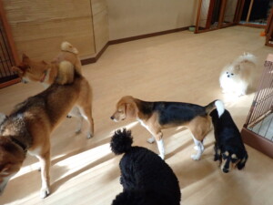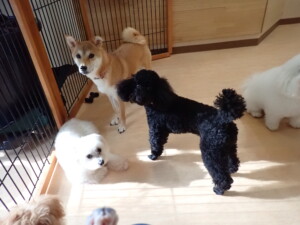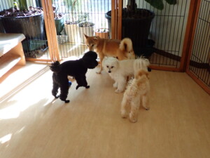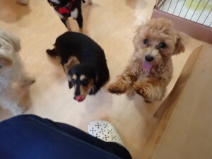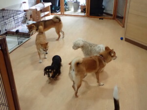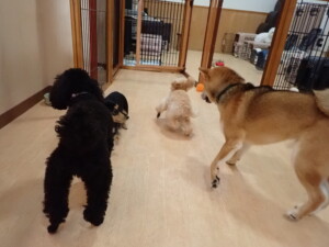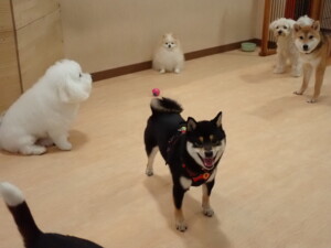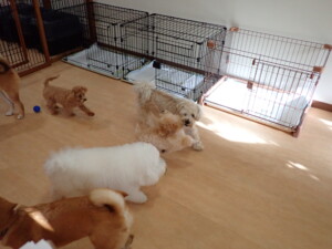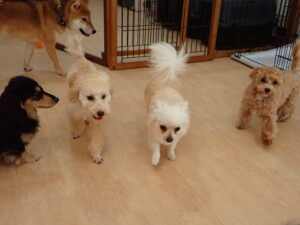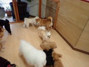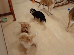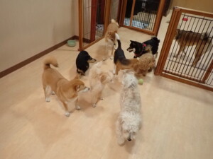 まる君、ブブ君、モコ君、アメリちゃん、ハルちゃん、こげ茶君、ミルちゃん、むぎ君、はな子ちゃん、ポコ君、スズちゃん、ぴのちゃん、ひまわり君、元気に遊んでいました。ポーちゃん、落ち着いて過ごしていました。ぴのちゃん、「お座り・「フセ」・「マテ」・「オイデ」の練習をしました。ひまわり君、「お座り・「フセ」・「マテ」の練習をしました。