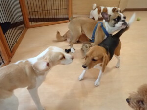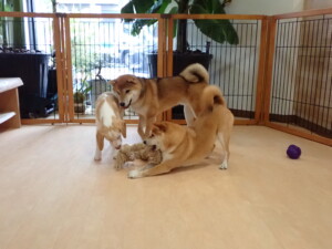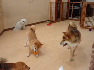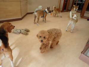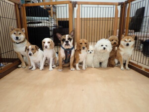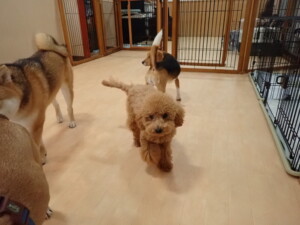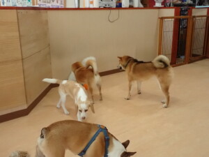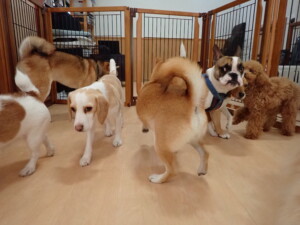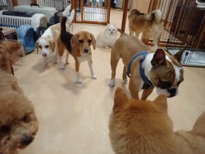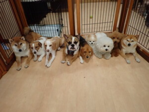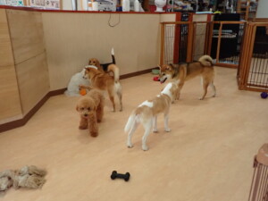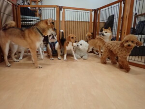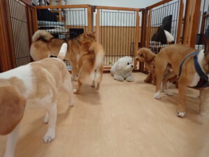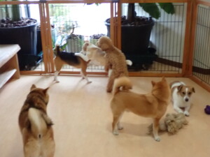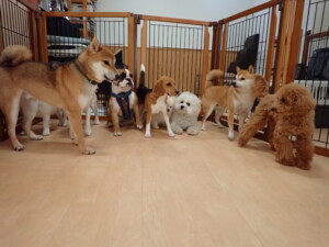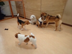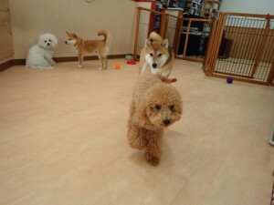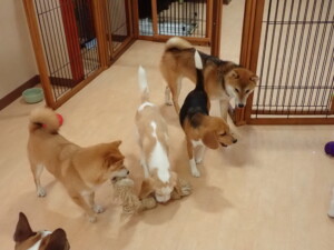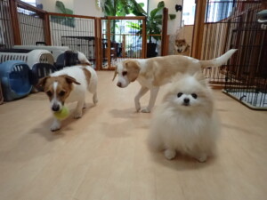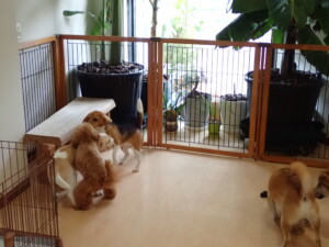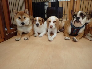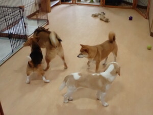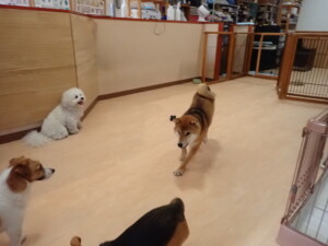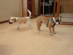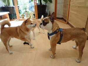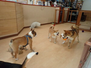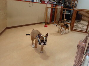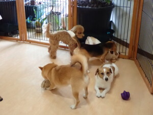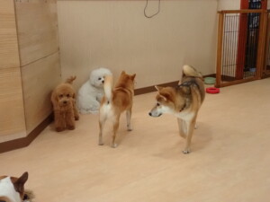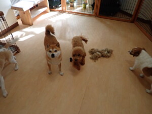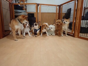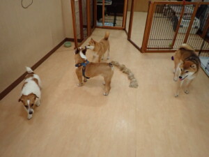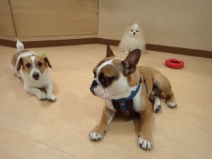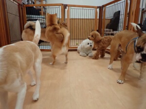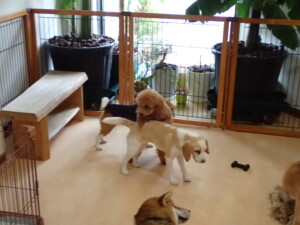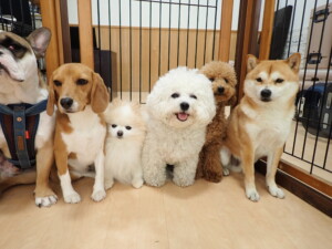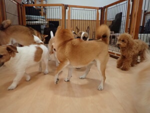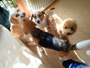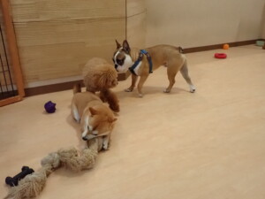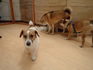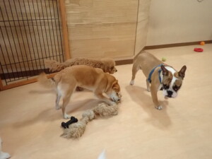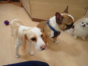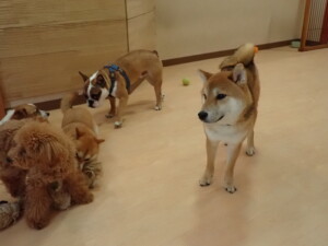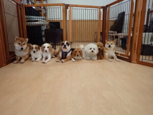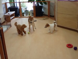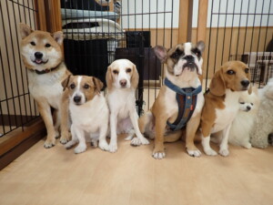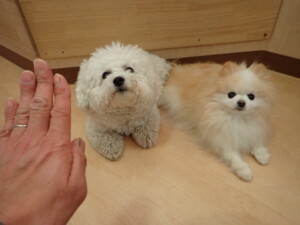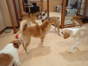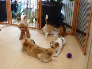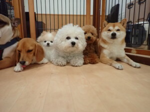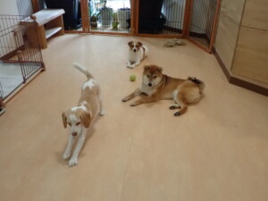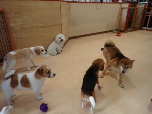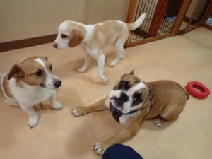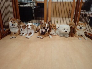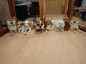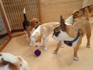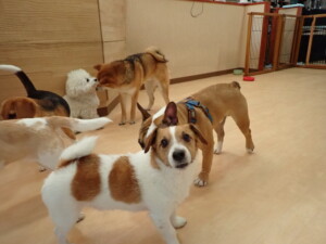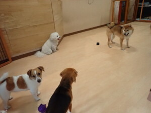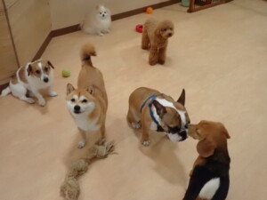 むぎ君、グーちゃん、寛大君、はな子ちゃん、だんご君、メリィちゃん、アントニー君、元気に遊んでいました。ボヌ君、落ち着いて過ごしていました。アントニー君とボヌ君、「お座り・「フセ」・「マテ」の練習をしました。