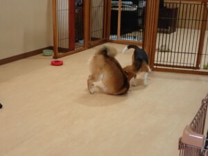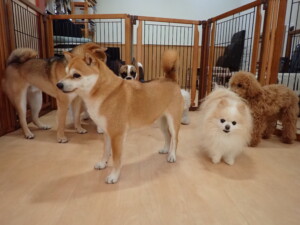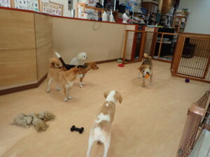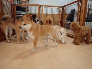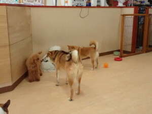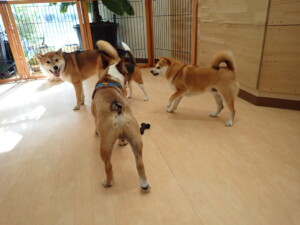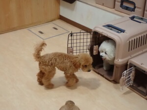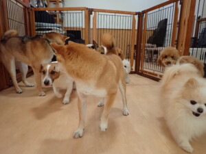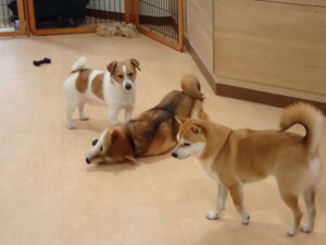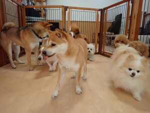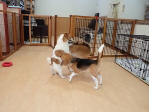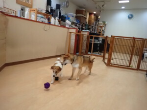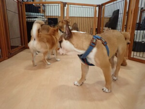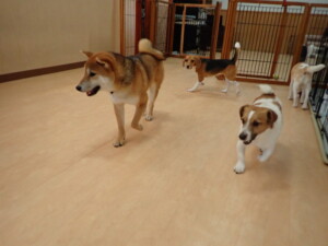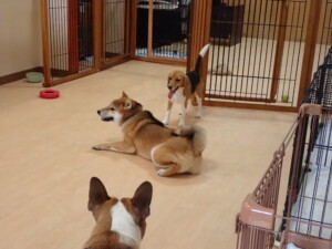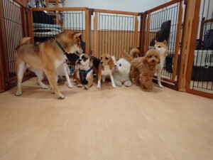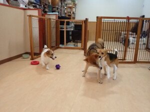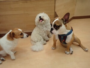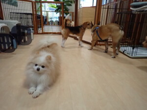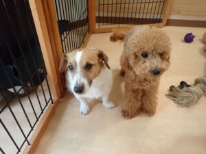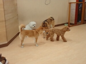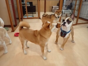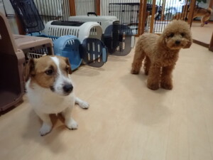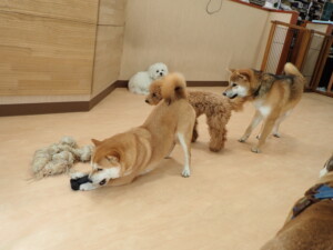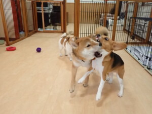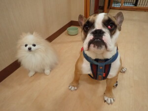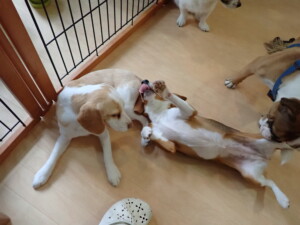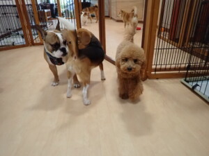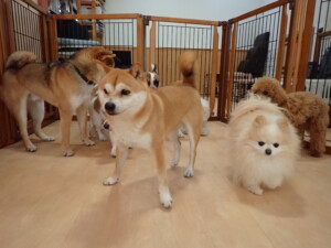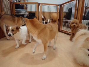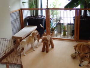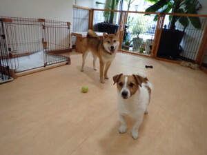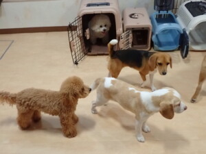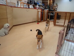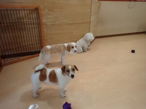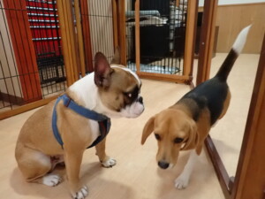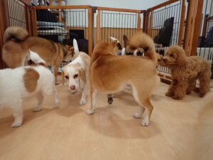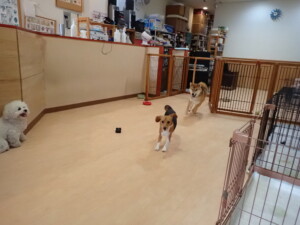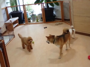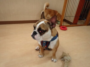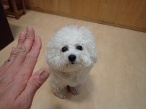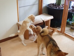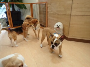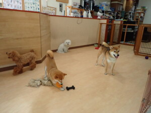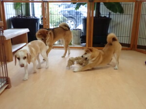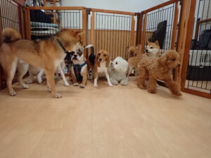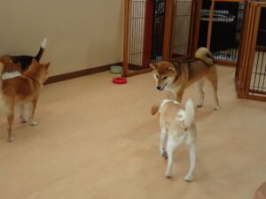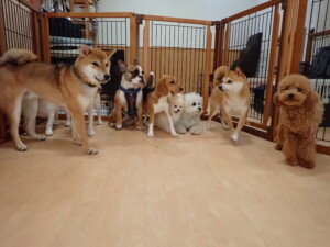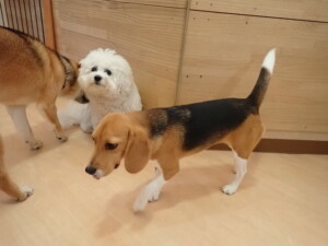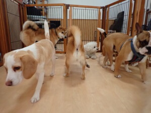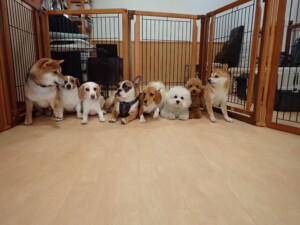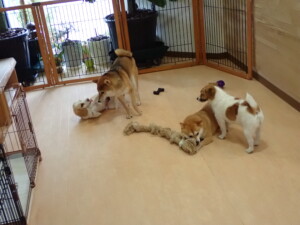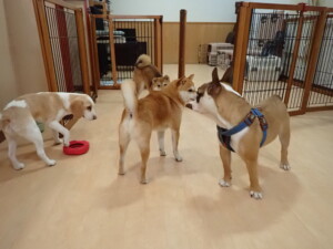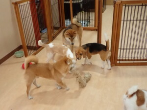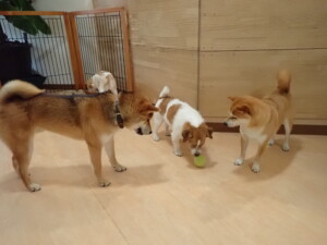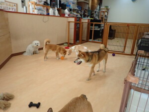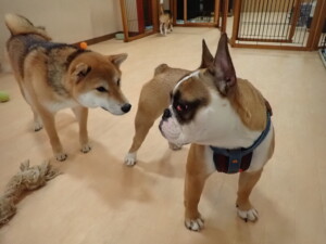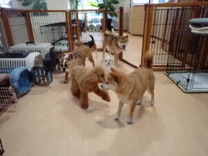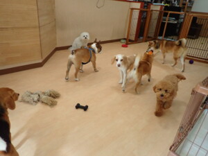 むぎ君、グーちゃん、寛大君、はな子ちゃん、だんご君、メリィちゃん、アントニー君、元気に遊んでいました。ボヌ君、落ち着いて過ごしていました。アントニー君とボヌ君、「お座り・「フセ」・「マテ」の練習をしました。