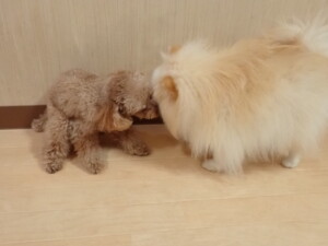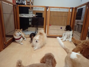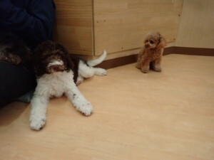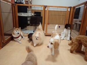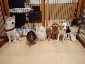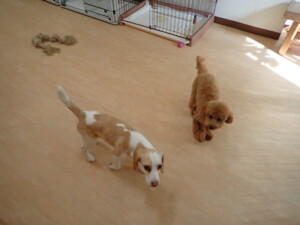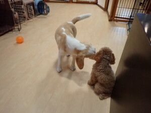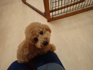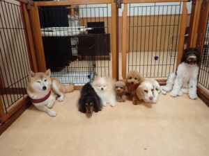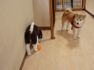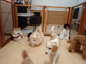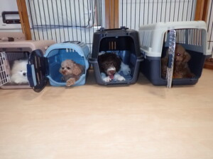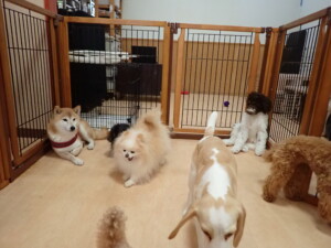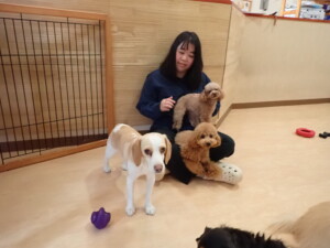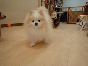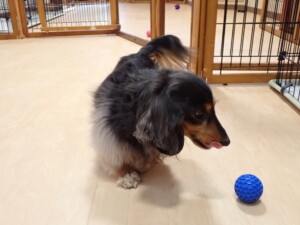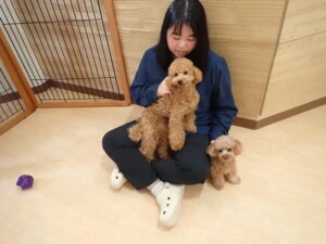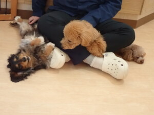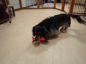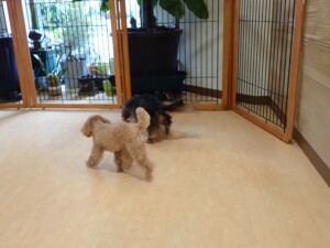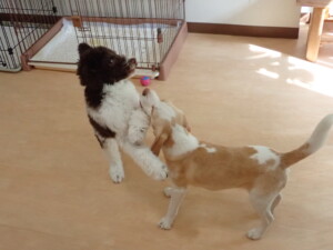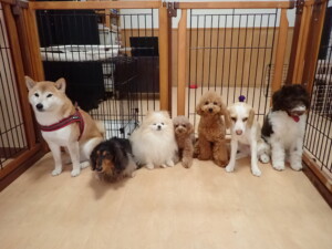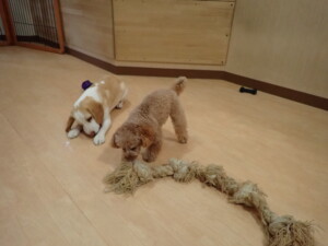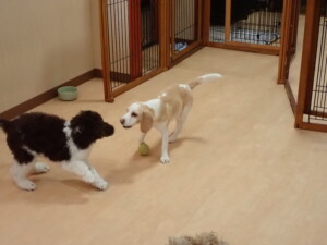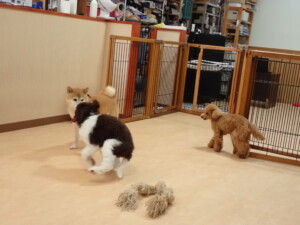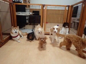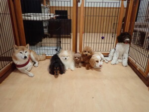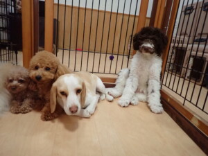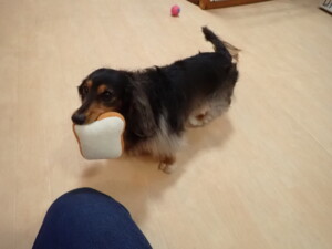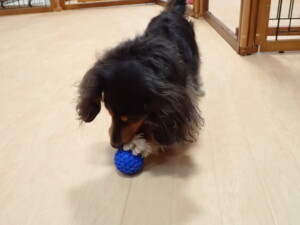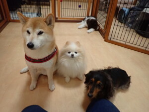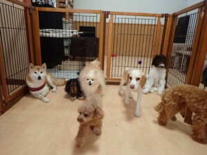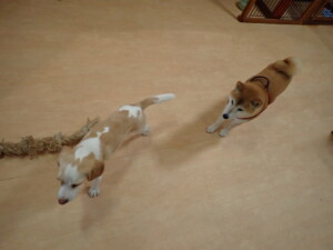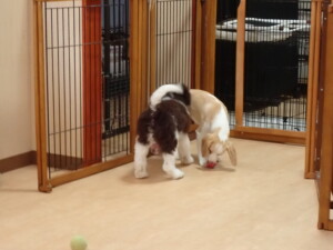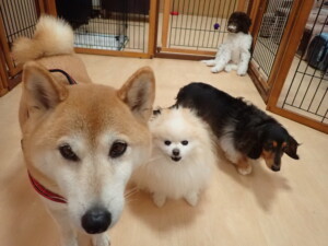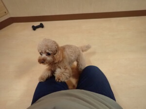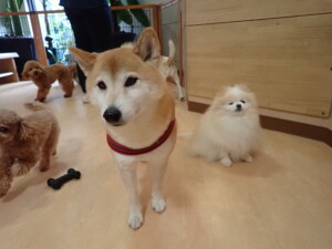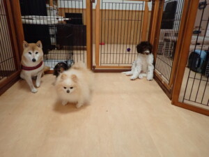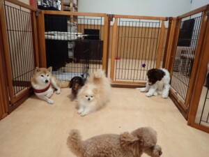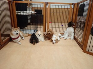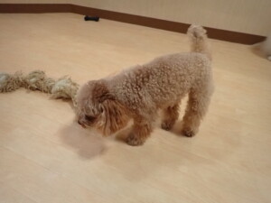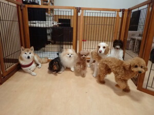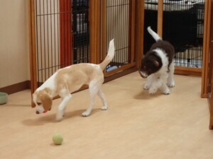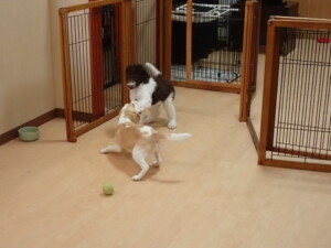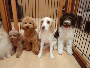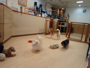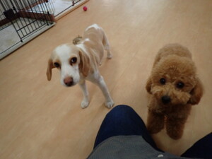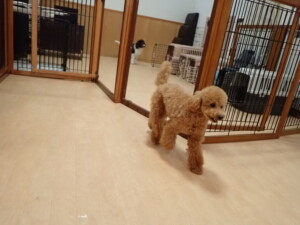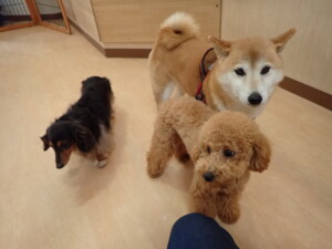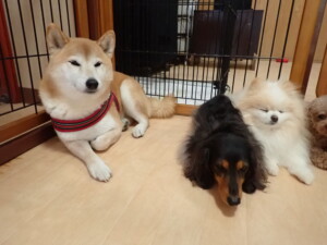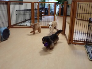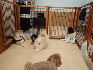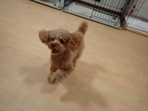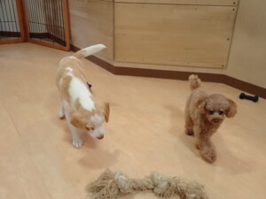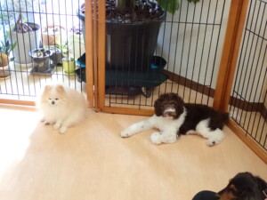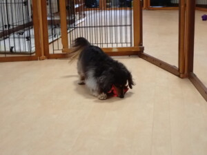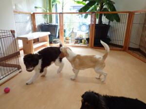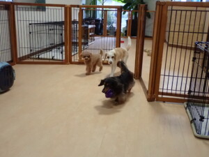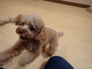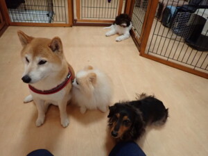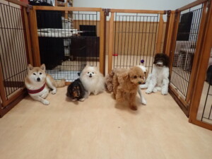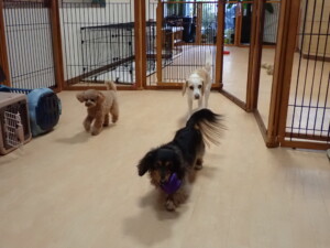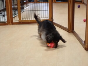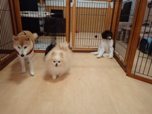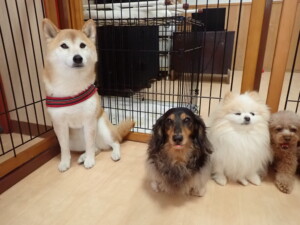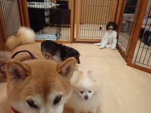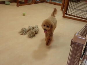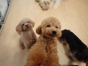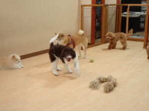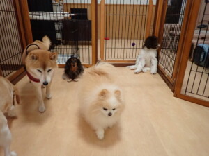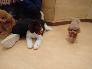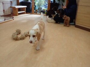 モモちゃん、チャロちゃん、グーちゃん、メリィちゃん、トイ君、元気に遊んでいました。トイ君、「お座り」の練習をしました。