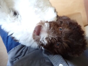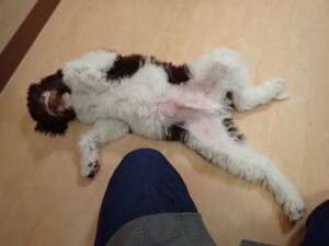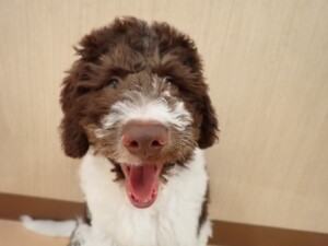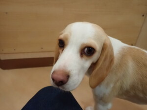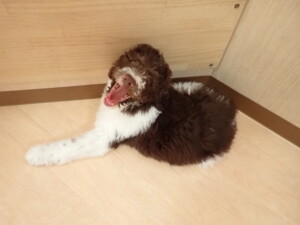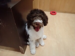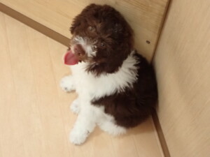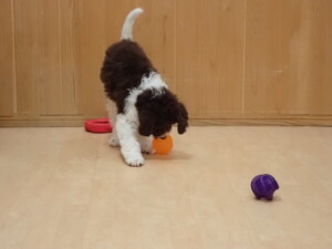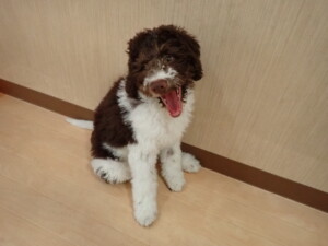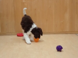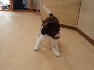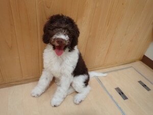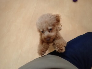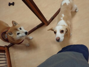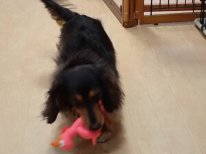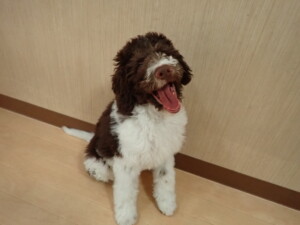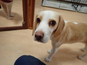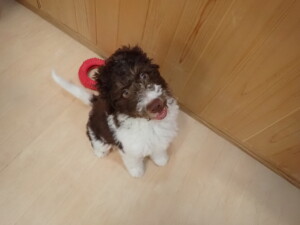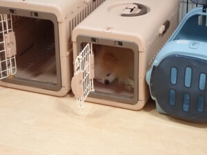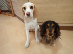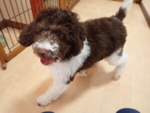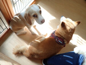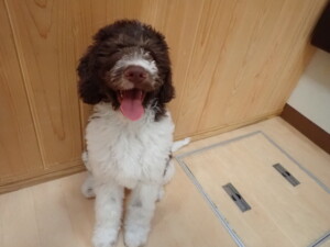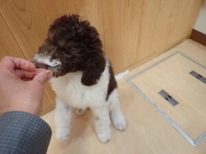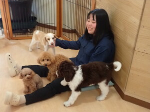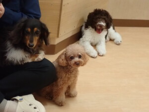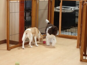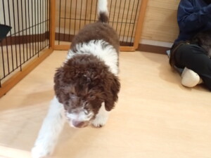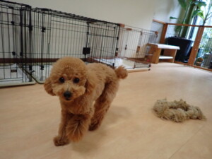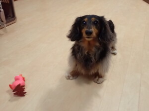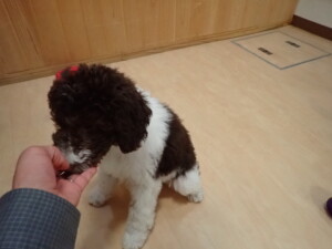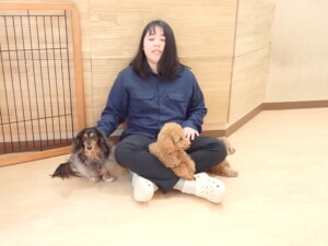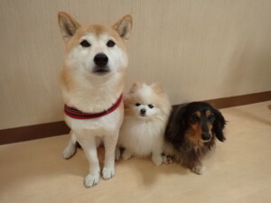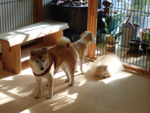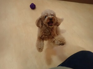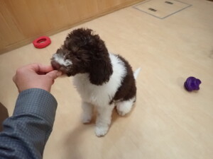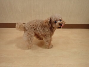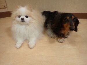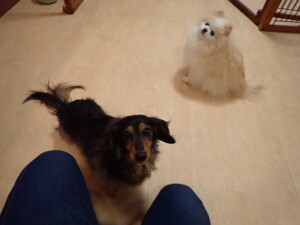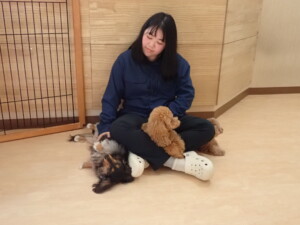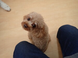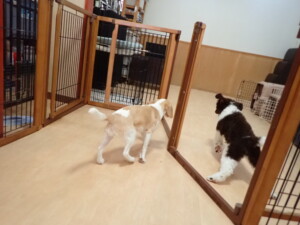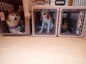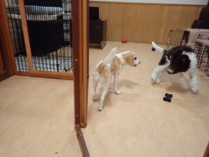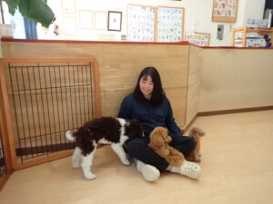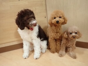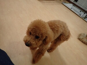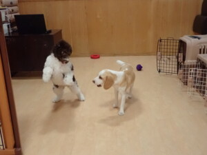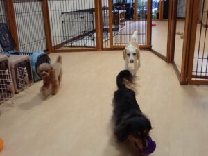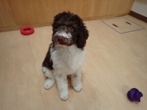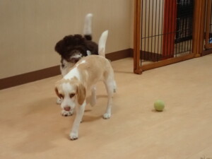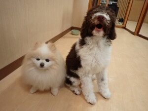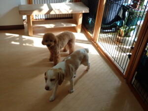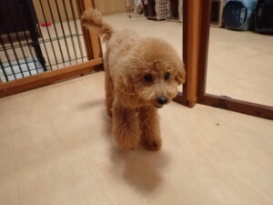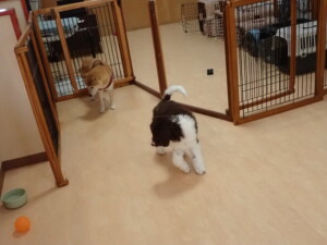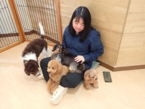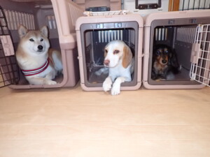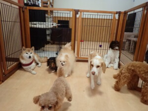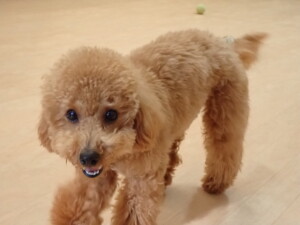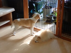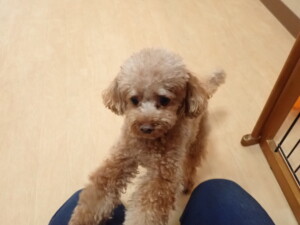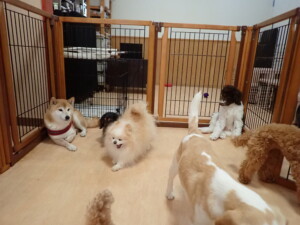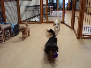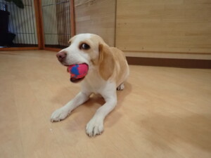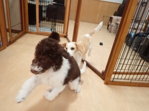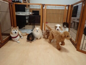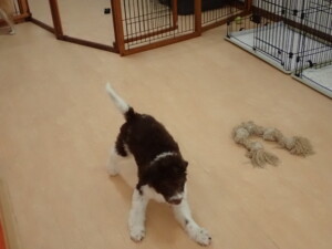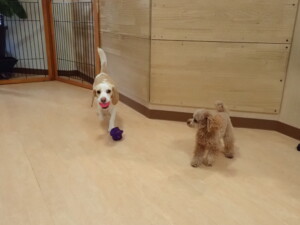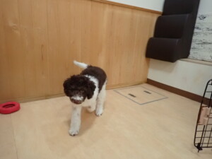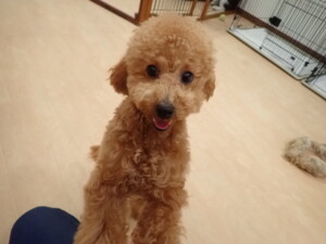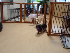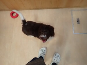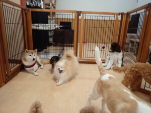モモちゃん、チャロちゃん、グーちゃん、メリィちゃん、トイ君、元気に遊んでいました。トイ君、「お座り」の練習をしました。