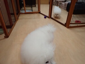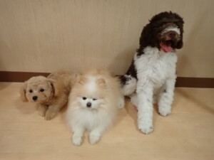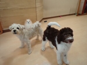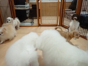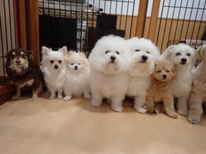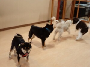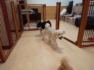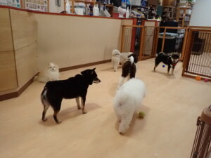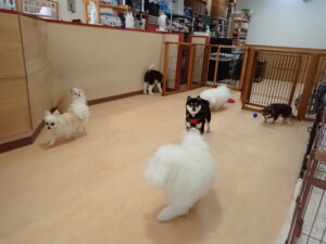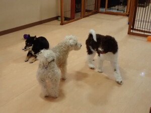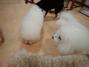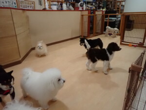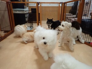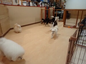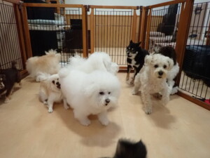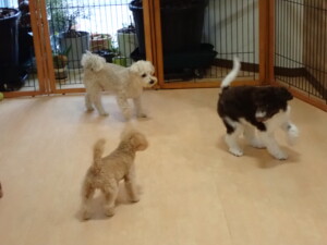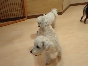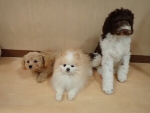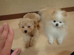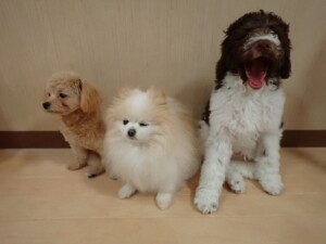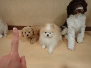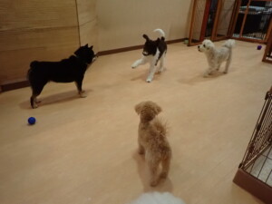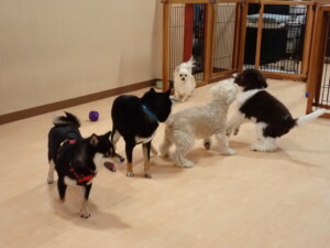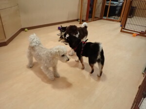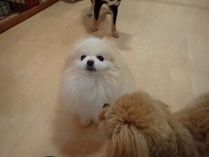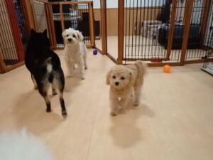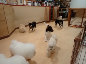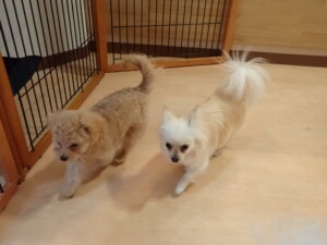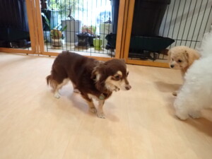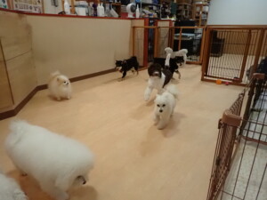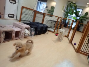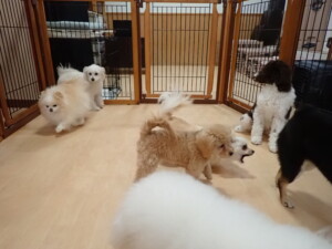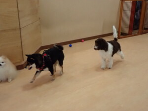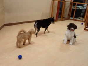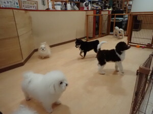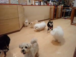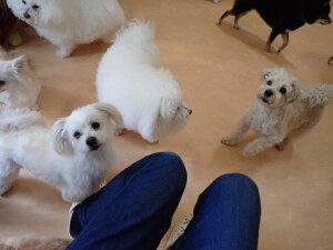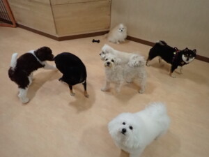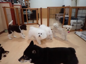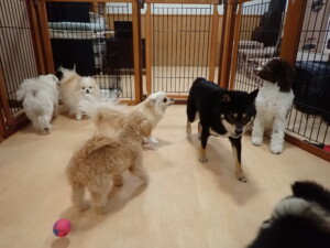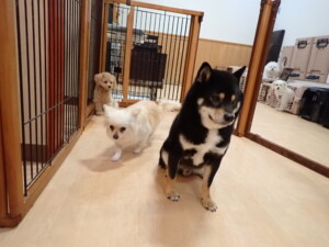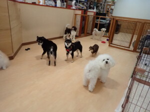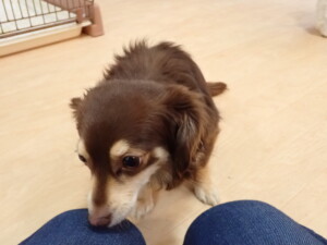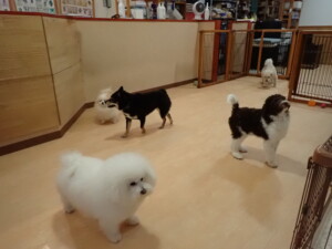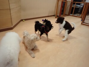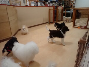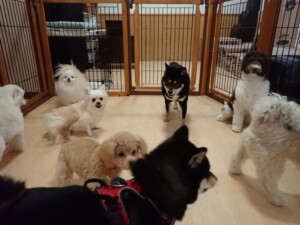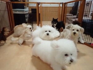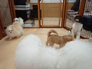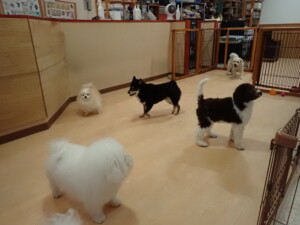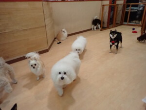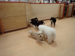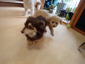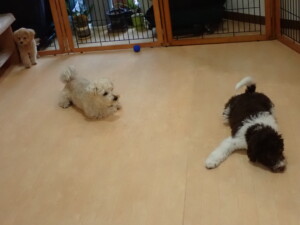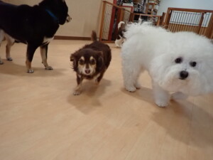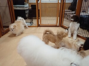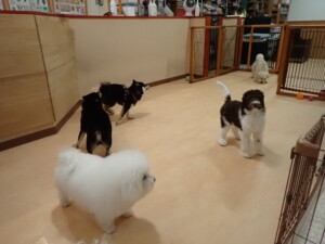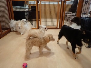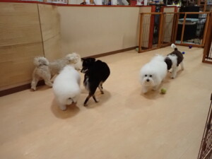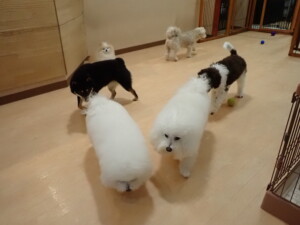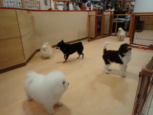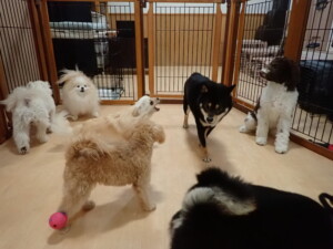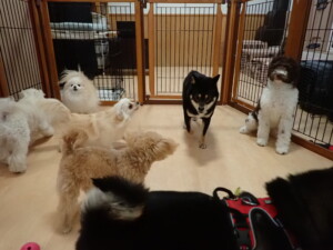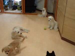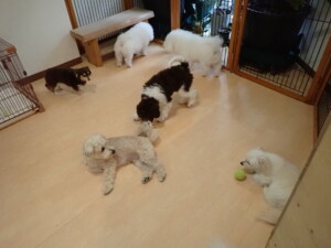モコ君、ブブ君、ミルちゃん、こげ茶君、もっち君、スズちゃん、ぴのちゃん、トイ君、元気に遊んでいました。ポーちゃんと紅ちゃん、落ち着いて過ごしていました。ぴのちゃん、「お座り・「フセ」・「マテ」・「オイデ」の練習をしました。トイ君、「お座り」・「マテ」の練習をしました。ぴのちゃん、今日でトレーニング卒業です。