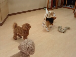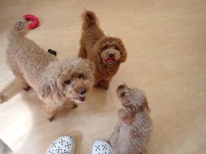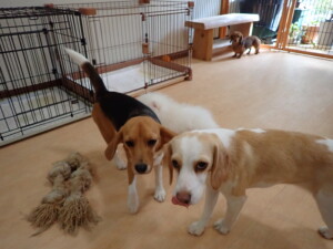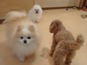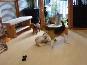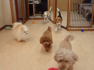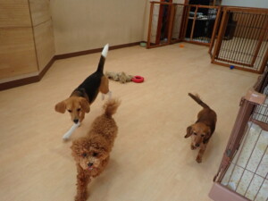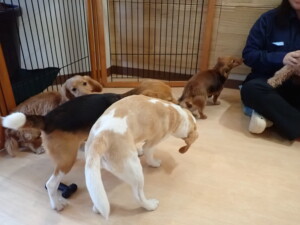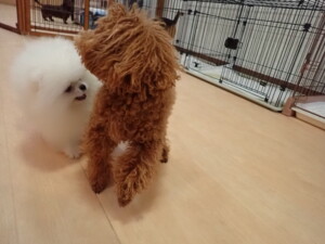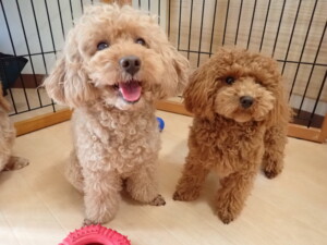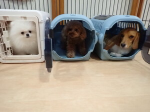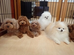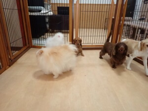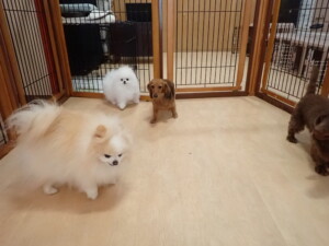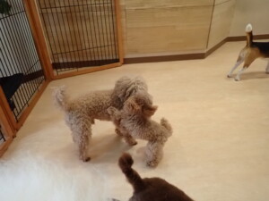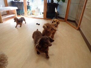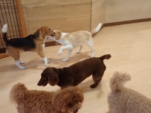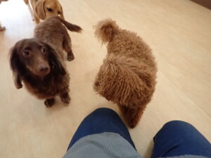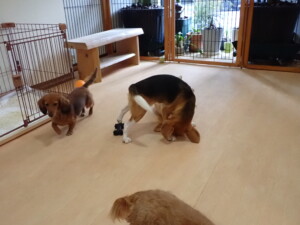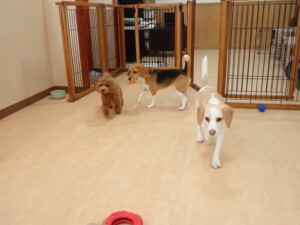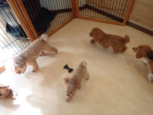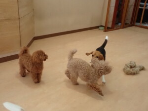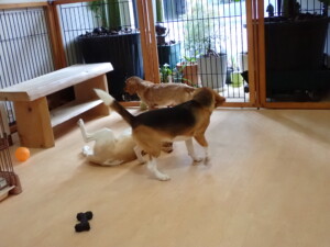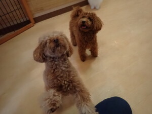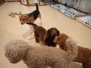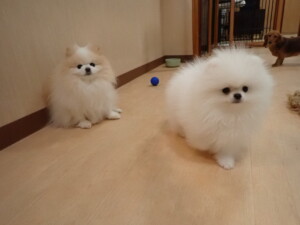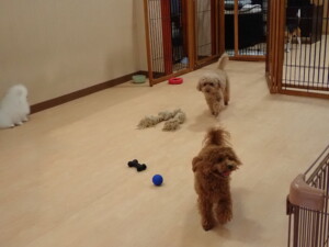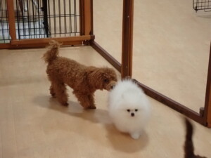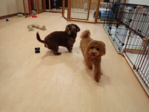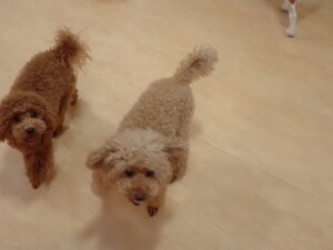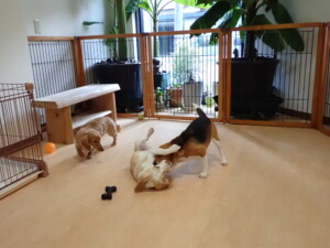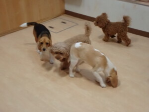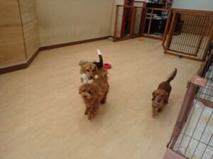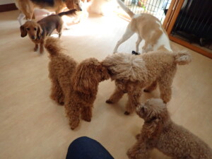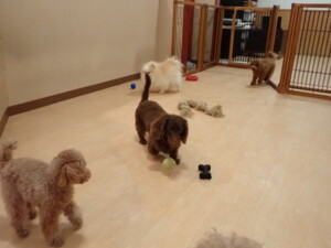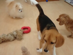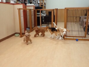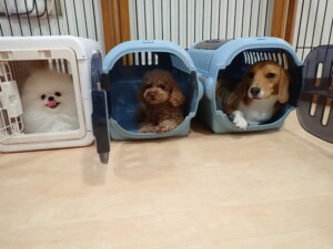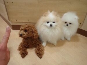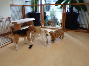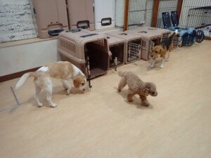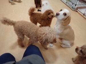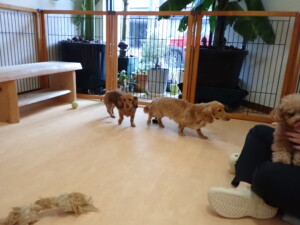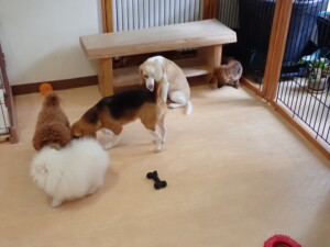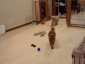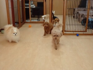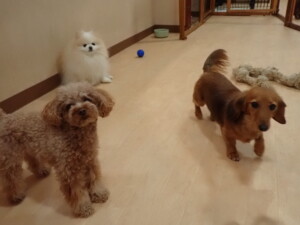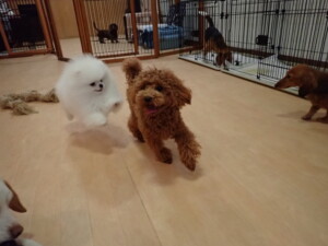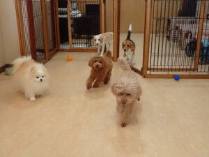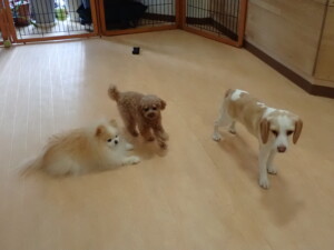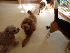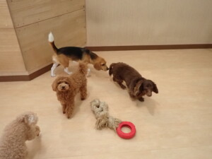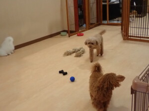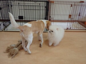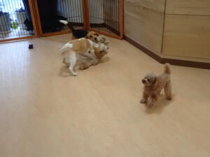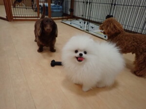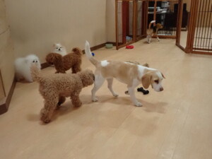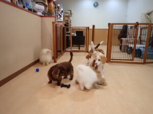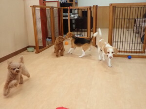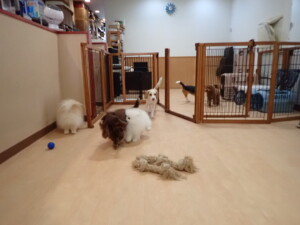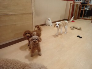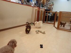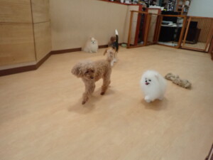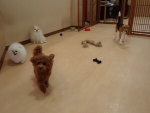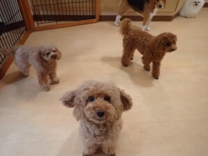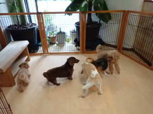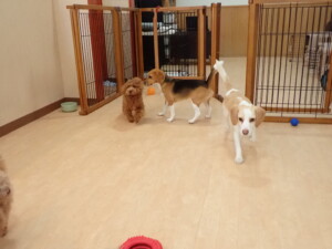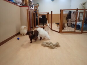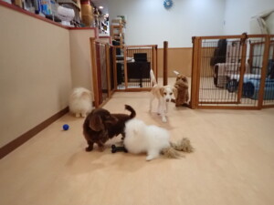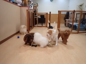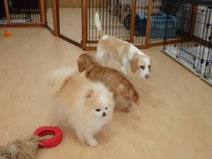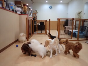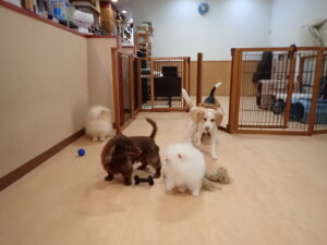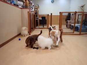 二瑚ちゃんとチャロちゃん、落ち着いて過ごしていました。三瑚君、はな子ちゃん、グーちゃん、アレックス君、じゃんぷ君、ルイ君、もち太君、元気に遊んでいました。ルイ君、「お座り」・「フセ」・「マテ」・「オイデ」の練習をしました。もち太君、「お座り」・「マテ」の練習をしました。