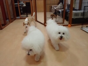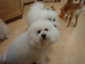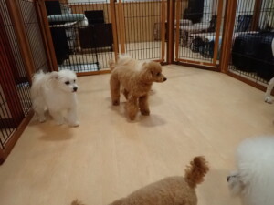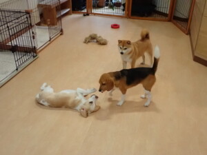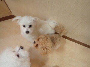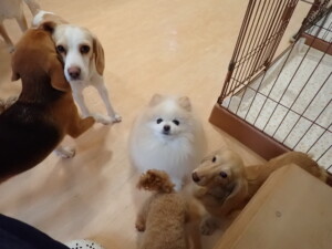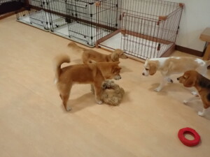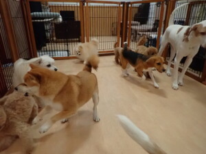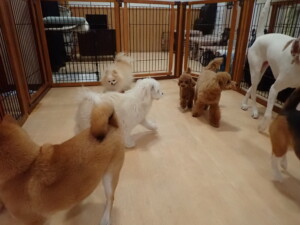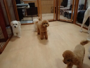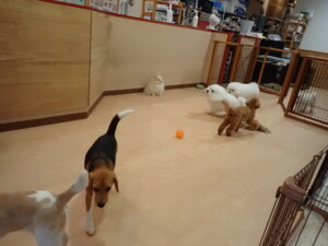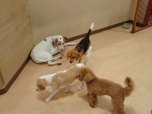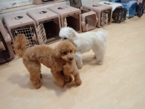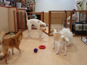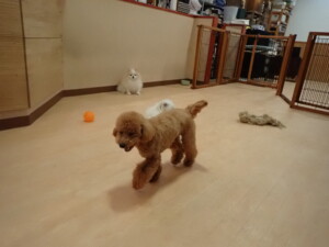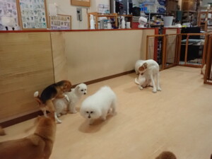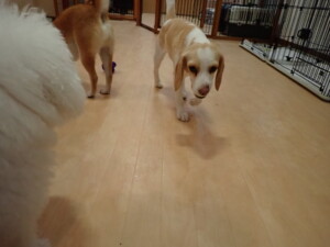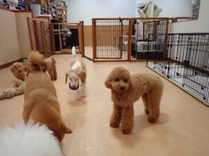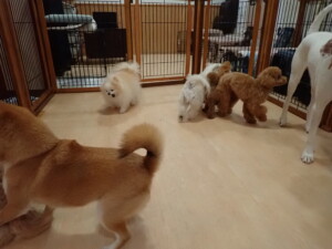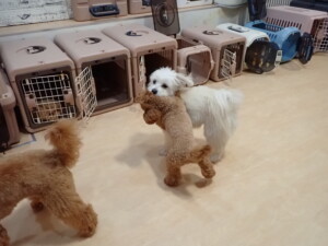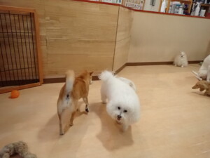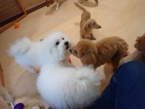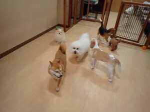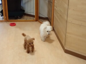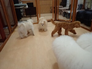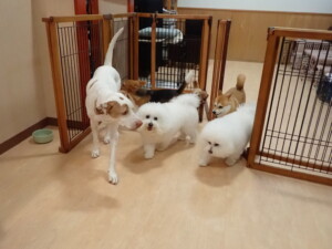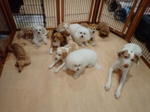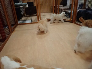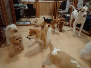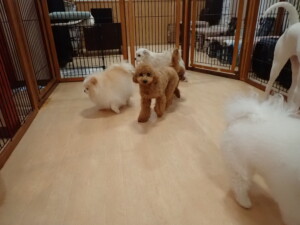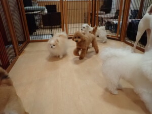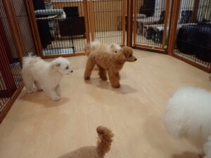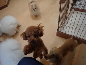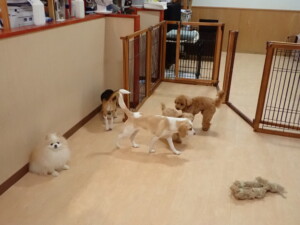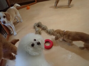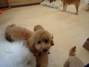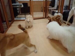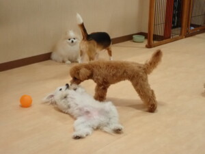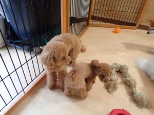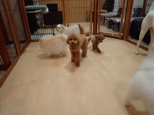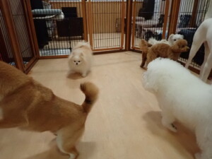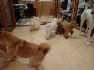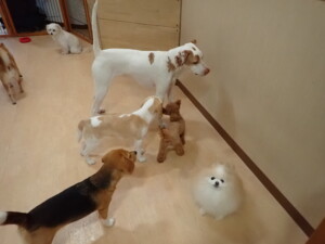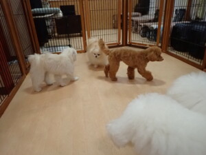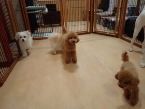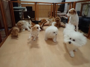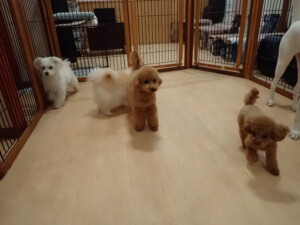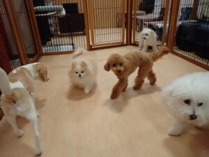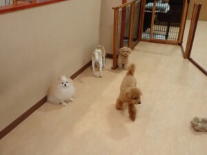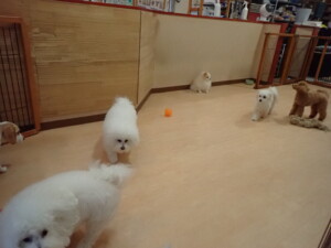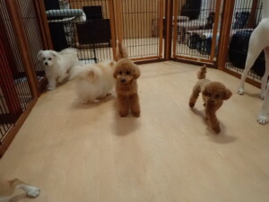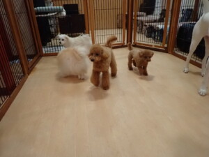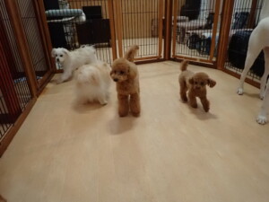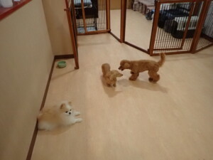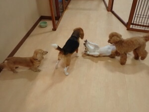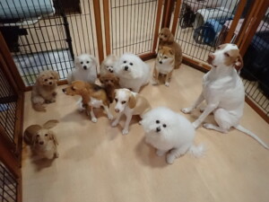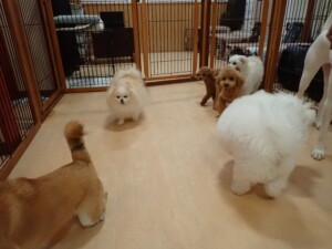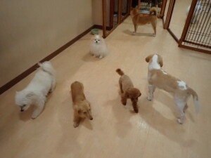 ポーちゃん、ミコルちゃん、落ち着いて過ごしていました。ブブ君、モコ君、ぴのちゃん、グーちゃん、はな子ちゃん、メリィちゃん、だんご君、たっくす君、アビーちゃん、元気に遊んでいました。ミコルちゃん、「お座り」・「フセ」・「マテ」の練習をしました。
