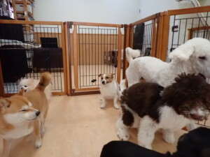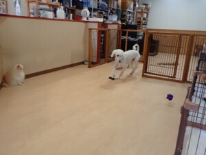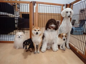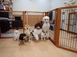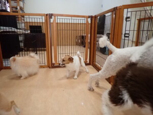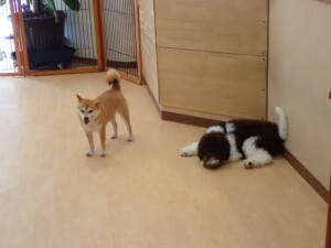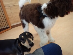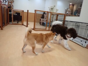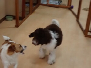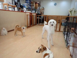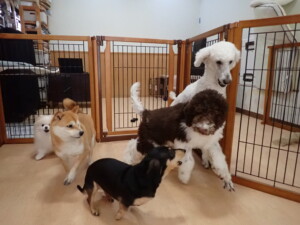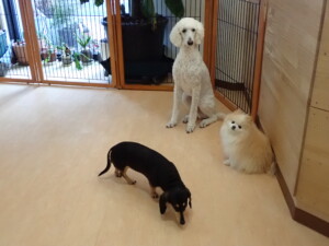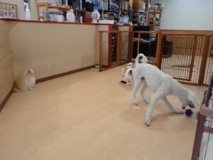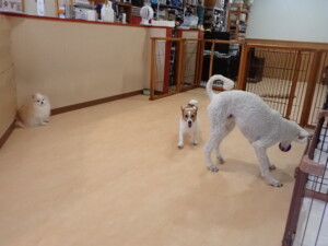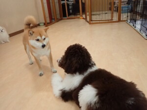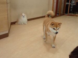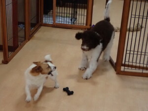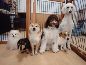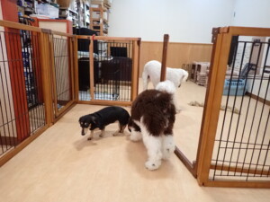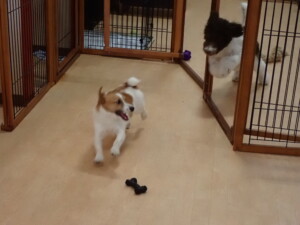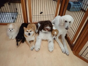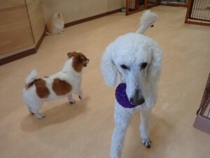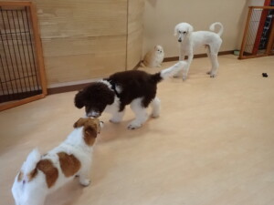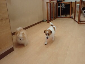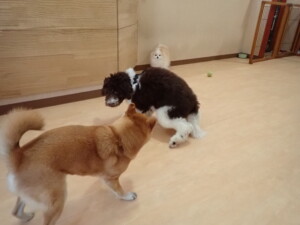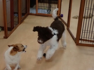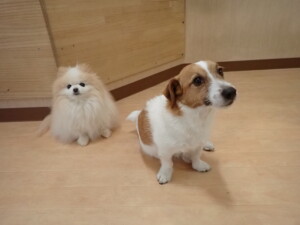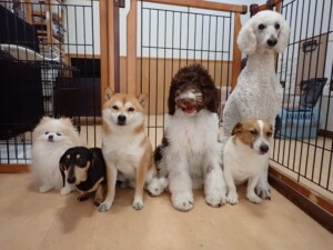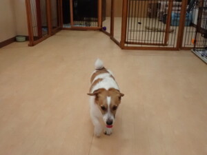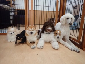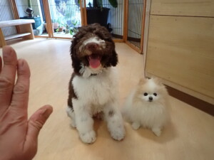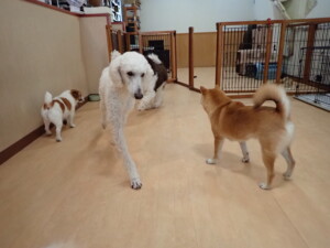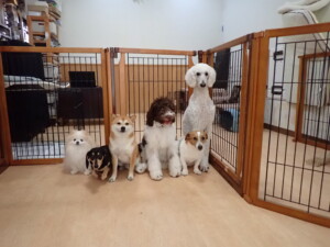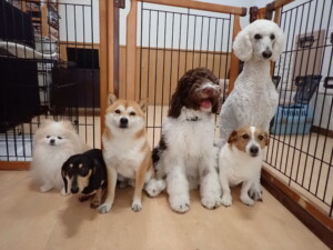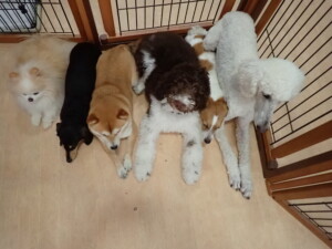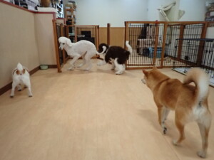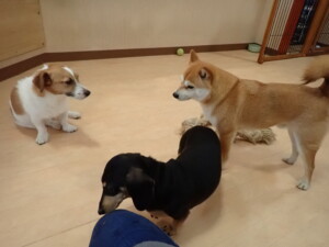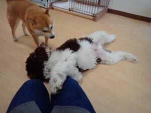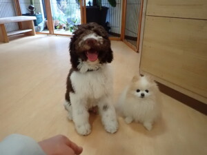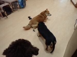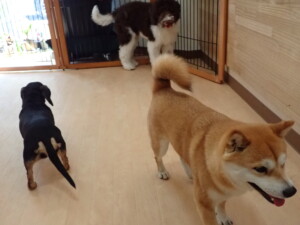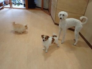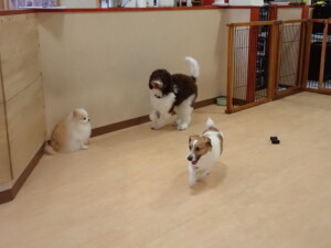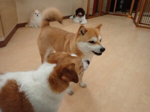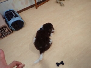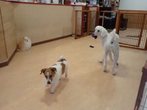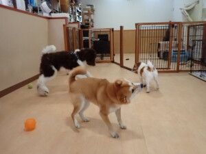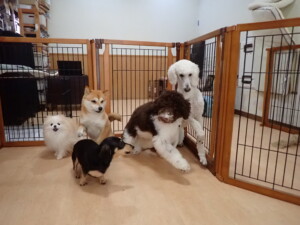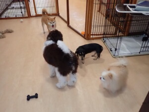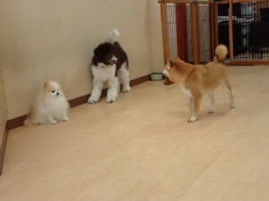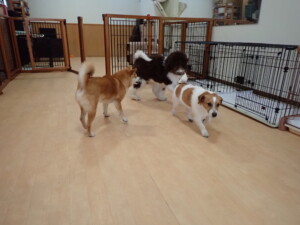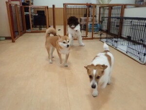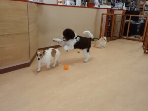 ふじまる君、寛大君、モコちゃん、だんご君、トイ君、みんな元気に遊んでいました。トイ君、「お座り」・「フセ」・「マテ」の練習をしました。