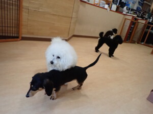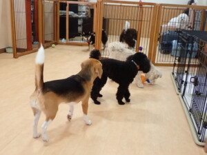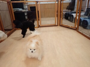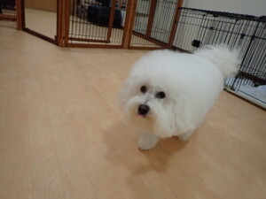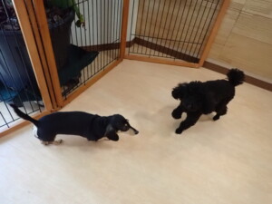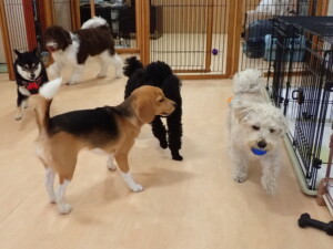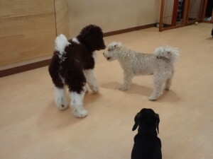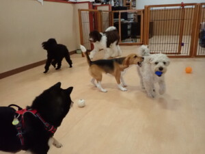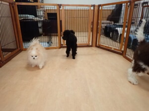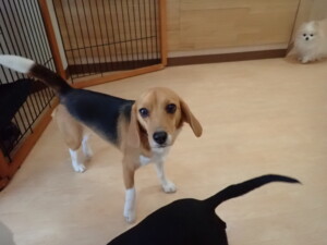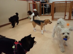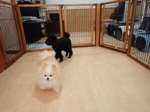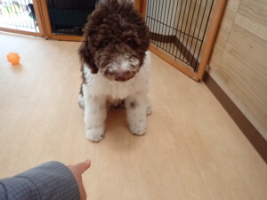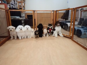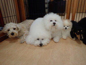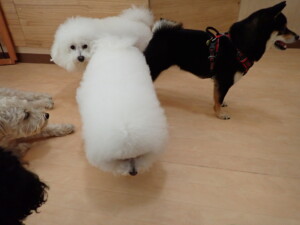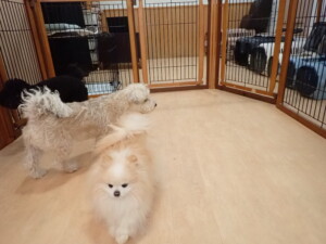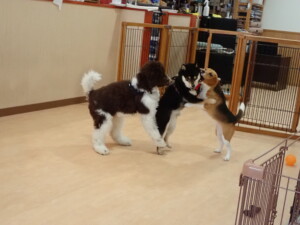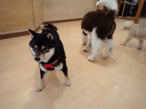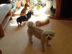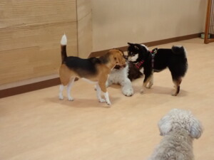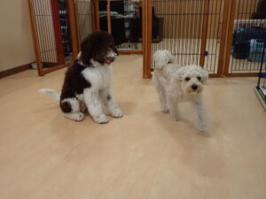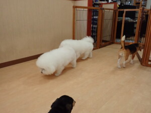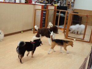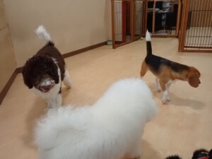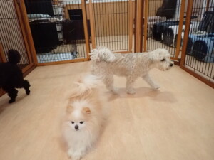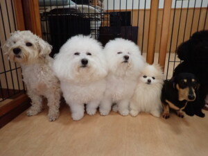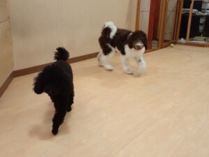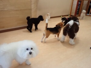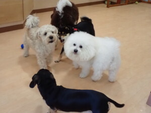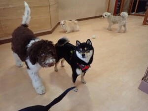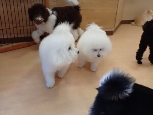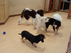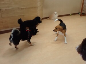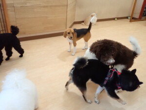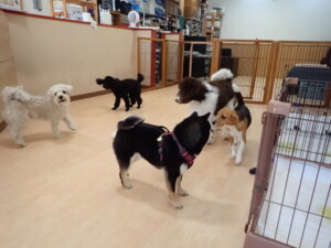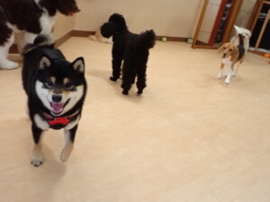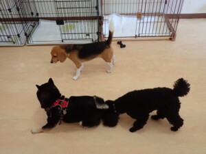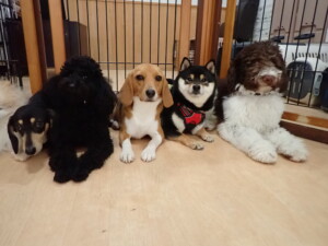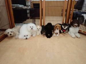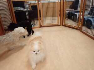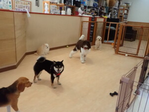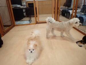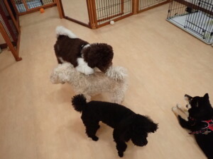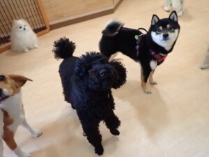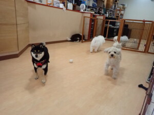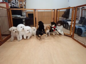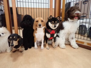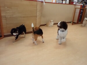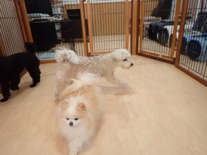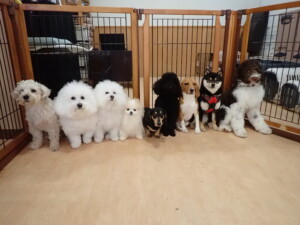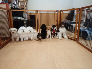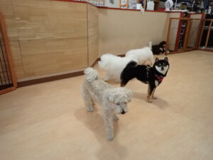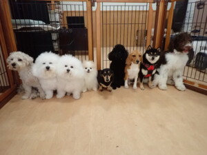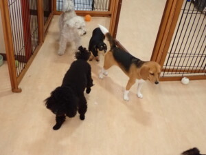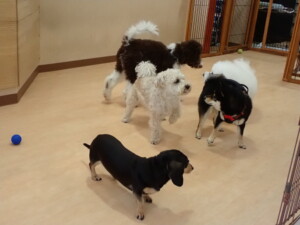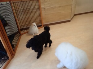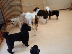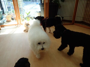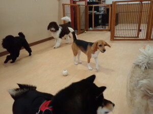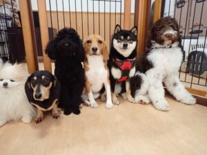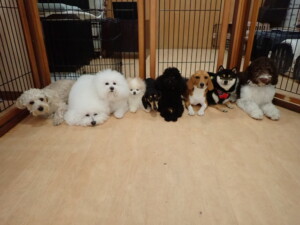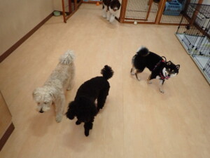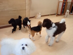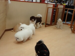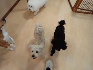 ポーちゃん、落ち着いて過ごしていました。ブブ君、アメリちゃん、、こげ茶君、はな子ちゃん、モコちゃん、スズちゃん、トイ君、元気に遊んでいました。トイ君、「お座り」・「フセ」・「マテ」・「オイデ)の