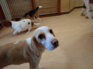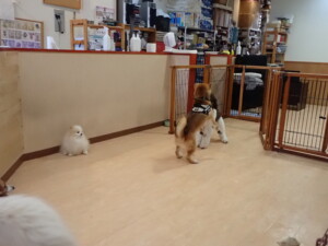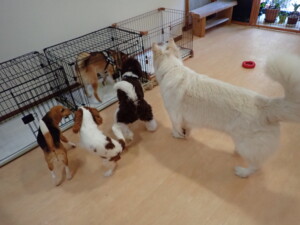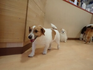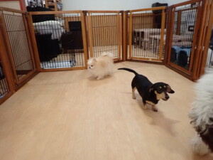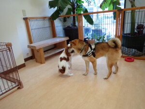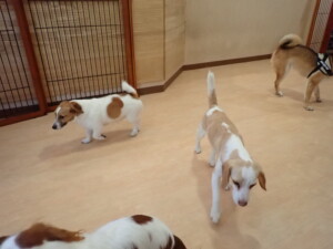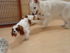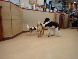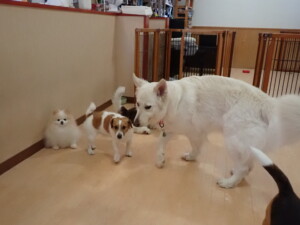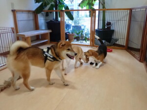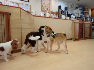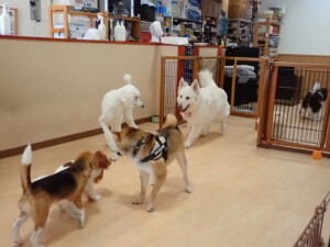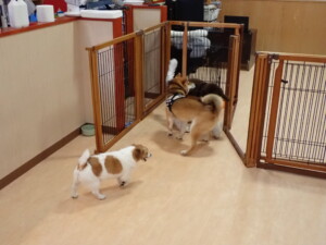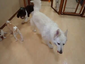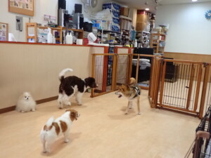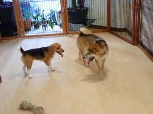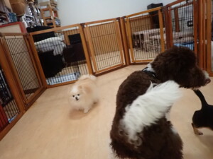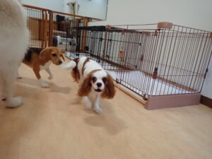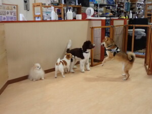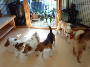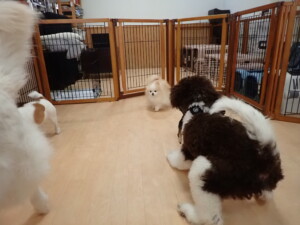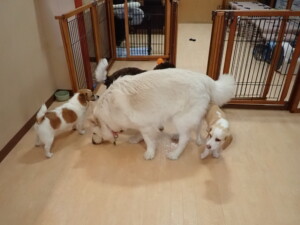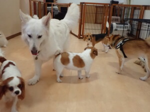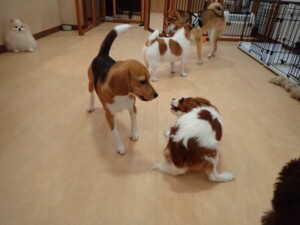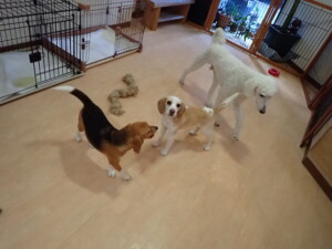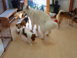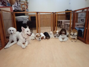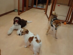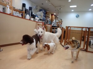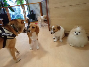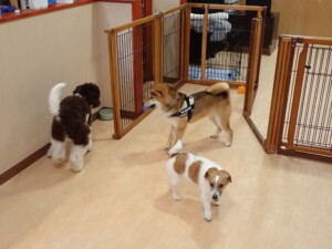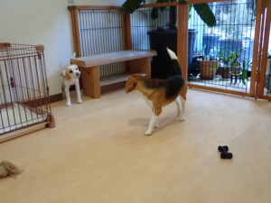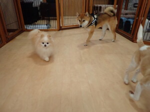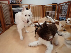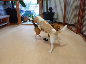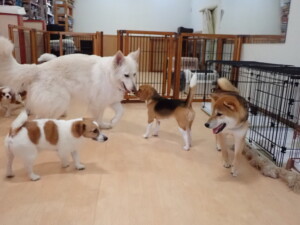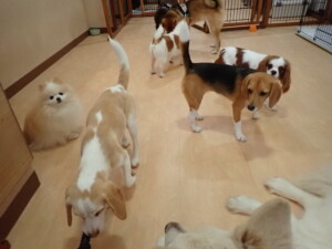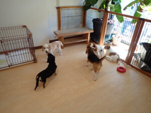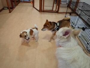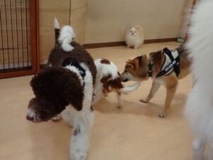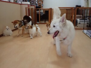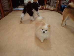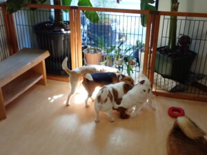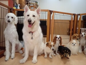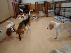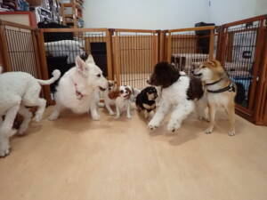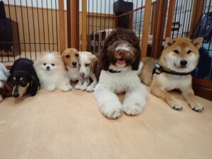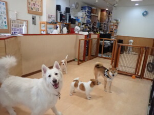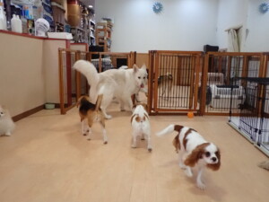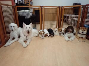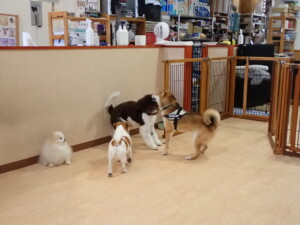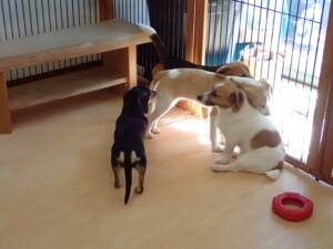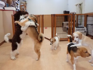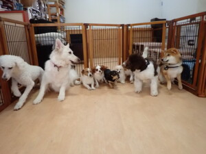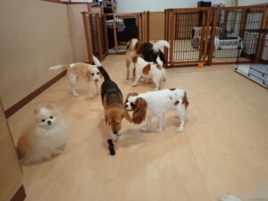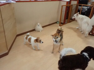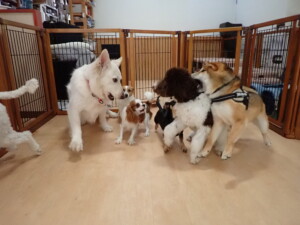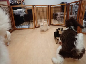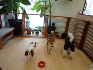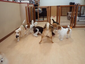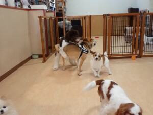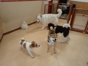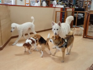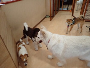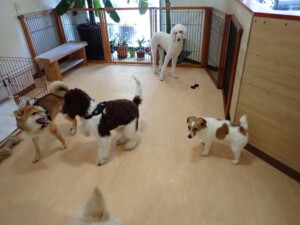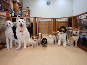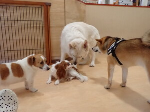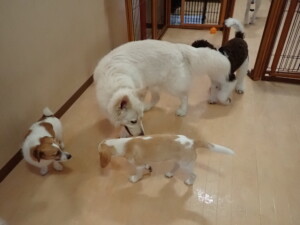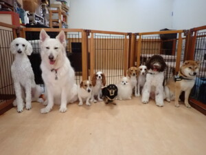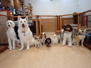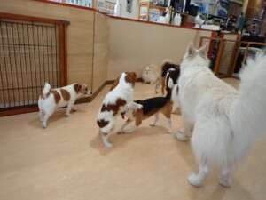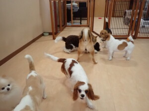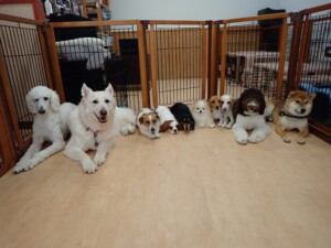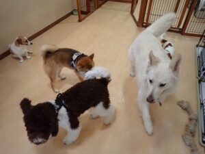 ふじまる君、はな子ちゃん、グーちゃん、むぎ君、寛大君、レオ君、ミアちゃん、モコちゃん、トイ君、みんな元気に遊んでいました。トイ君、「お座り」・「フセ」・「マテ」・「オイデ」の練習をしました。