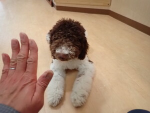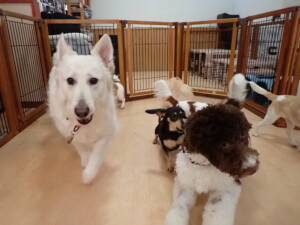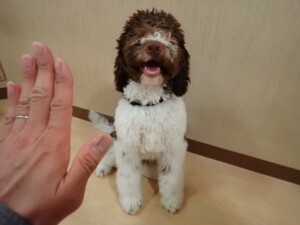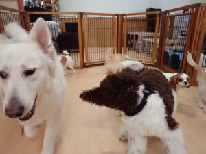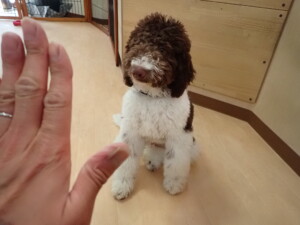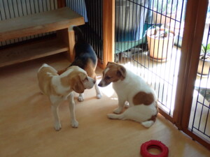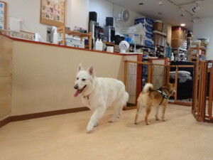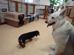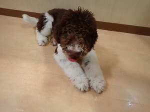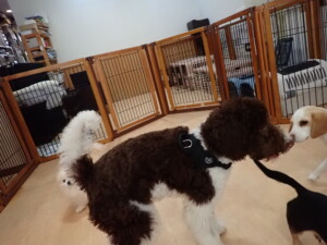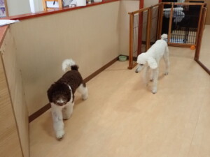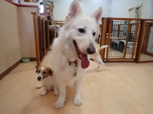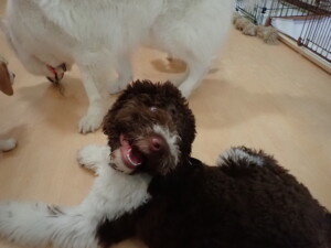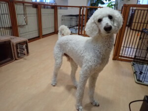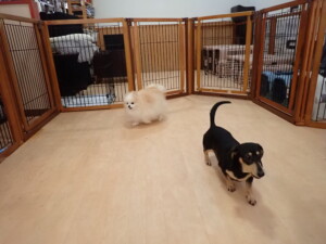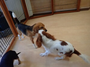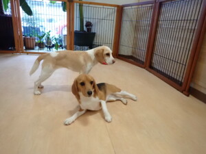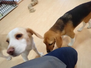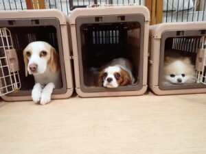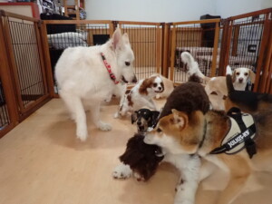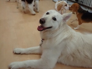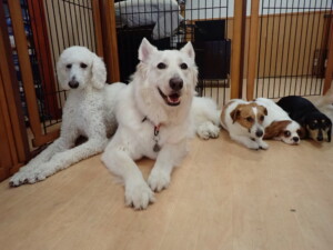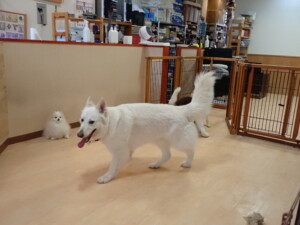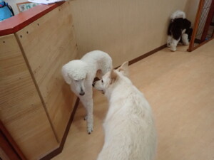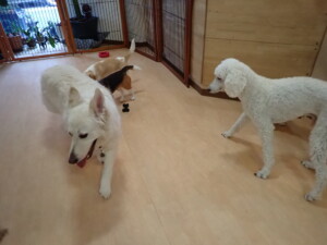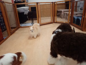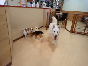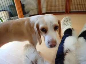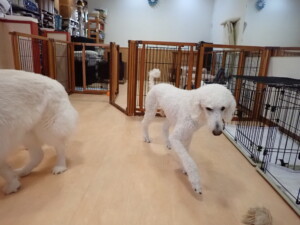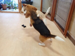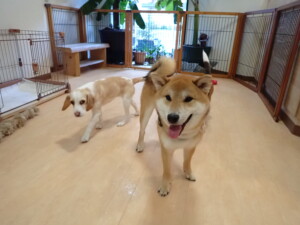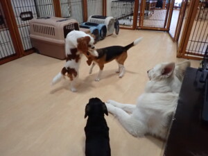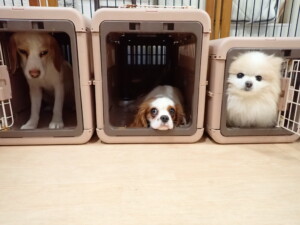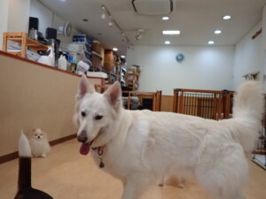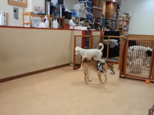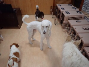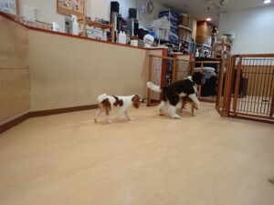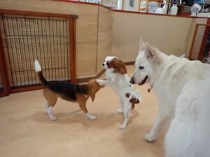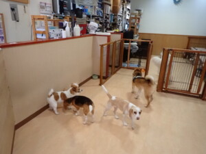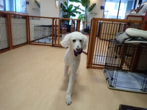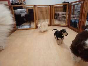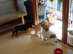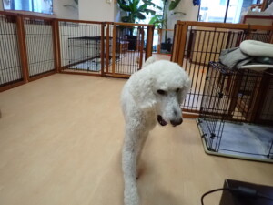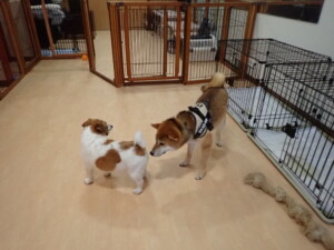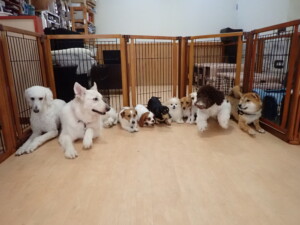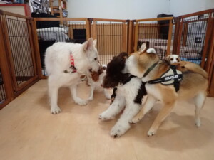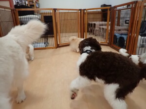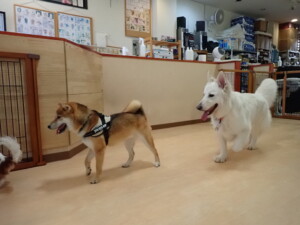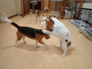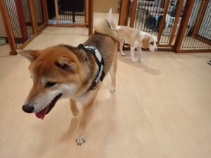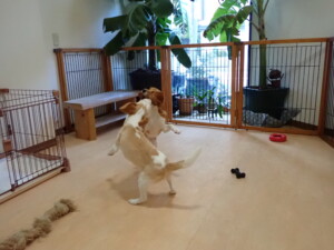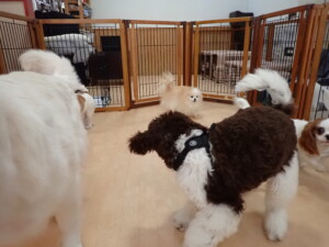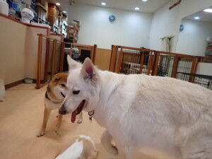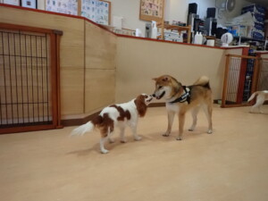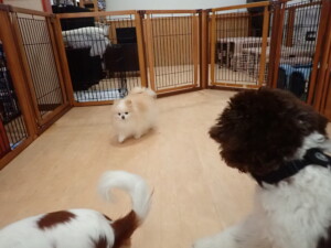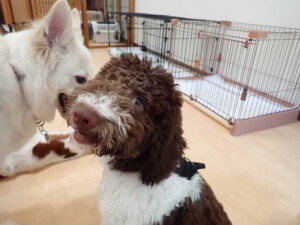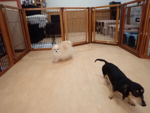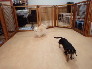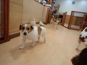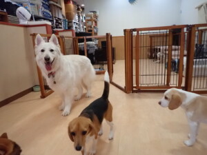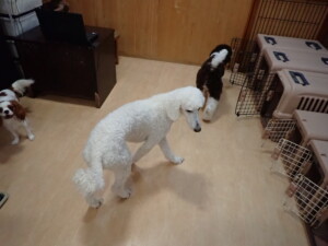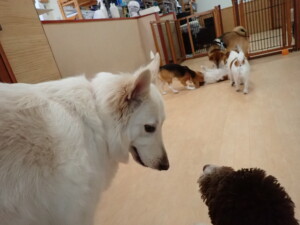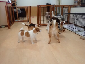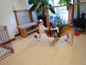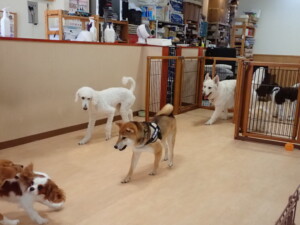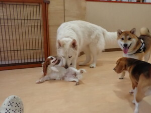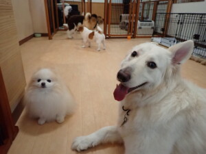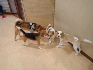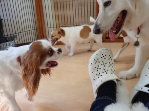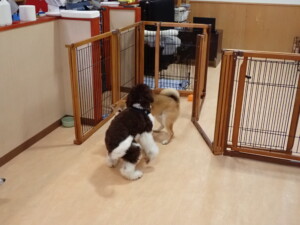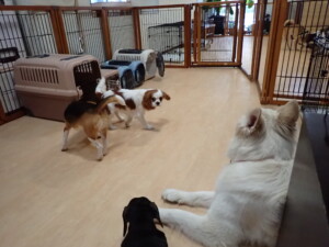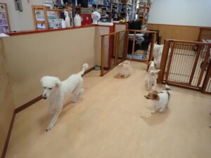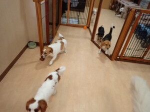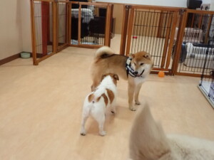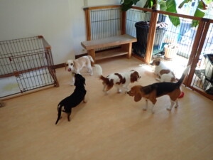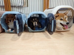 ふじまる君、はな子ちゃん、グーちゃん、むぎ君、寛大君、レオ君、ミアちゃん、モコちゃん、トイ君、みんな元気に遊んでいました。トイ君、「お座り」・「フセ」・「マテ」・「オイデ」の練習をしました。