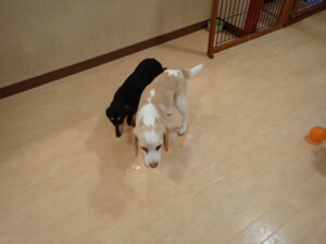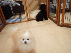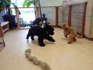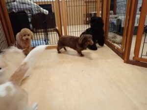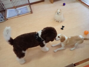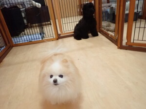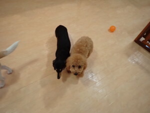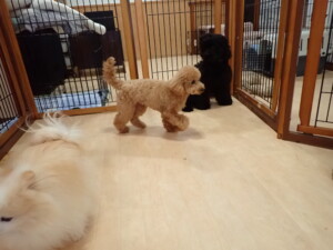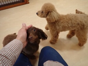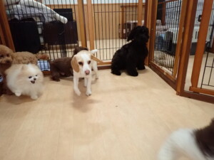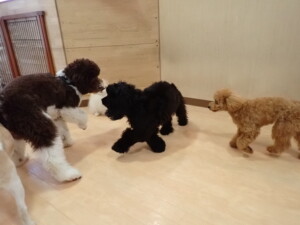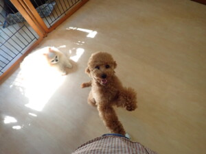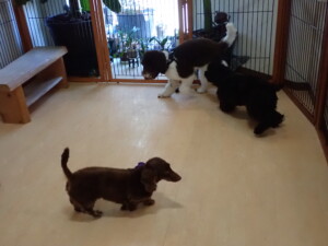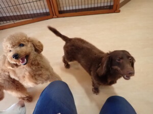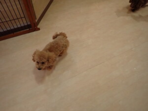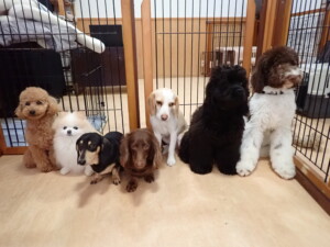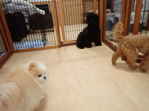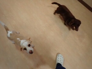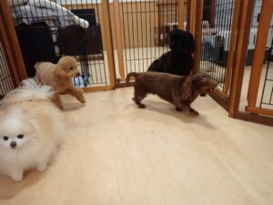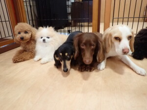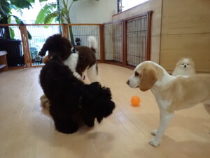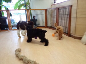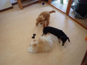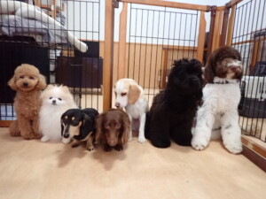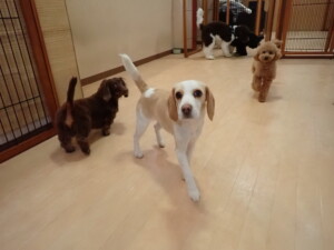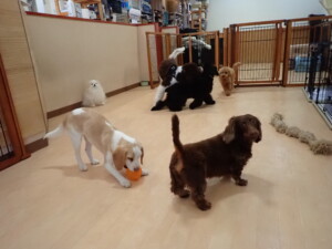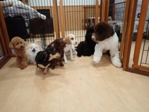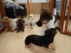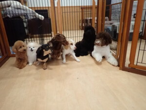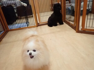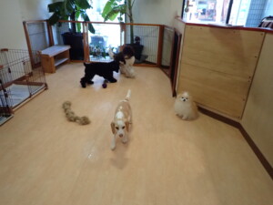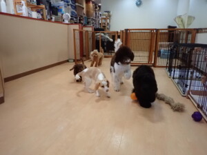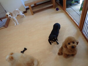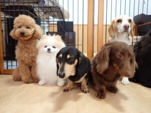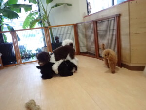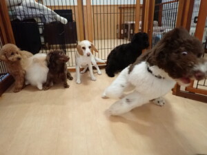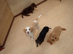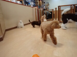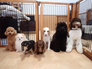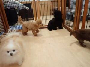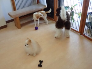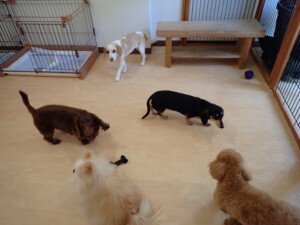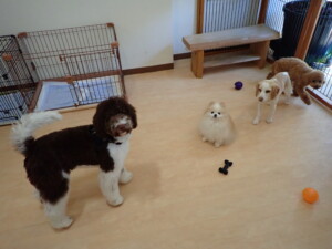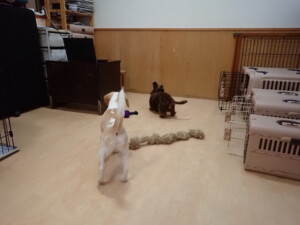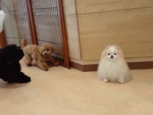 グーちゃん、じゃんぷ君、メリィちゃん、モコちゃん、キキ君、トイ君、元気に遊んでいました。キキ君、「お座り」・「マテ」の練習をしました。トイ君、「お座り」・「フセ」・「マテ」・「オイデ」・「ハウス」の練習をしました。