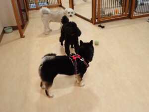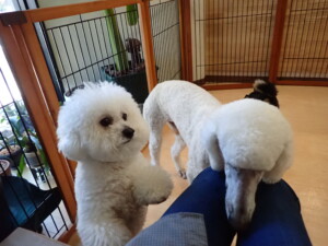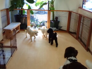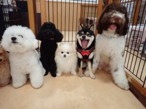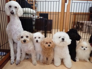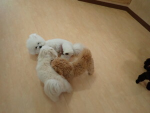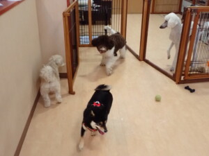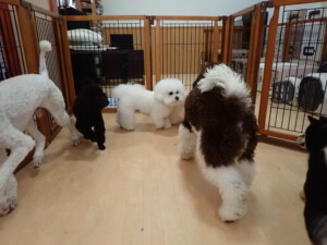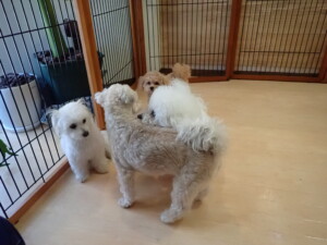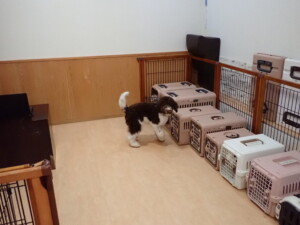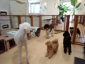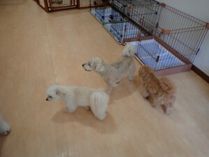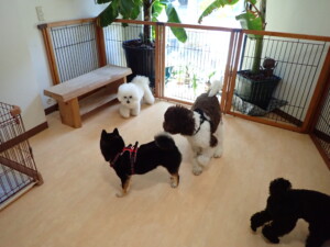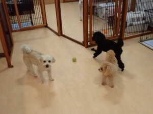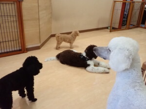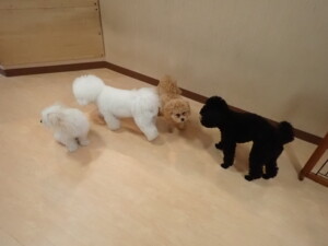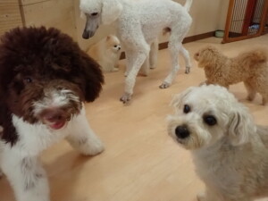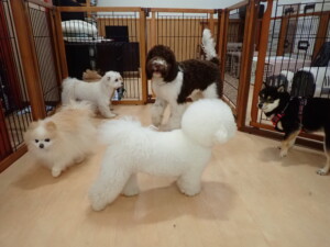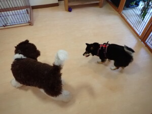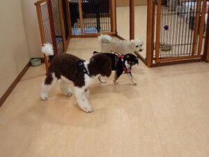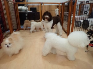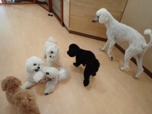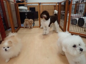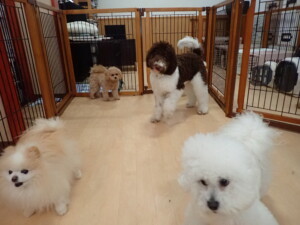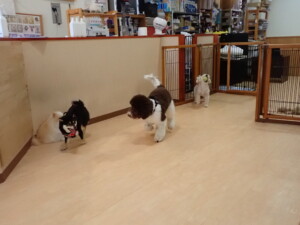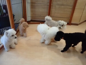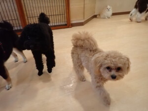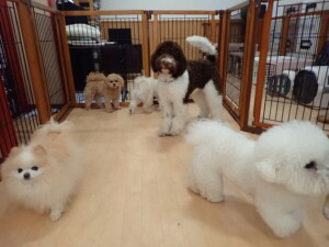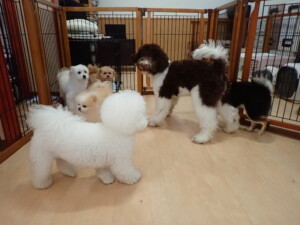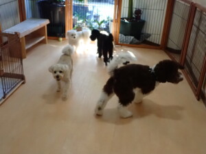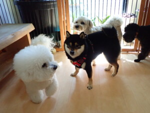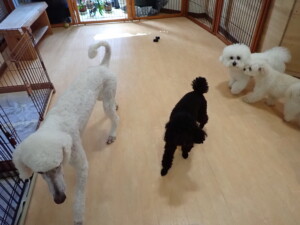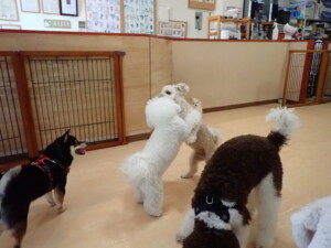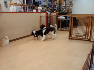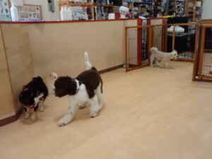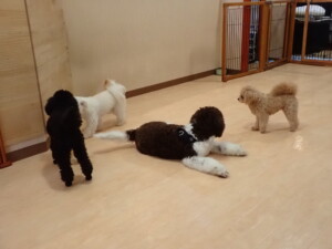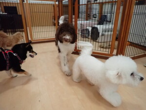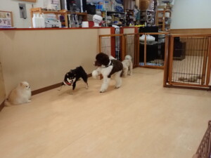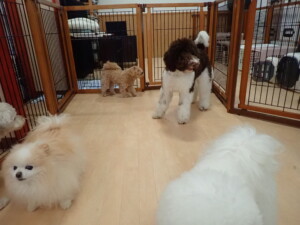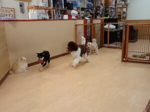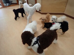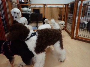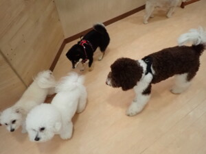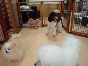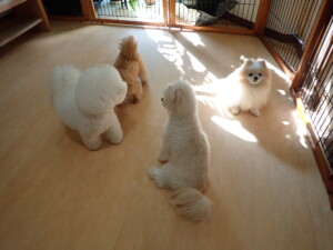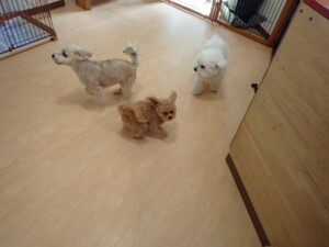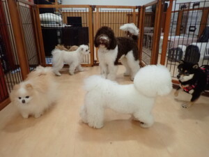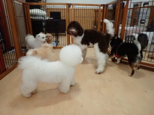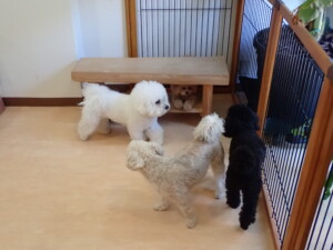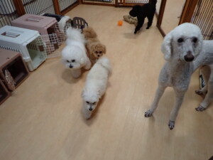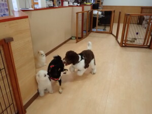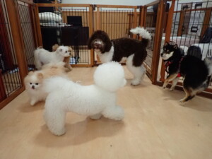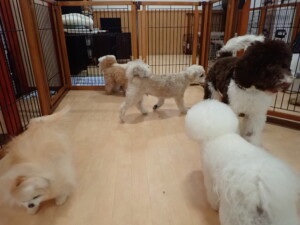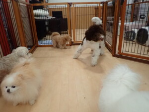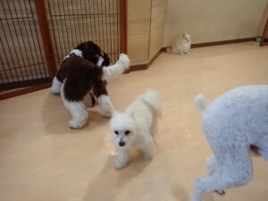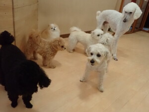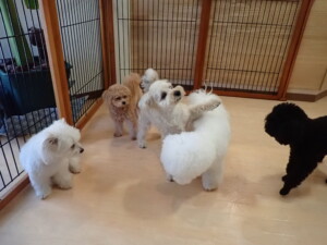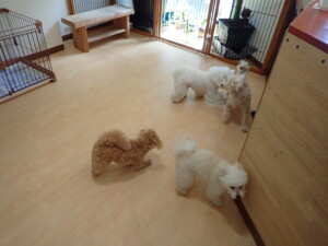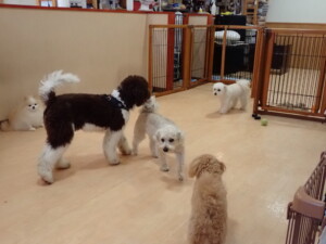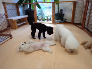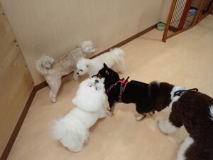 ムートン君、モコ君、ぴのちゃん、アメリちゃん、ふじまる君、こげ茶君、スズちゃん、トイ君、みんな元気に遊んでいました。トイ君、「お座り」・「フセ」・「マテ」・「オイデ」・「ハウス」の練習をしました。