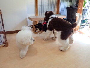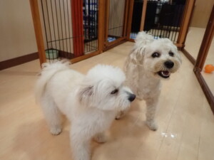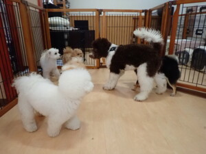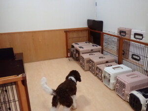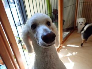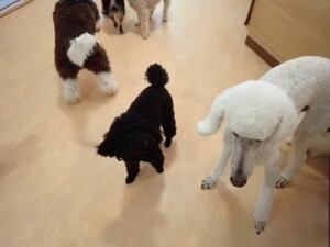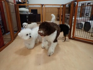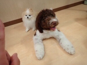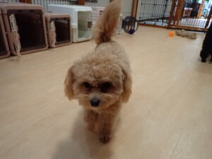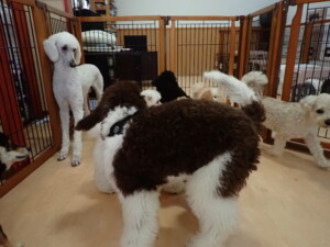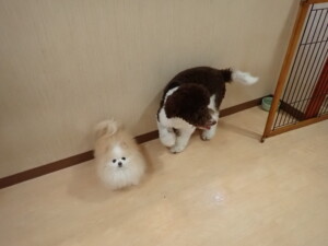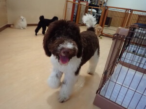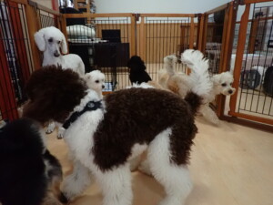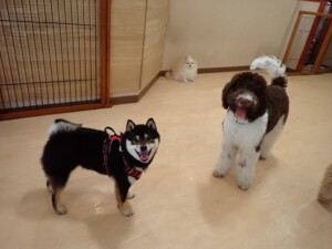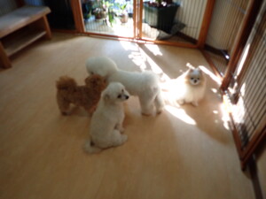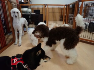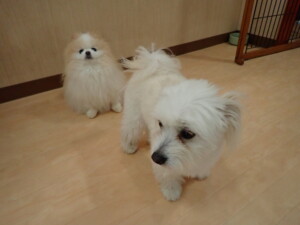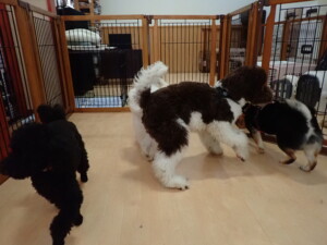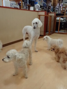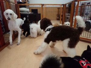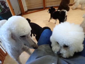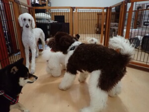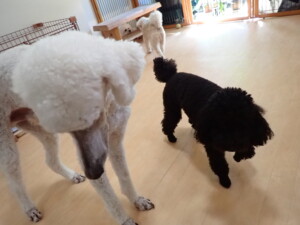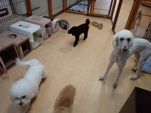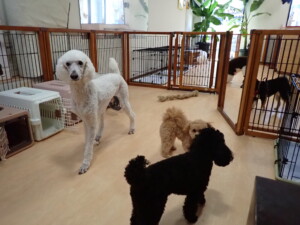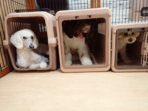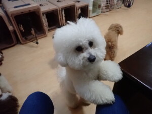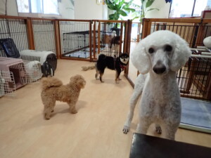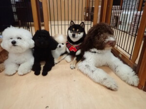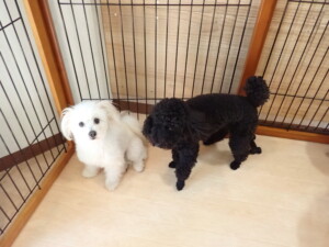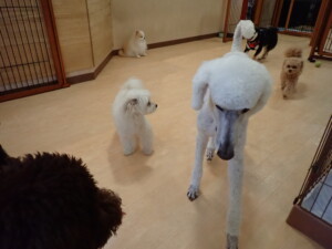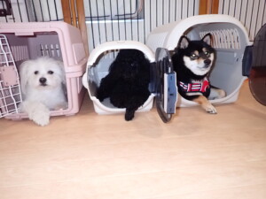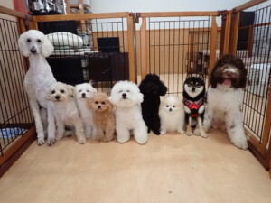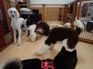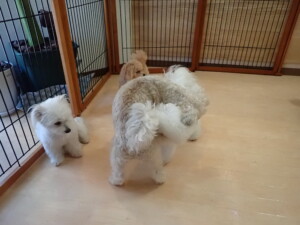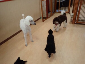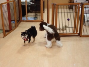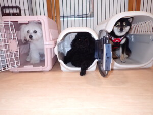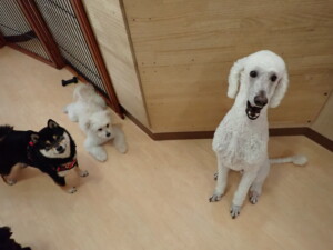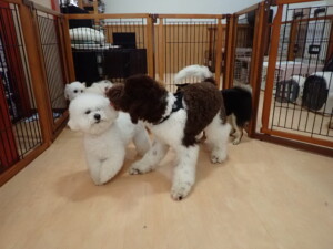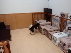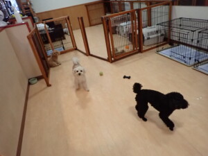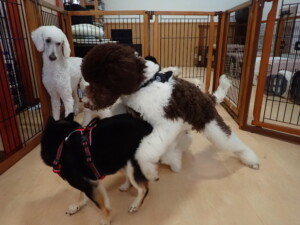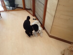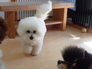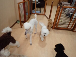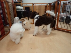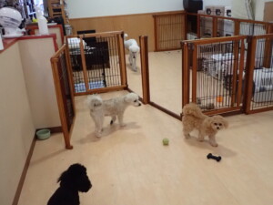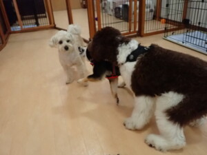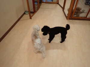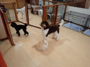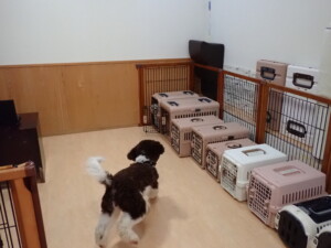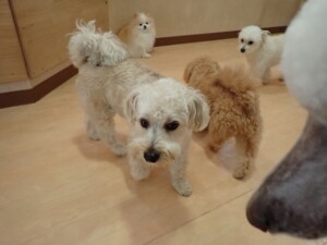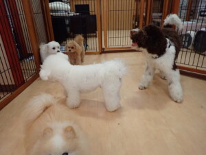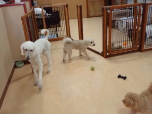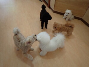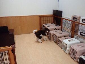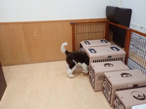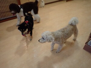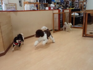 ムートン君、モコ君、ぴのちゃん、アメリちゃん、ふじまる君、こげ茶君、スズちゃん、トイ君、みんな元気に遊んでいました。トイ君、「お座り」・「フセ」・「マテ」・「オイデ」・「ハウス」の練習をしました。