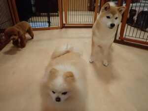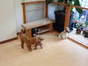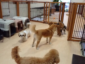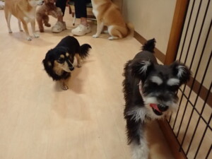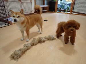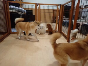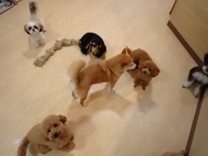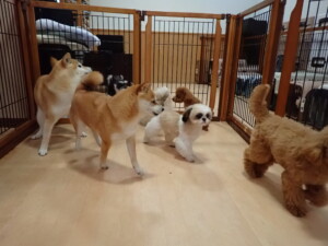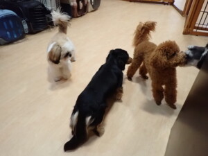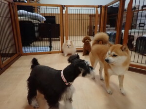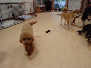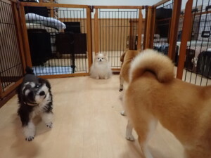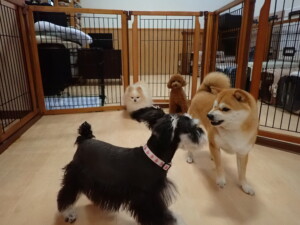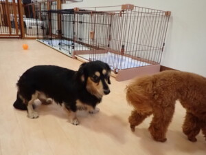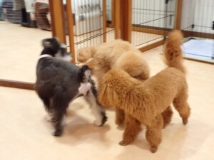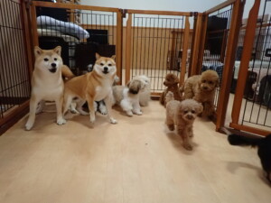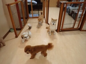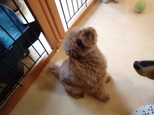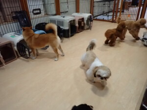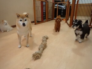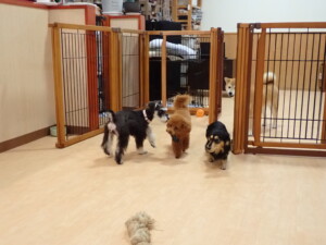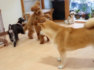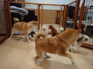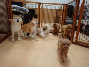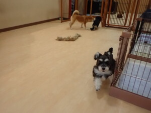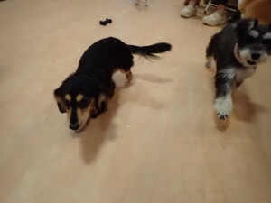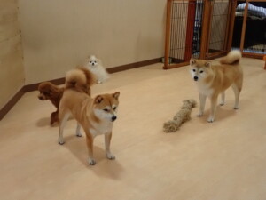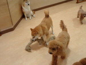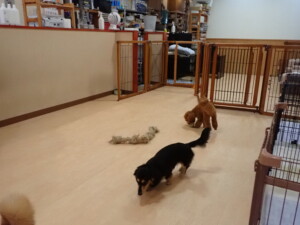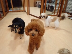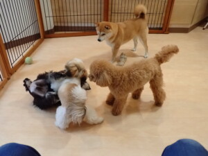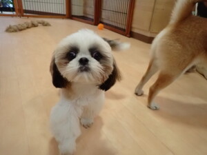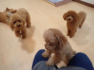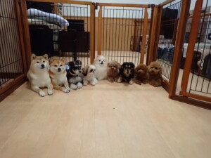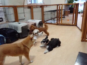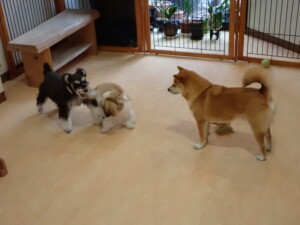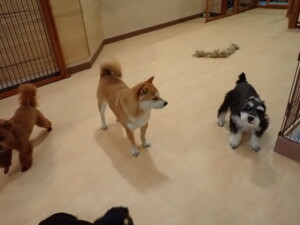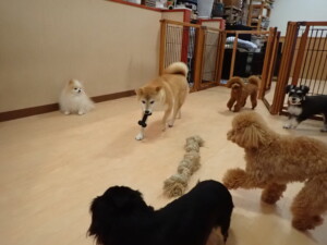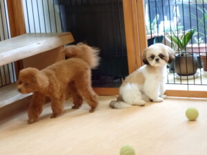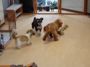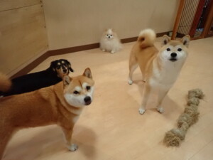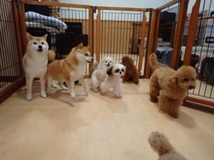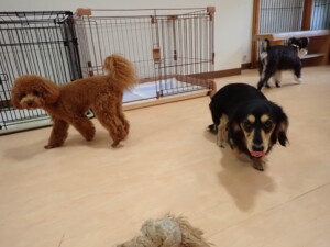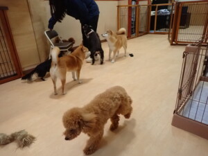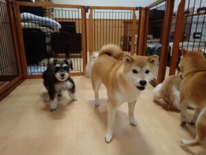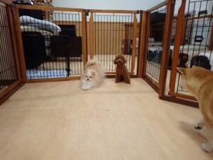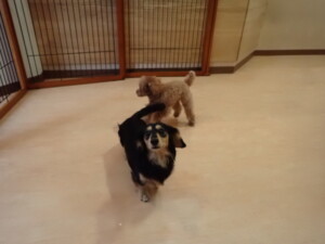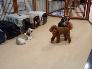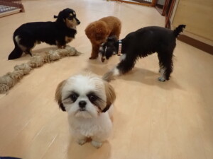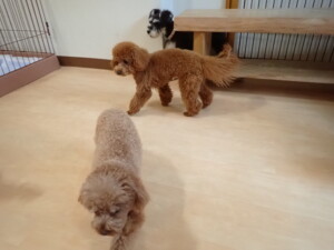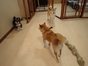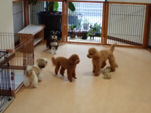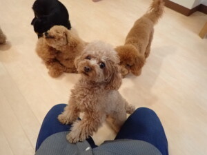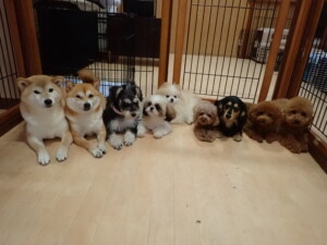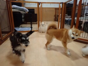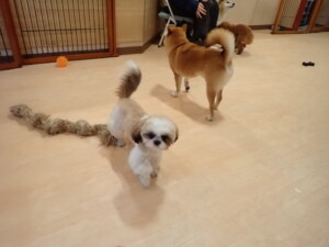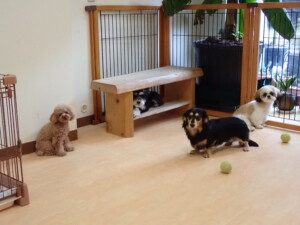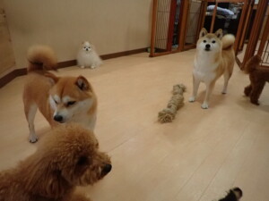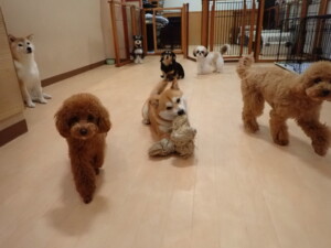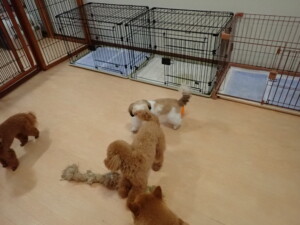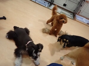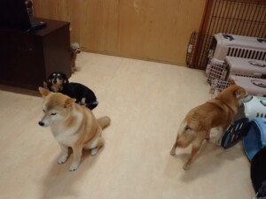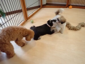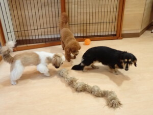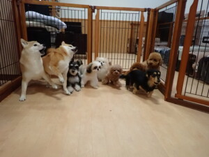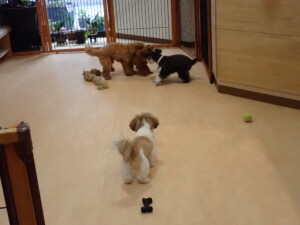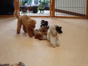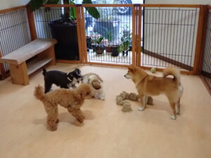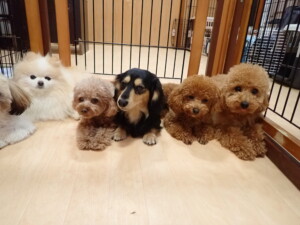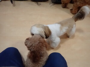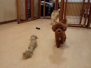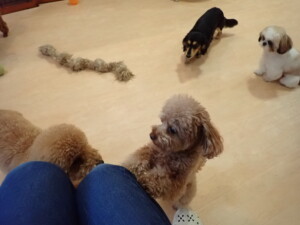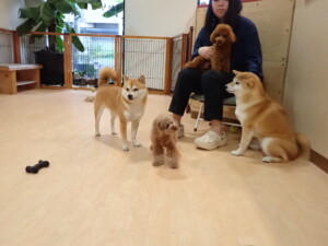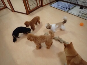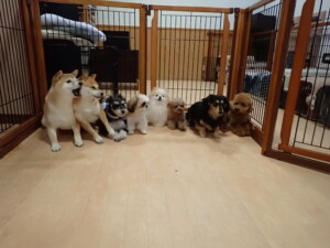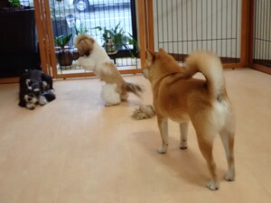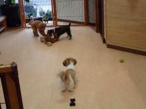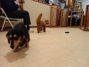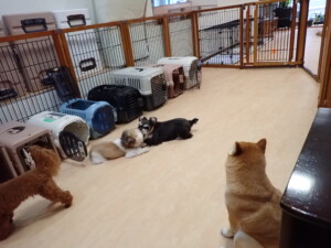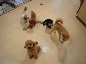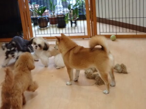 モコ君、だんご君、まる君、紅葉ちゃん、メリィちゃん、、種ちゃん、タムちゃん、元気に遊んでいました。チャロちゃん、落ち着いて過ごしていました。種ちゃんとタムちゃん、「お座り」・「フセ」・「マテ」の練習をしました。