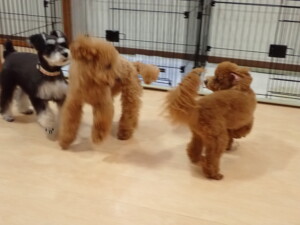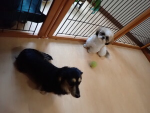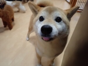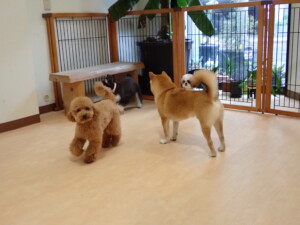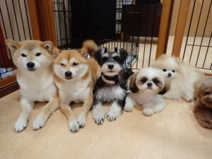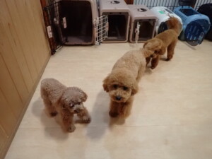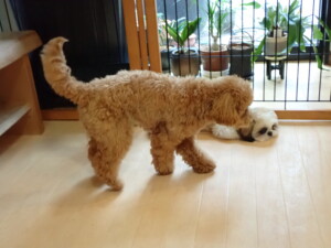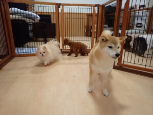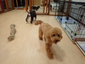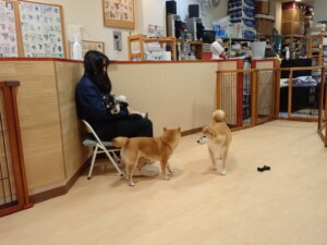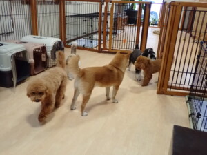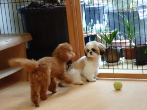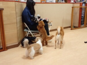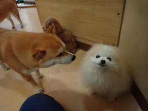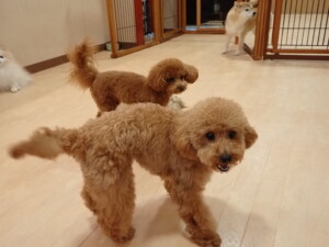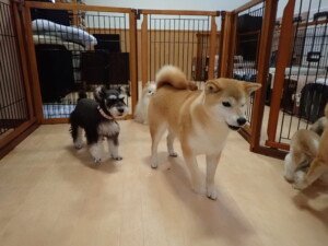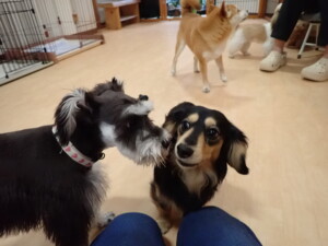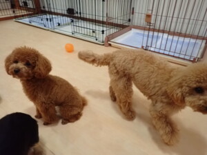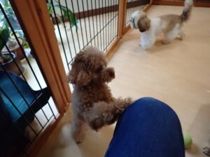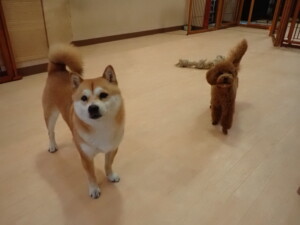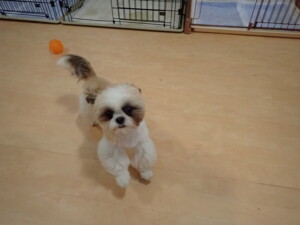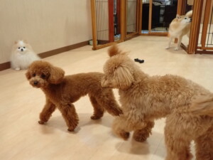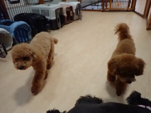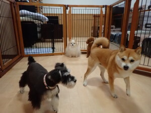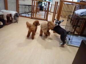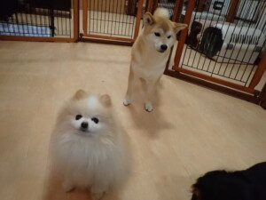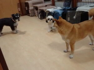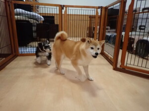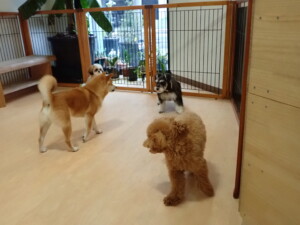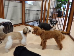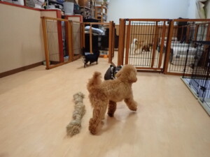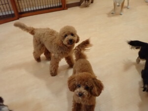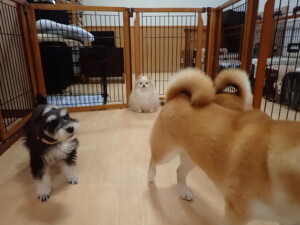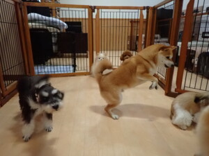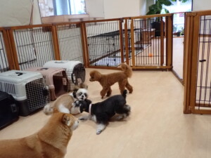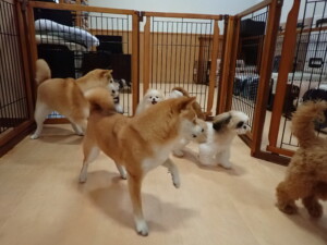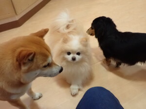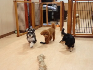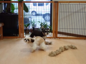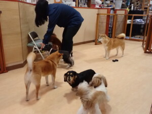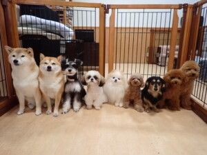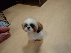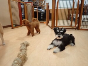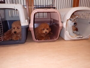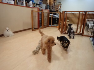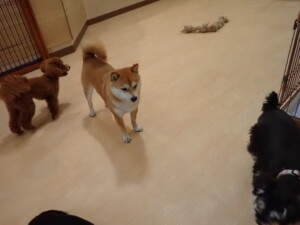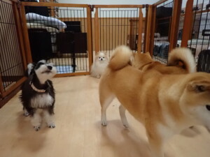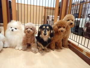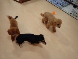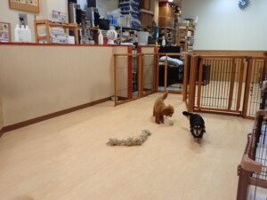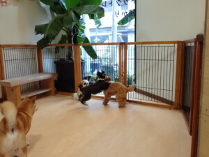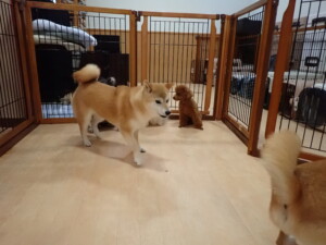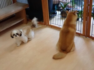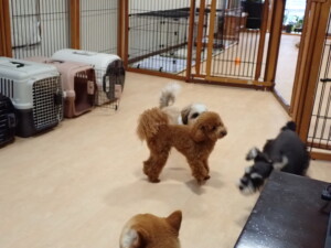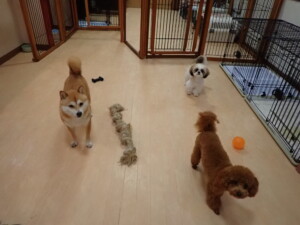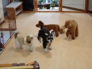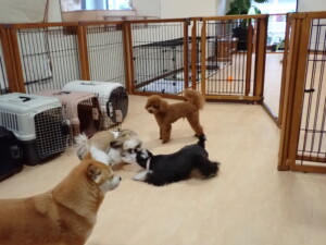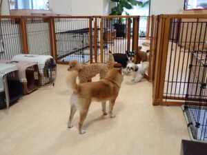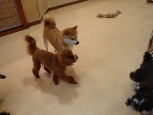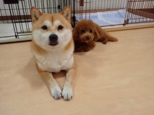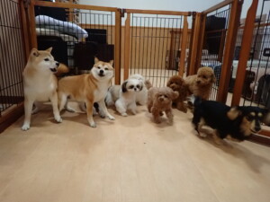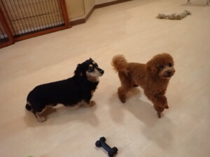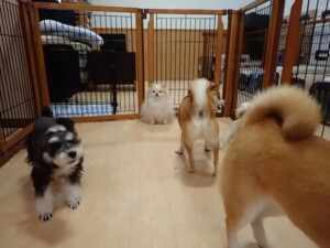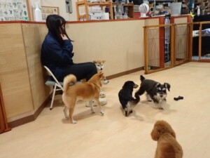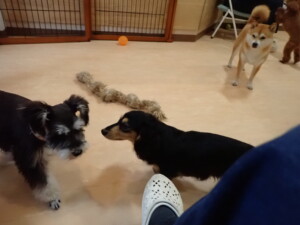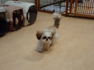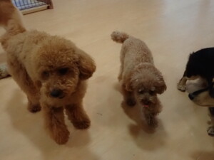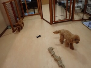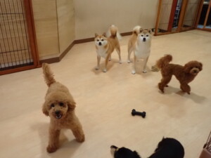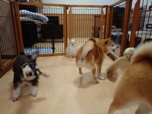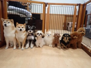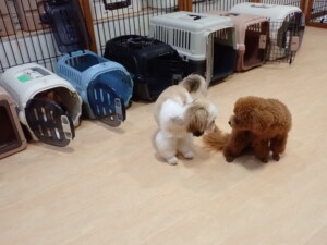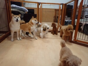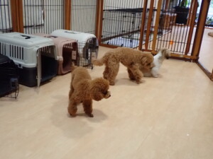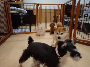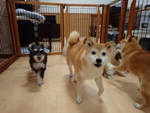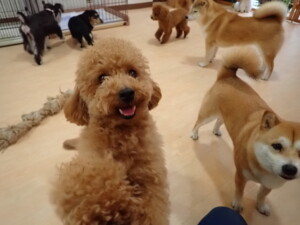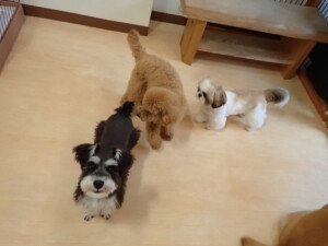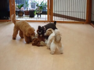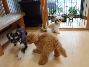 モコ君、だんご君、まる君、紅葉ちゃん、メリィちゃん、、種ちゃん、タムちゃん、元気に遊んでいました。チャロちゃん、落ち着いて過ごしていました。種ちゃんとタムちゃん、「お座り」・「フセ」・「マテ」の練習をしました。