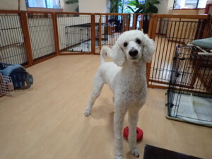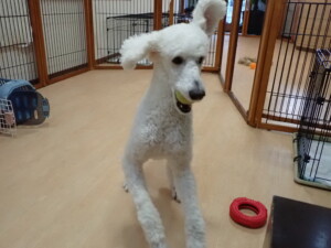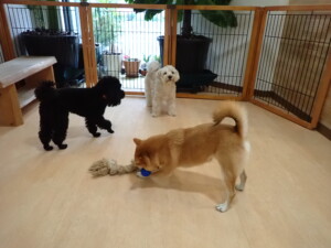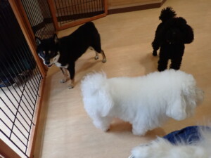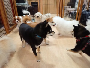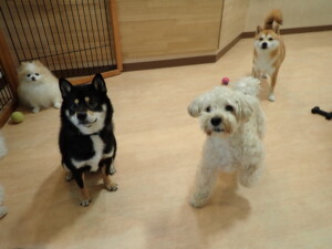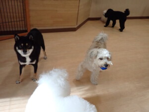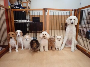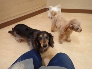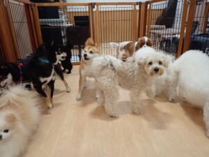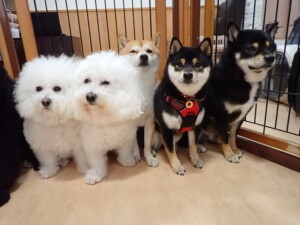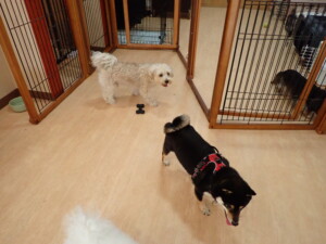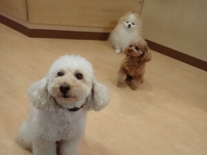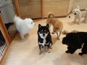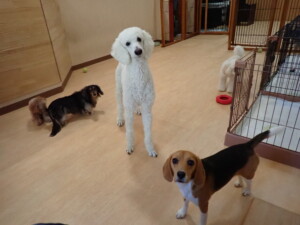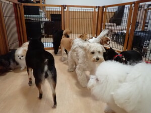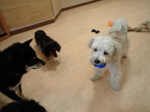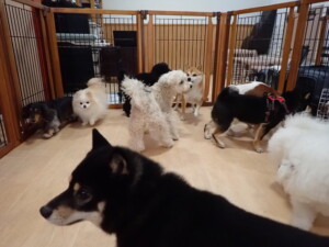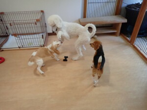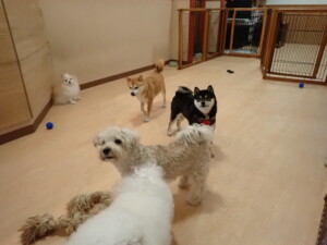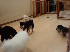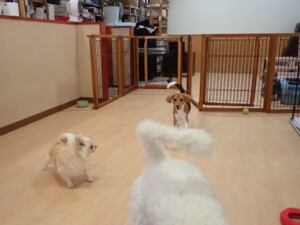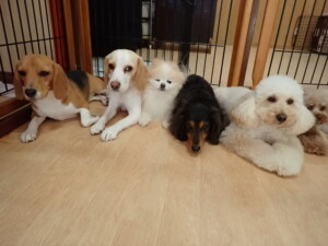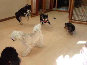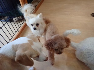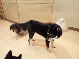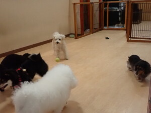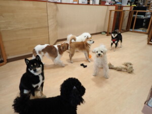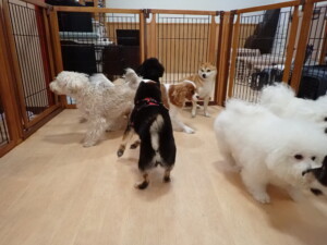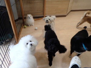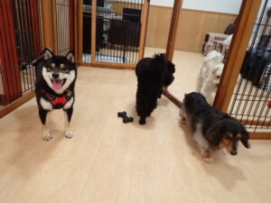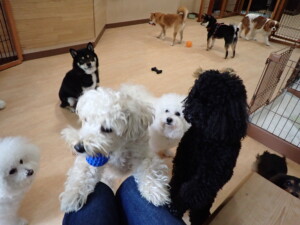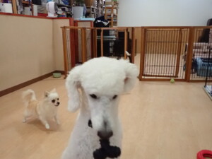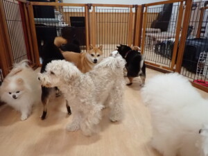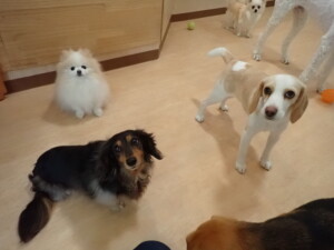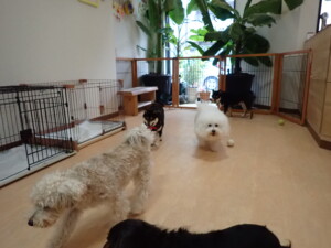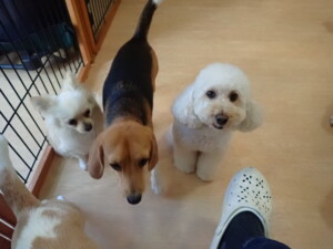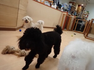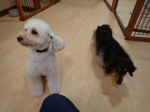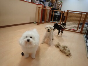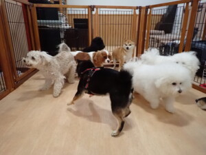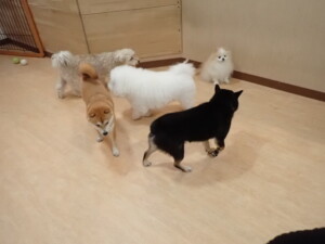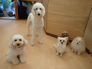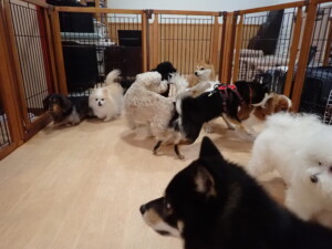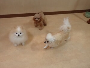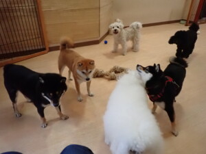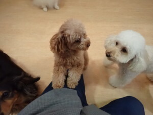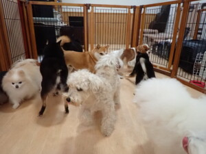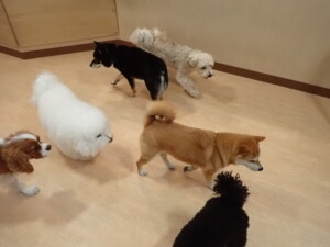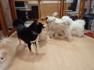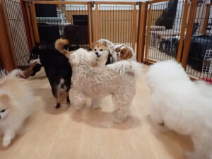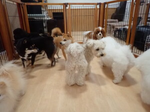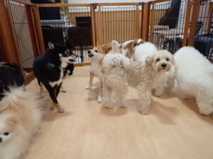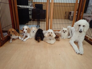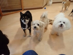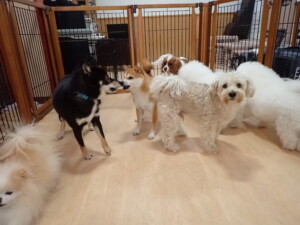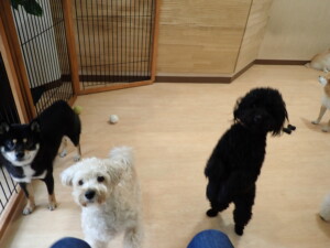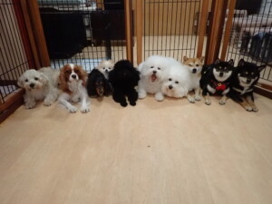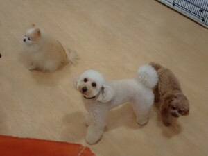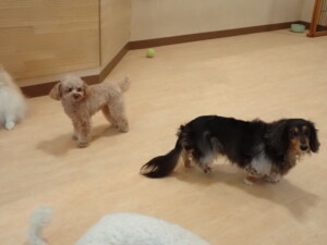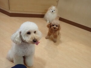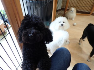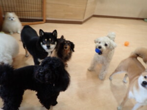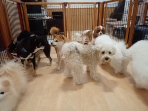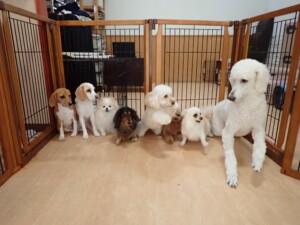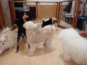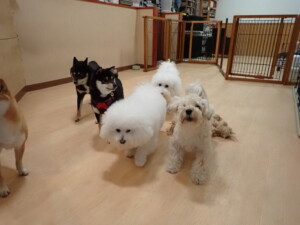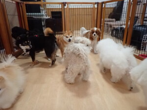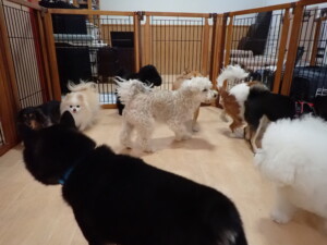 トイプードルのモモちゃん、さくらこちゃん、まる君、落ち着いて過ごしていました。ふじまる君、グーちゃん、じゃんぷ君、ミニチュアシュナウザーのももちゃん、あずきちゃん、むぎ君、寛大君、だんご君、ちいこちゃん、メリィちゃん、ポコ君、元気に遊んでいました。ポコ君、「お座り・「フセ」・「マテ」・「オイデ」の練習をしました。