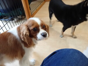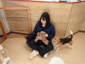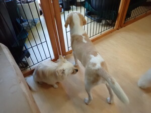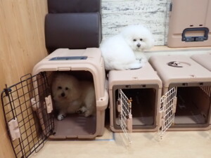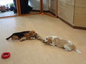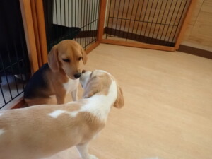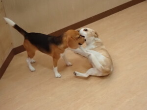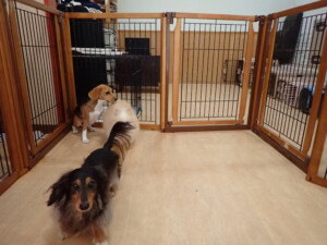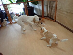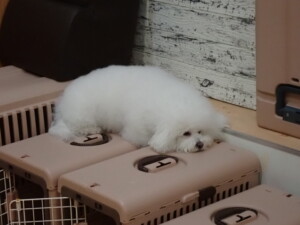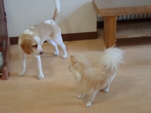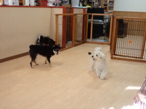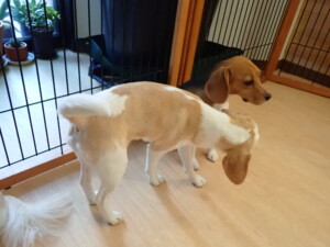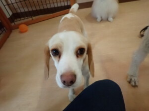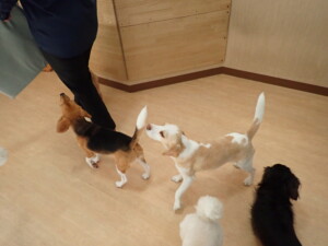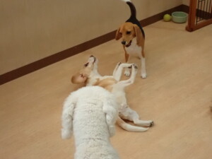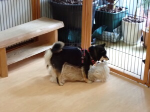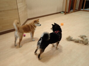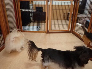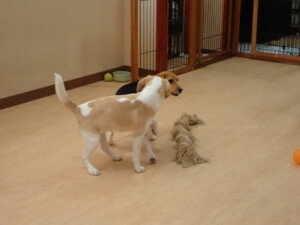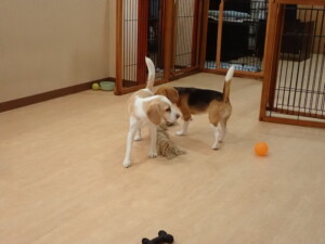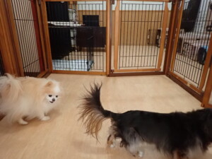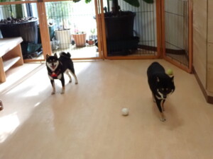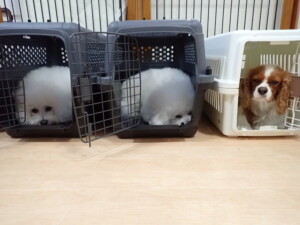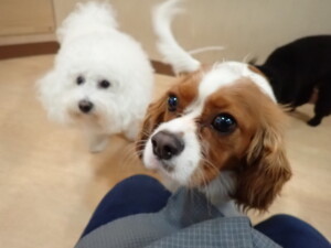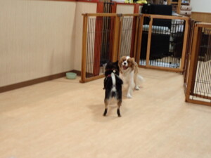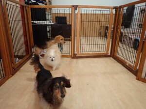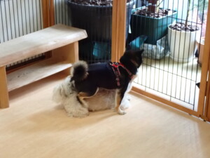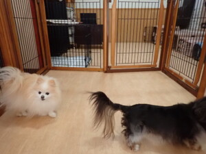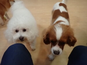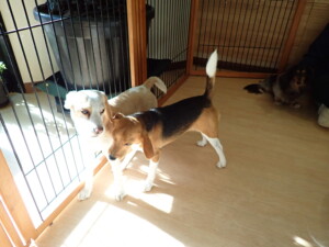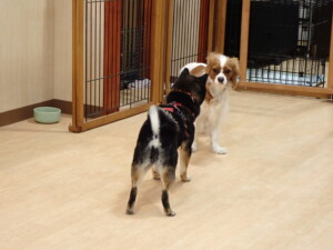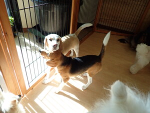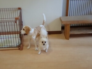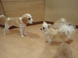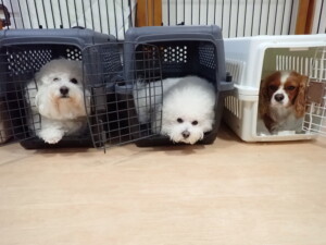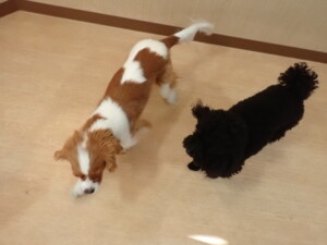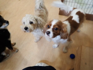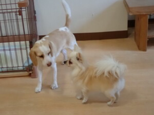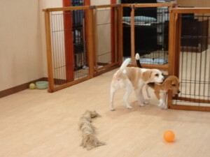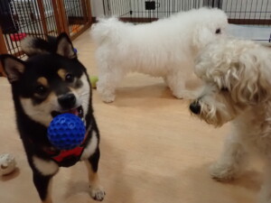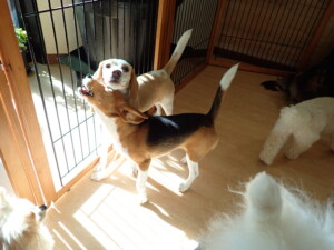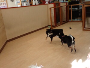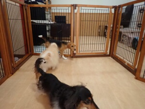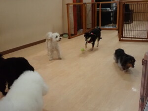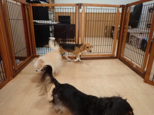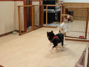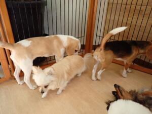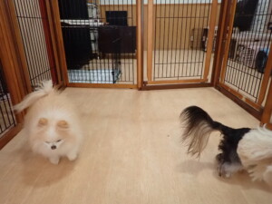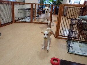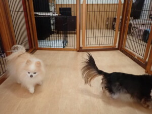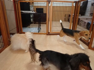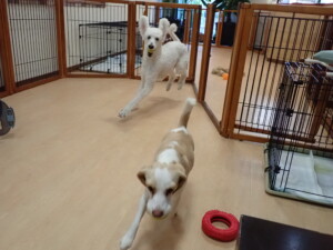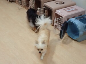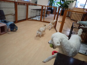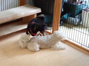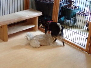モモちゃんとこころちゃん、落ち着いて過ごしていました。ふじまる君、だんご君、ハルちゃん、モコ君、ミアちゃん、元気に遊んでいました。モコ君、「お座り」・「マテ」の練習をしました。ミアちゃん、「お座り・「フセ」・「マテ」・「オイデ」・「ハウス」の練習をしました。