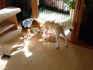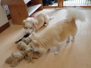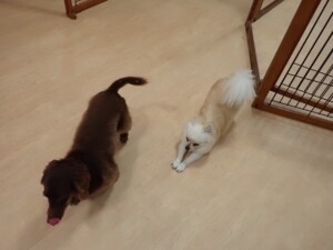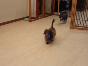 紅葉ちゃんと卯月ちゃん、落ち着いて過ごしていました。グーちゃん、ジャズ君、ミアちゃん、元気に遊んでいました。ミアちゃん、「お座り」・「フセ」・「マテ」の練習をしました。