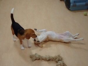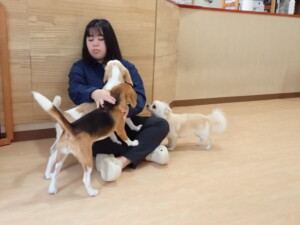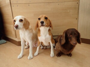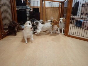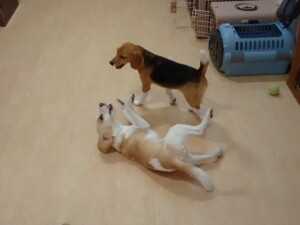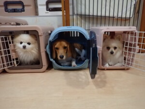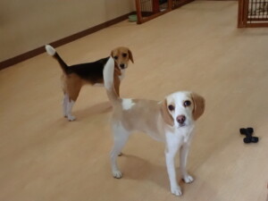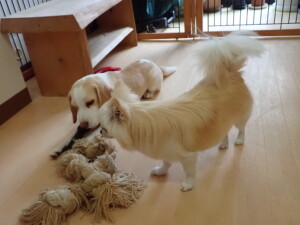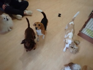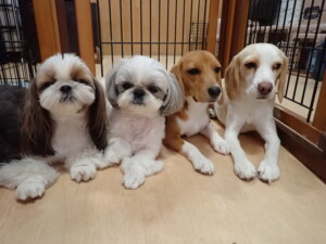はな子ちゃん、グーちゃん、じゃんぷ君、ミルちゃん、ももちゃん、元気に遊んでいました。あさがおちゃんとひまわりちゃん、落ち着いて過ごしていました。ももちゃん、「お座り」・「フセ」・「マテ」・「オイデ」の練習をしました。