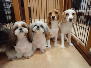 今日はアビーちゃん、ハルちゃん、はな子ちゃん、チャロちゃんが遊びに来てくれました。そして、ももちゃんとミアちゃんがトレーニングに来てくれました