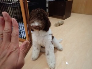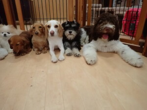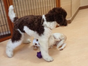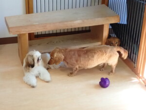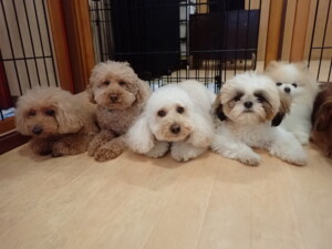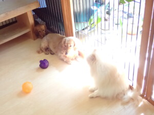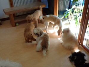 だんご君、モコ君、ぴのちゃん、グーちゃん、三瑚君、ソナちゃん、種ちゃん、元気に遊んでいました。二瑚ちゃん、落ち着いて過ごしていました。種ちゃん、「お座り」・「フセ」・「マテ」の練習をしました。